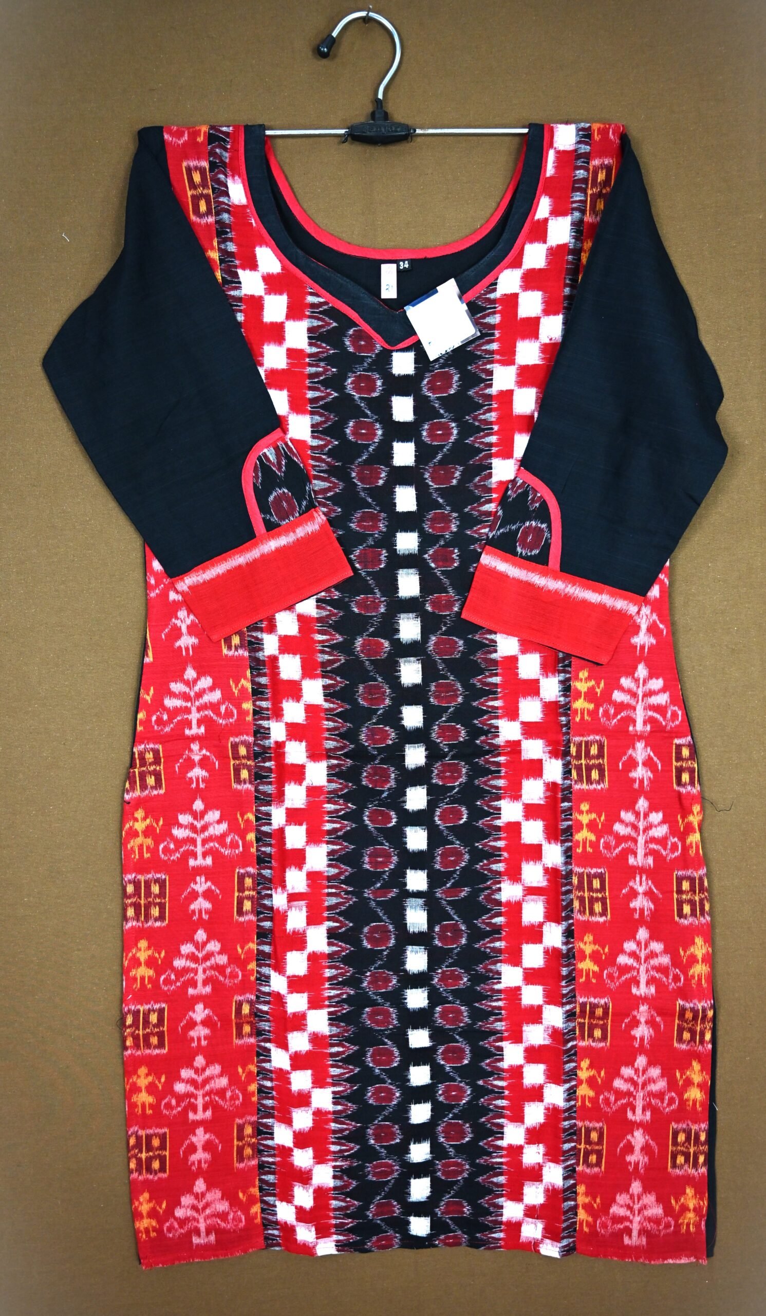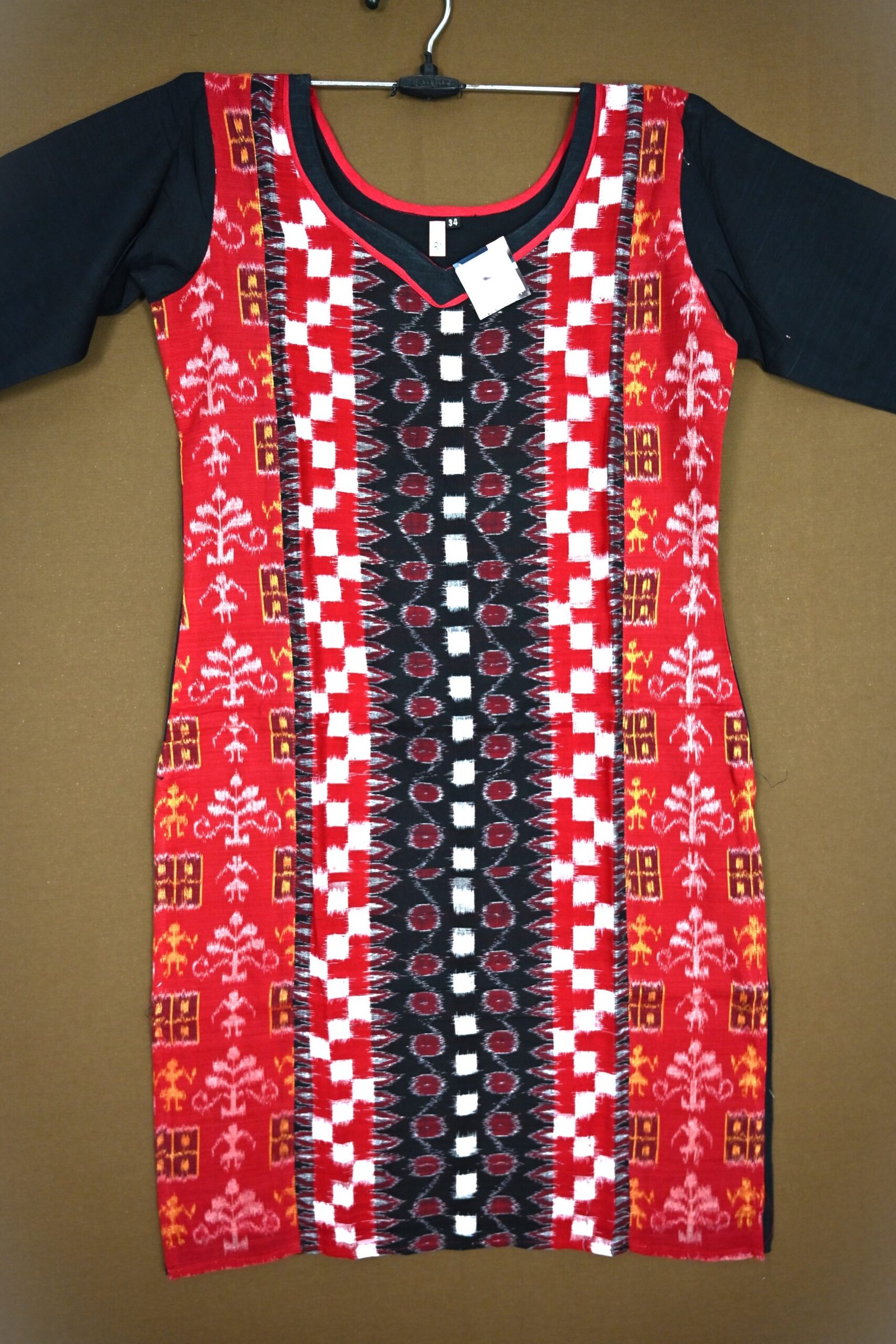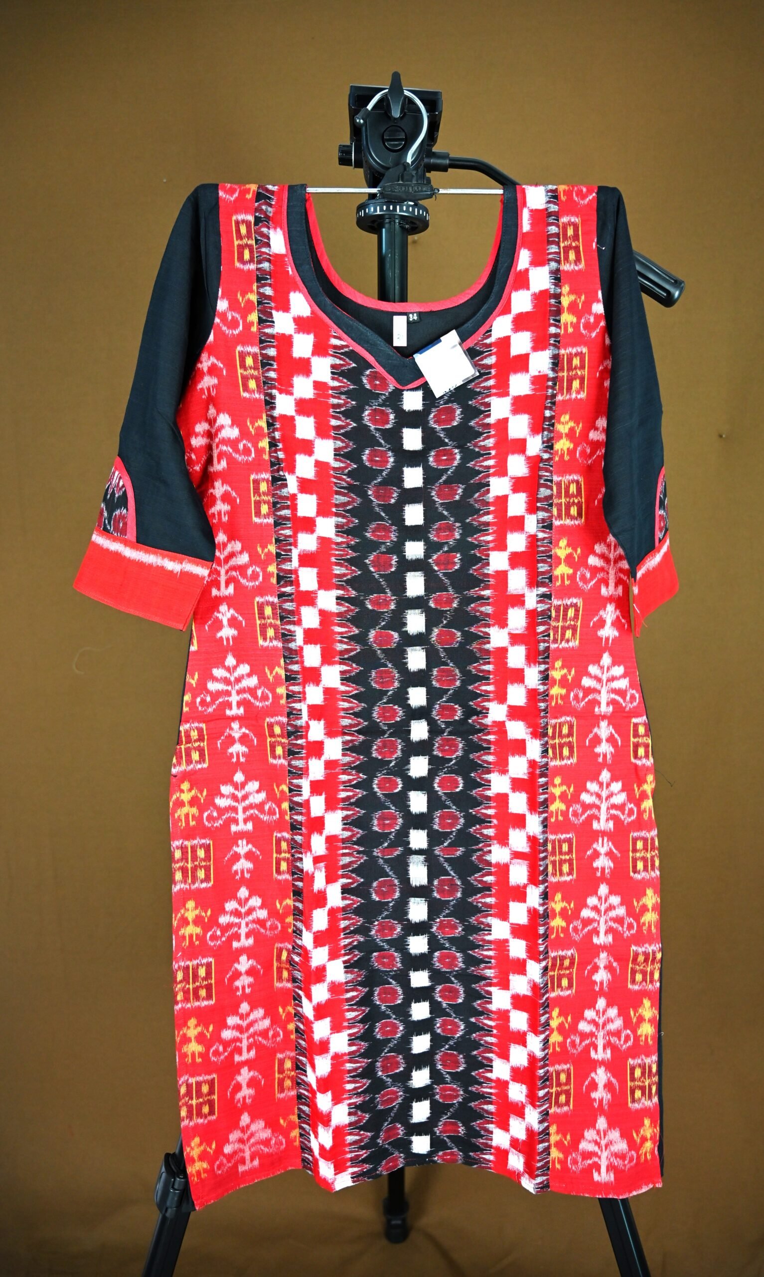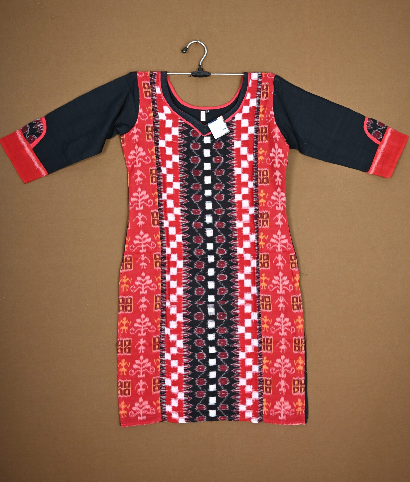 This Kurti blends bold ethnic artistry with a modern silhouette. The central black panel bursts with white square motifs framed by red diamond shapes, giving a sense of rhythmic symmetry. On each side, vivid red fabric carries mustard and white Ikat-inspired patterns that add warmth and cultural depth. The black three-quarter sleeves break the color flow for a crisp contrast, while the red cuffs echo the body’s motifs, tying the whole look together. A rounded-V neckline with red piping completes the design, making it both eye-catching and wearable.