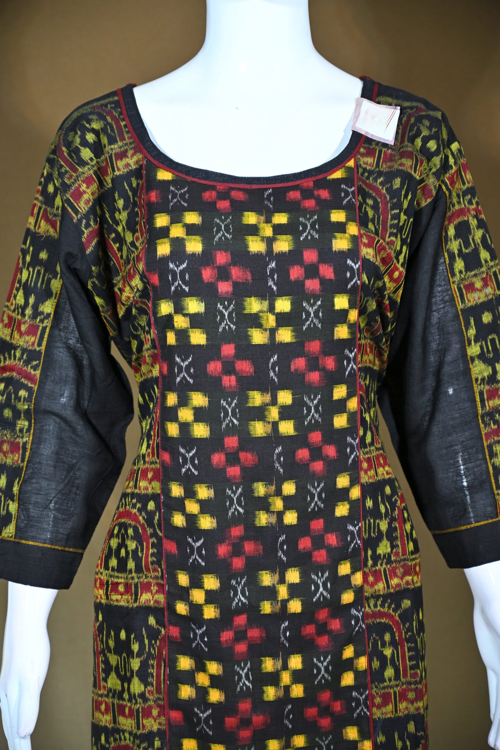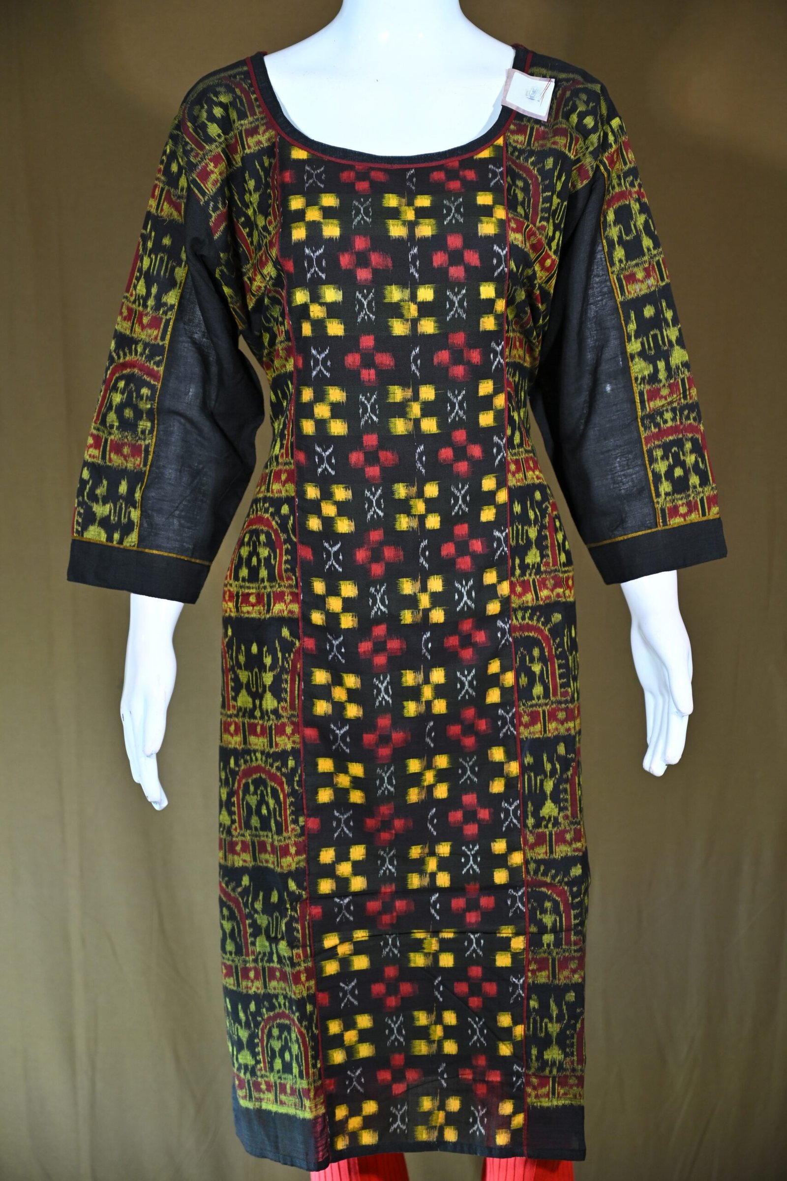 This Sambalpuri cotton kurti features a rich and traditional colour palette and intricate handwoven design: