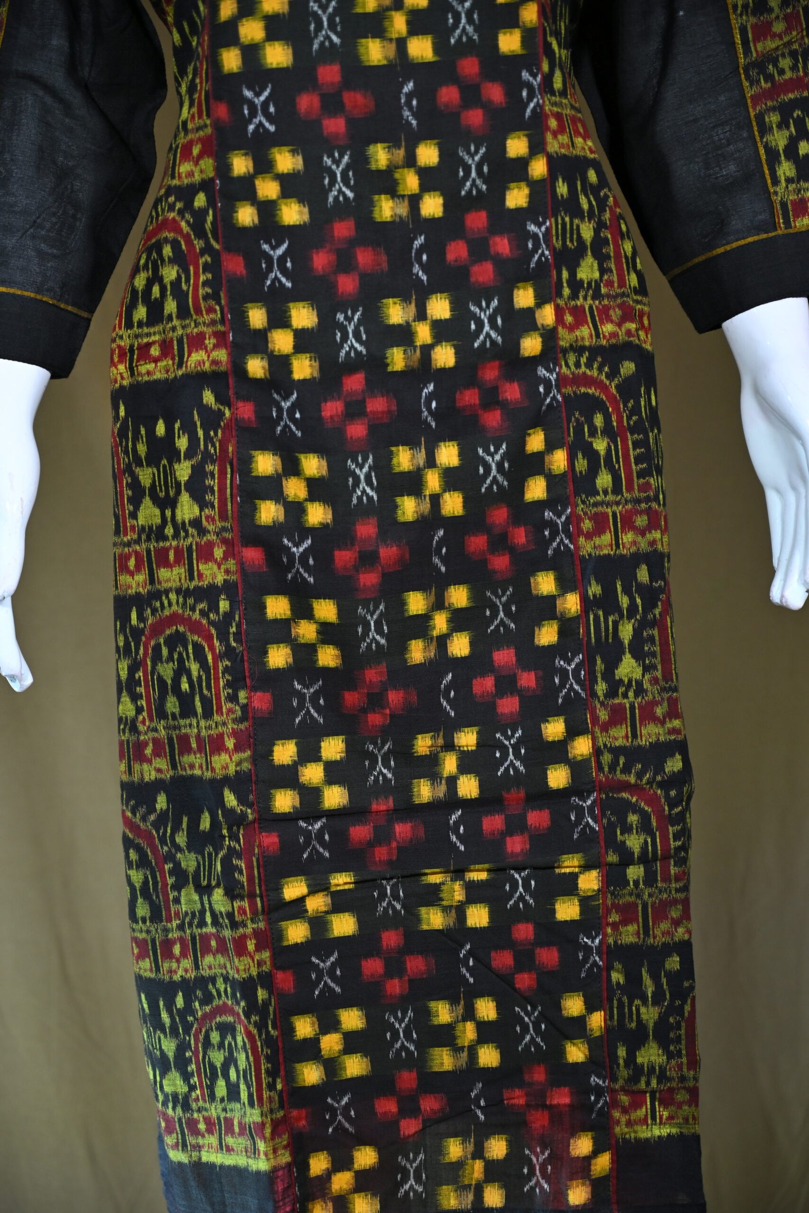 Overall Design Style: Traditional Sambalpuri ikat weaving with a mix of symbolic motifs and geometric patterns, balancing heritage artistry with a modern kurti silhouette.