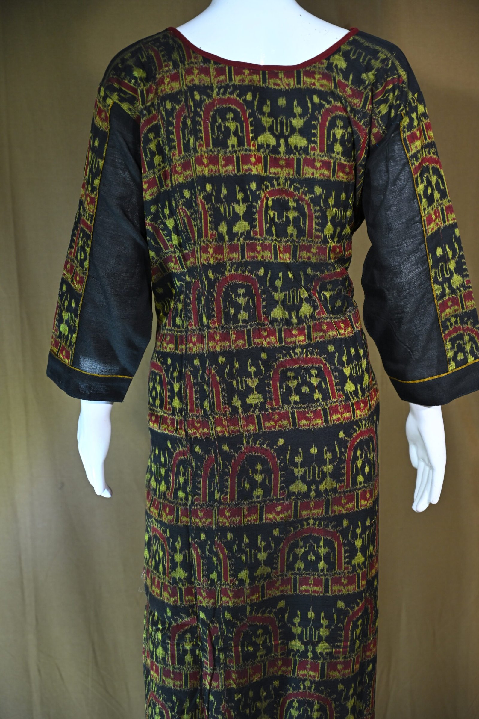 Central Panel: Decorated with geometric ikat motifs in bright yellow, deep red, and white, arranged in a repeating grid pattern, adding vibrancy.