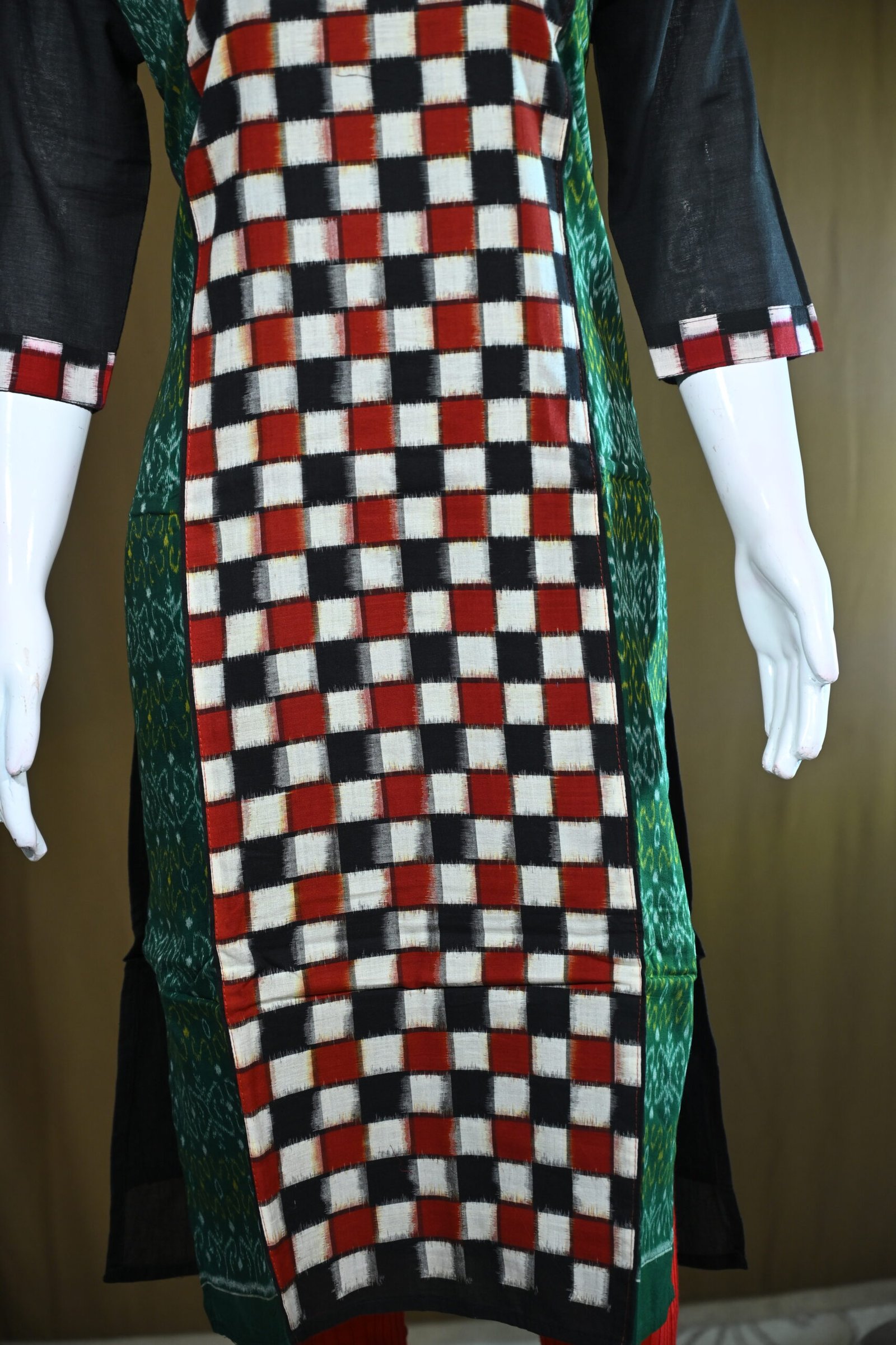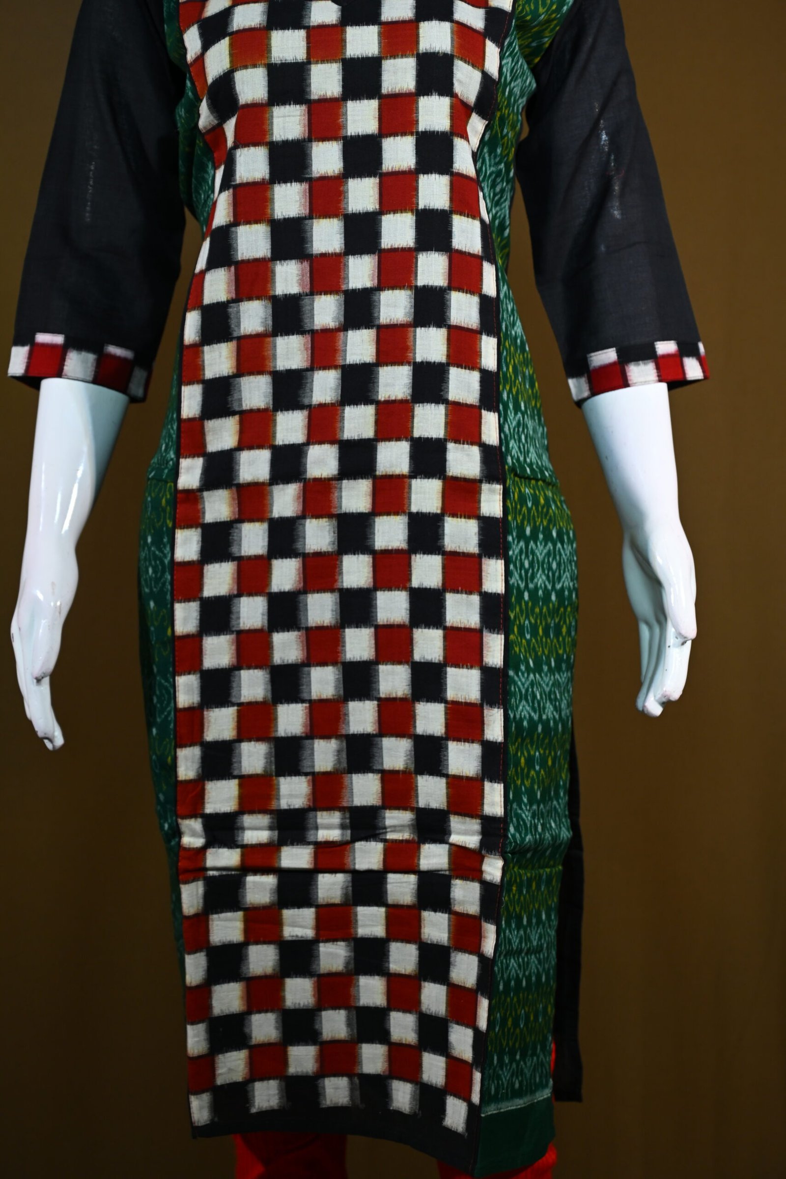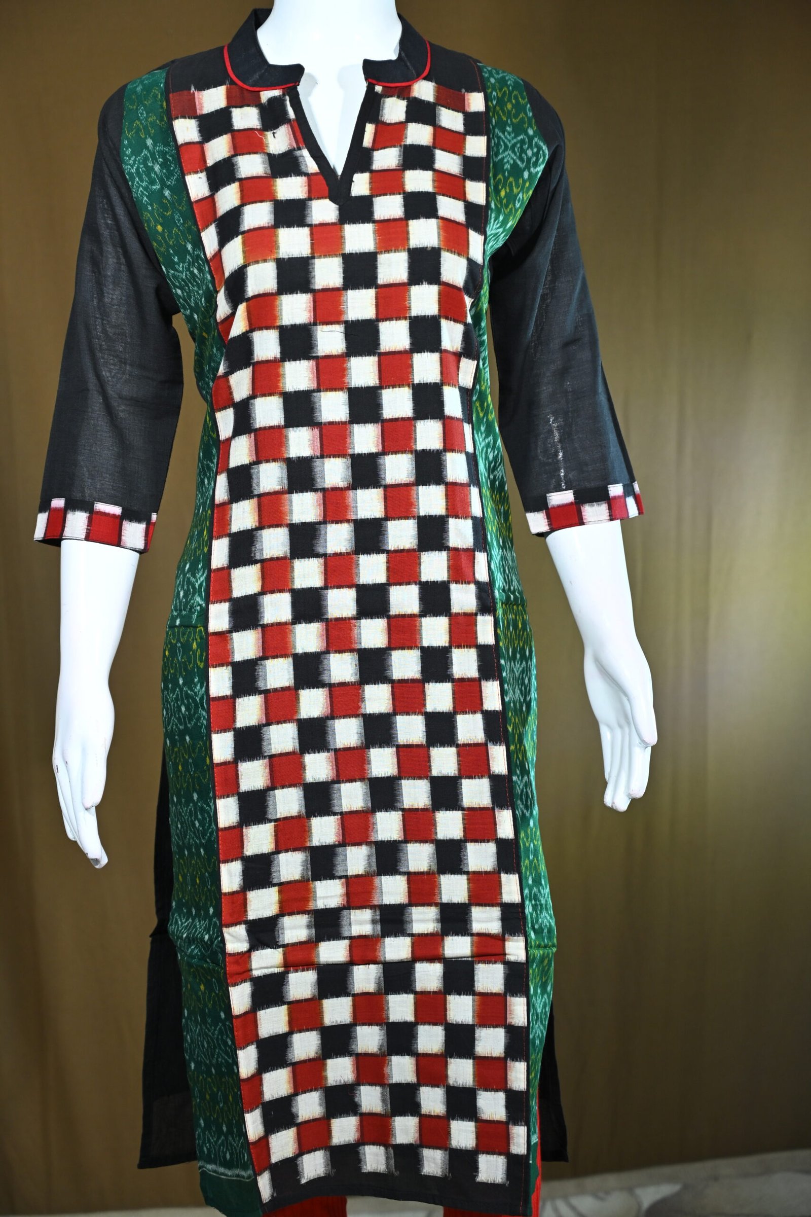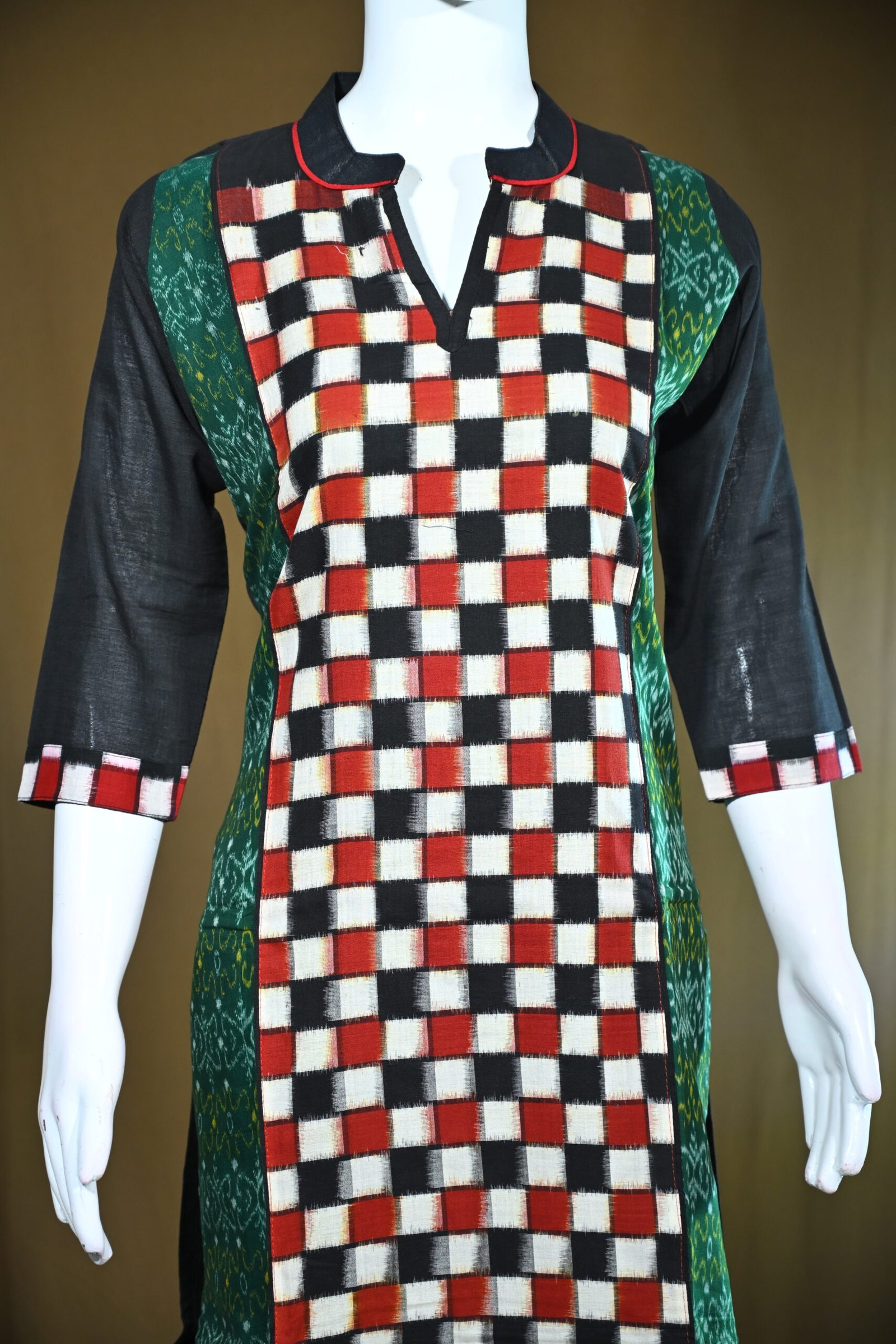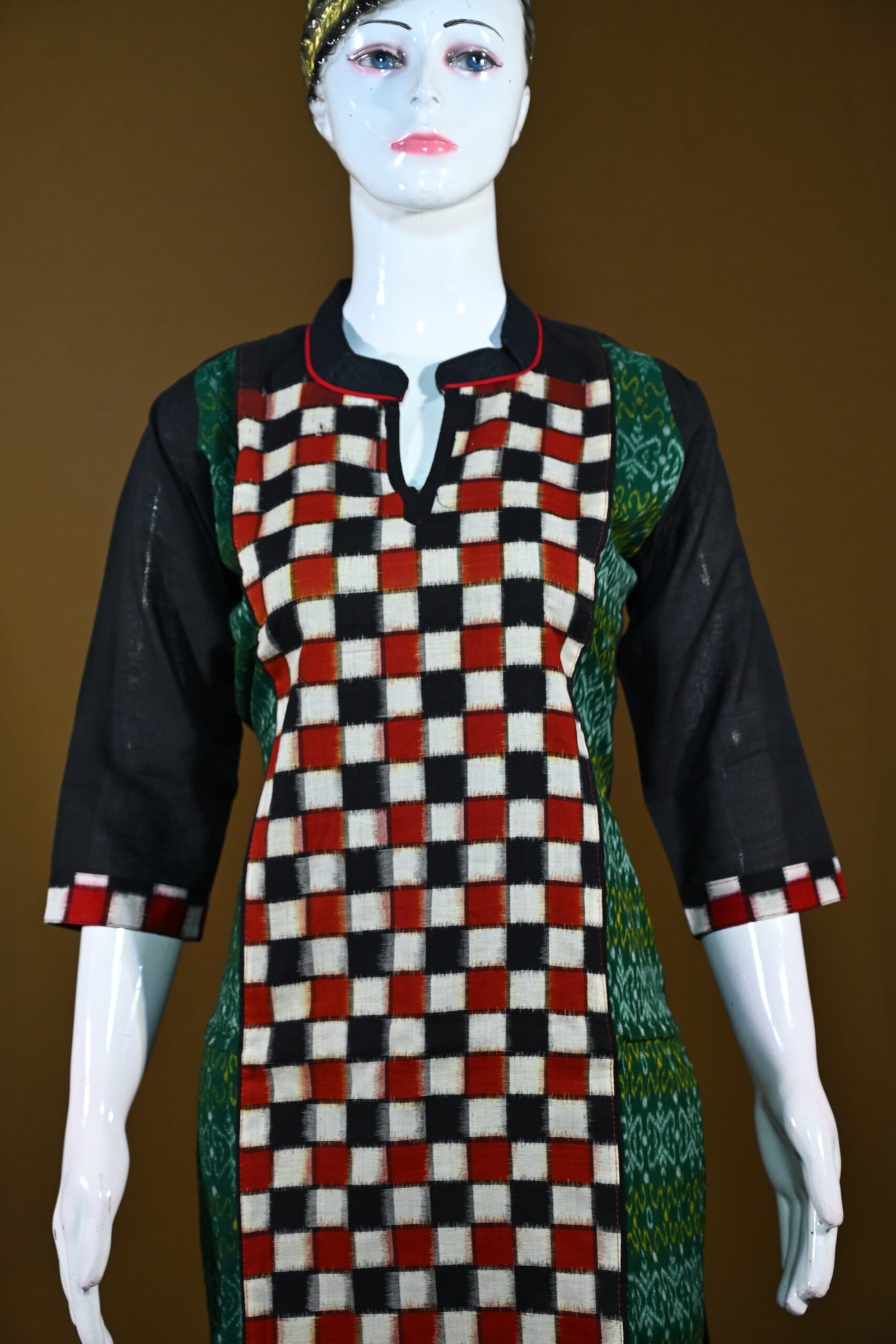 The kurti beautifully blends modern checkered patterns with traditional Sambalpuri Ikat weaving, creating a fusion style.