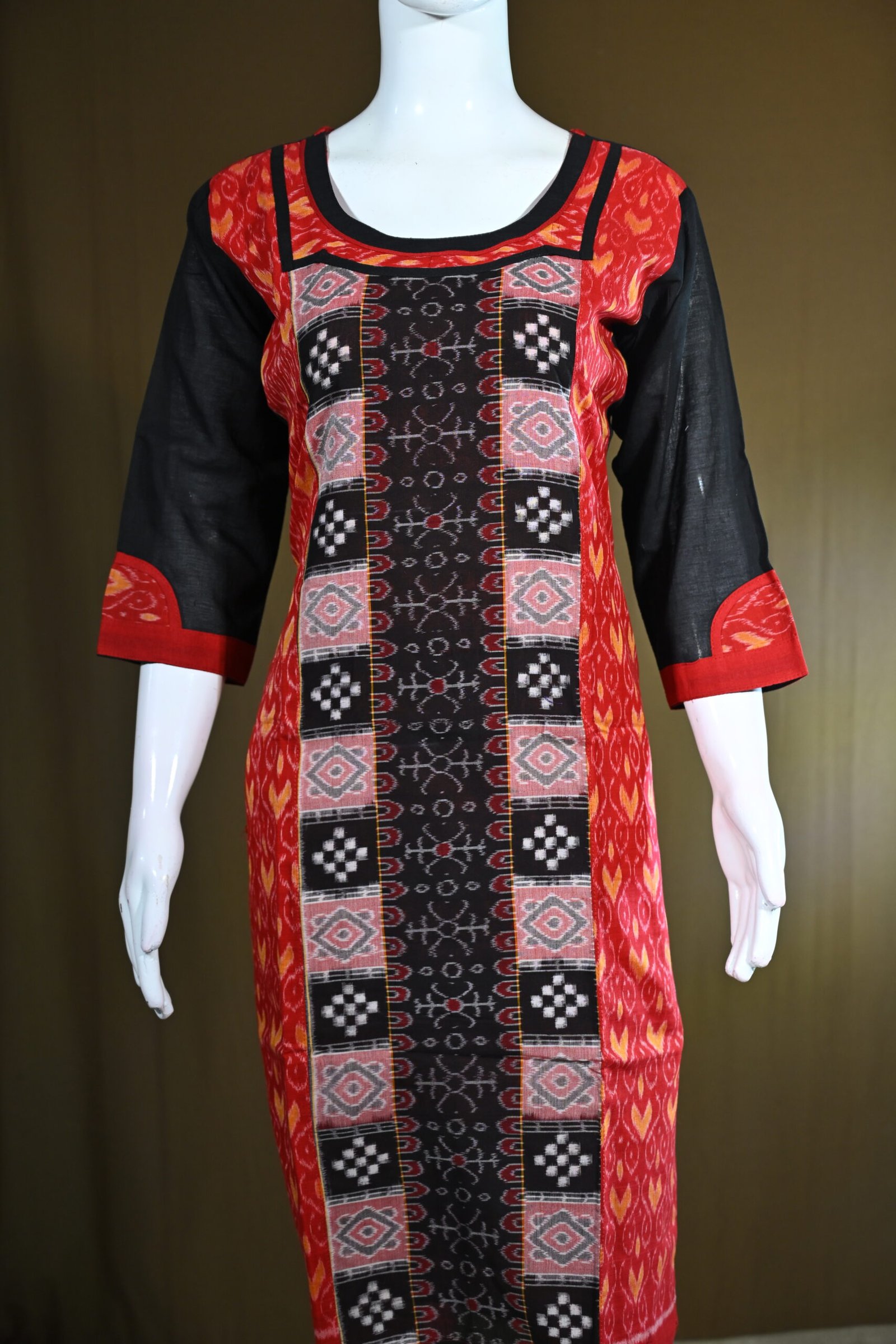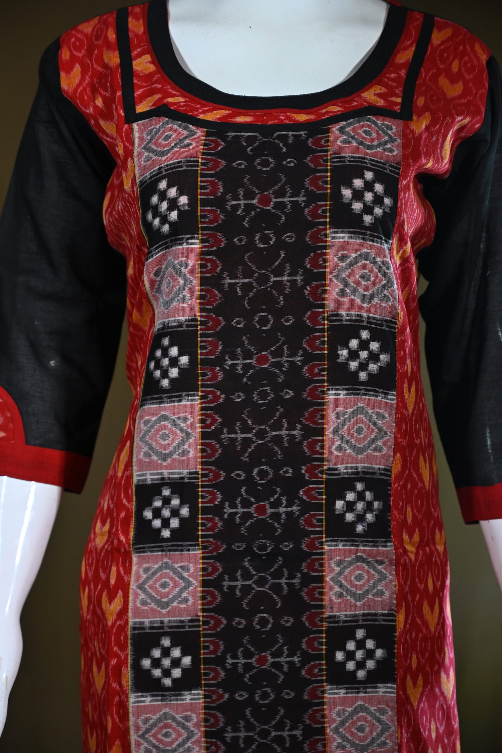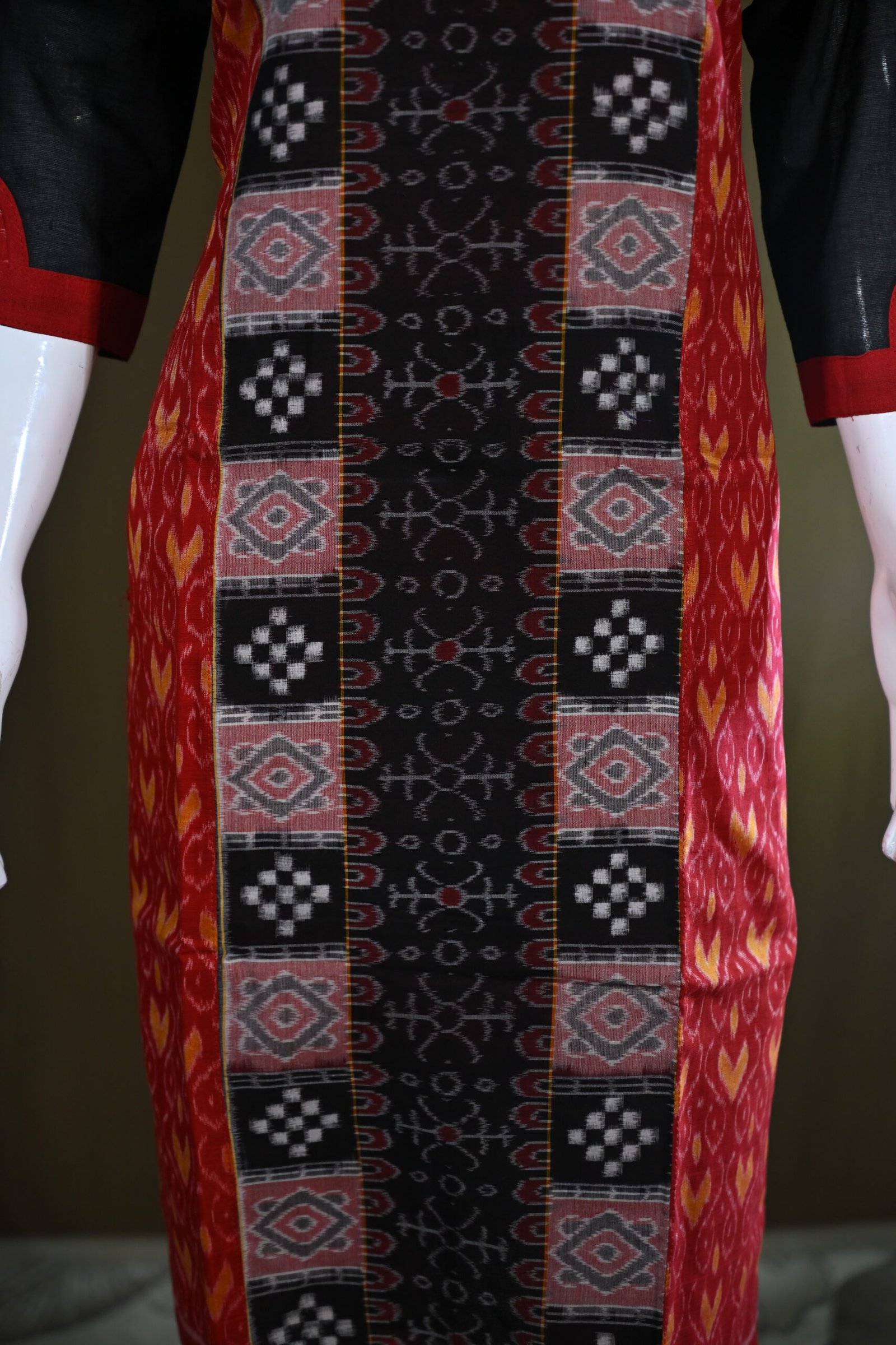 Both sides and the upper chest area feature a vibrant red Ikat pattern with yellow undertones, creating a bright contrast against the black center.