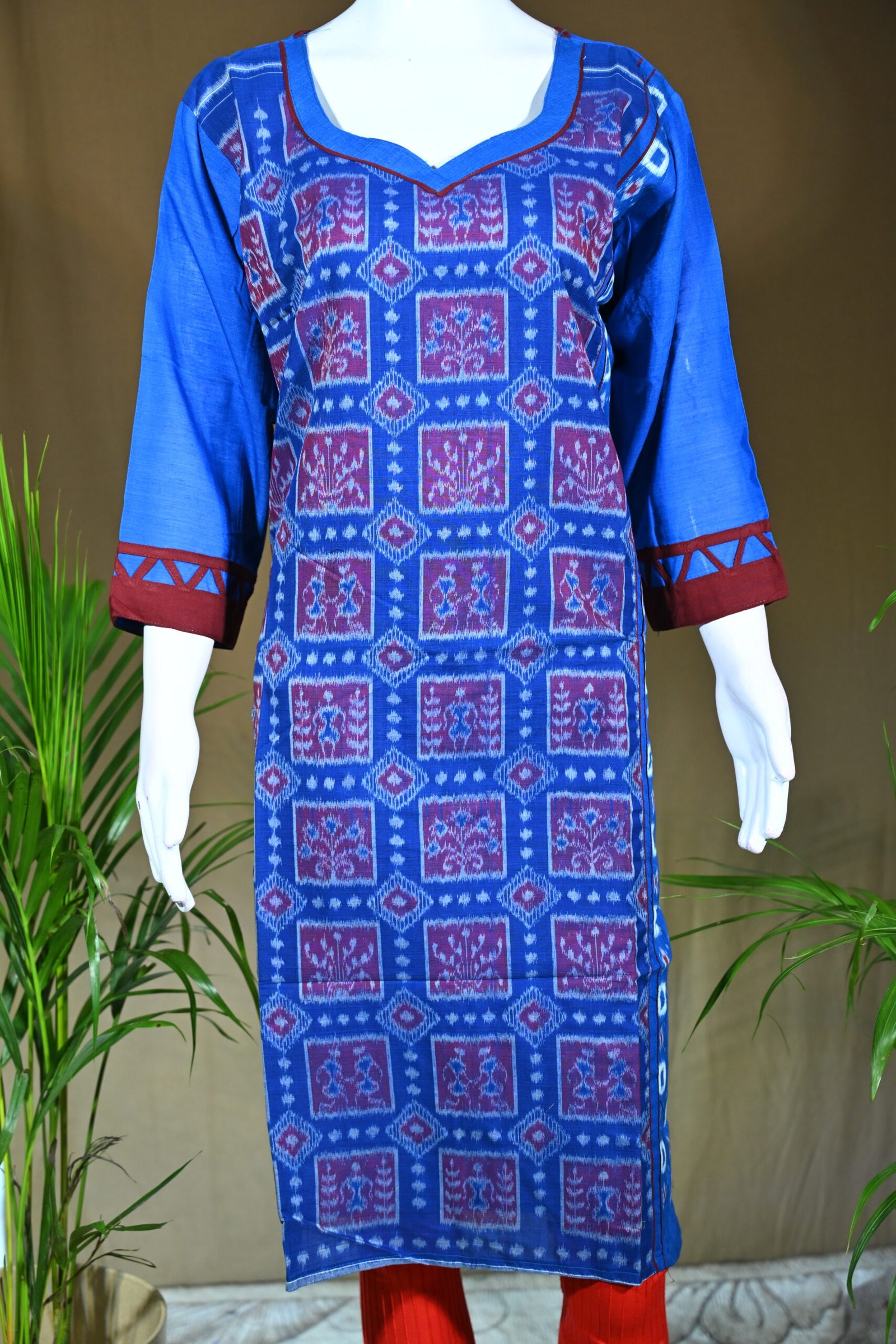Elegant royal blue Sambalpuri cotton kurti featuring traditional ikat square motifs, scalloped neckline, and maroon geometric cuff accents. A classic blend of tradition and style.