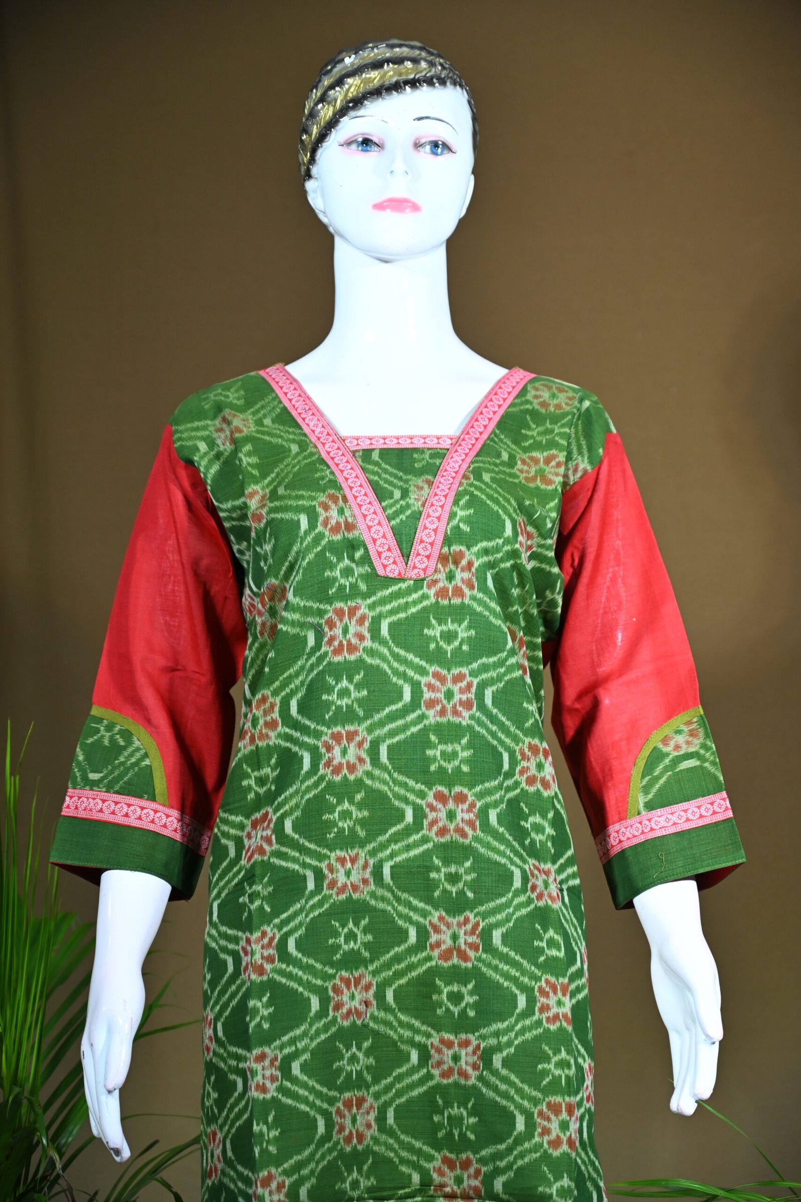 Elegant Green Sambalpuri Ikat Kurti with Red Sleeves