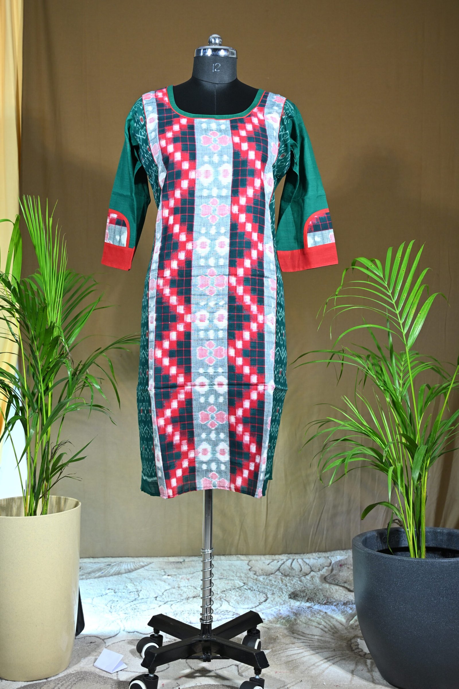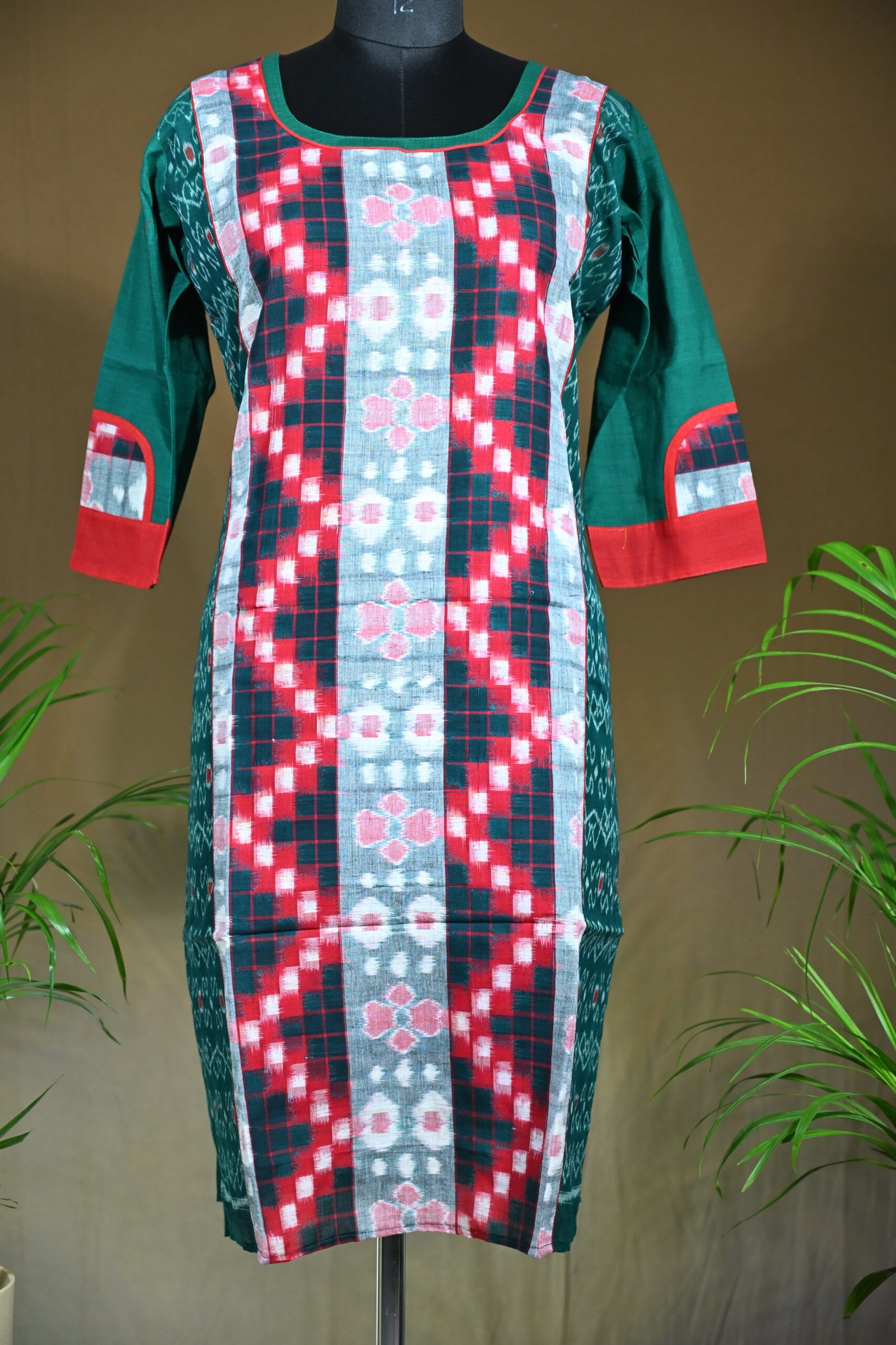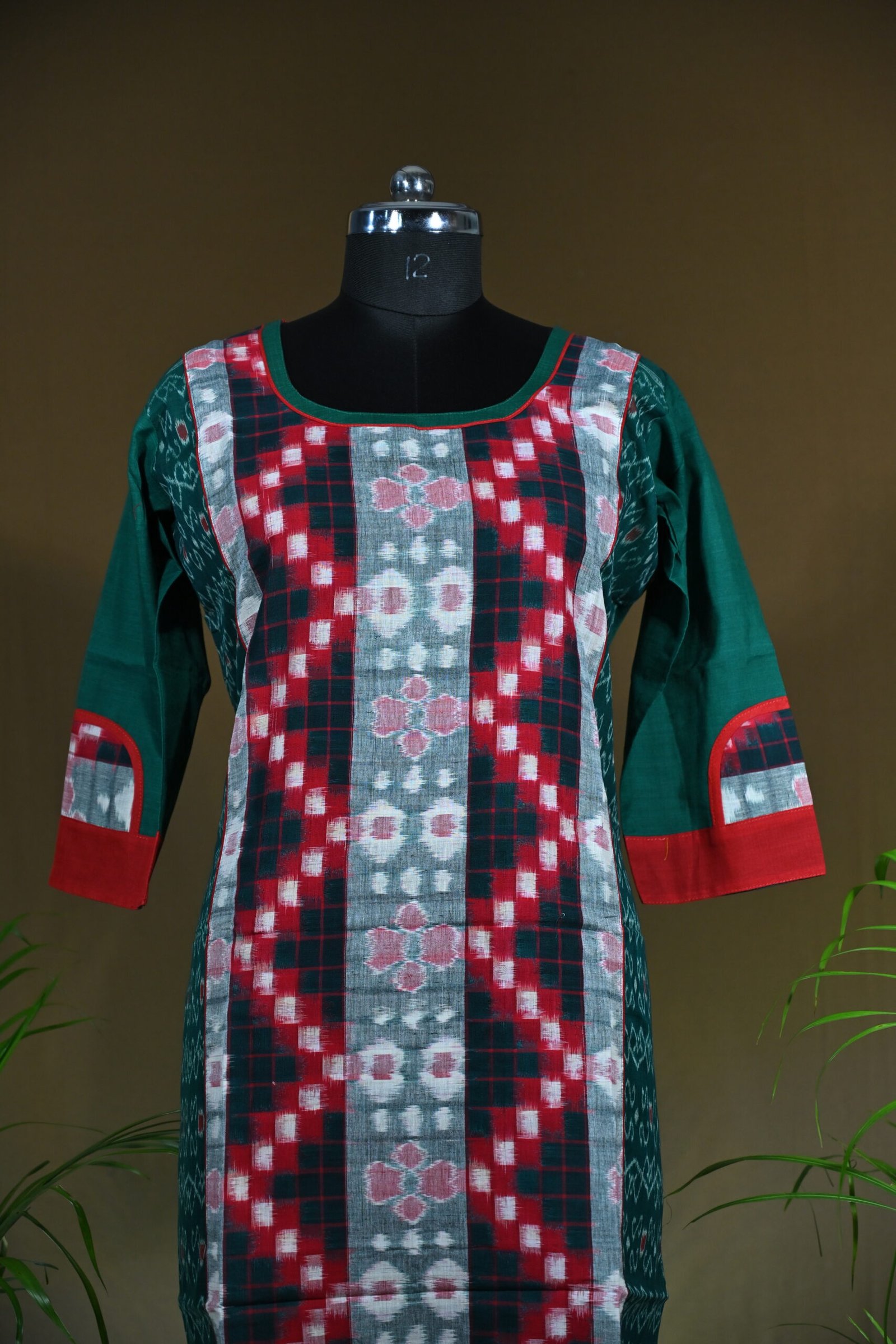 The side sections and sleeves are in solid green with subtle Ikat detailing, keeping the focus on the central panel. The 3/4th sleeves are accentuated with bold red cuffs and a unique semi-circular motif patch, adding a touch of symmetry and contrast.