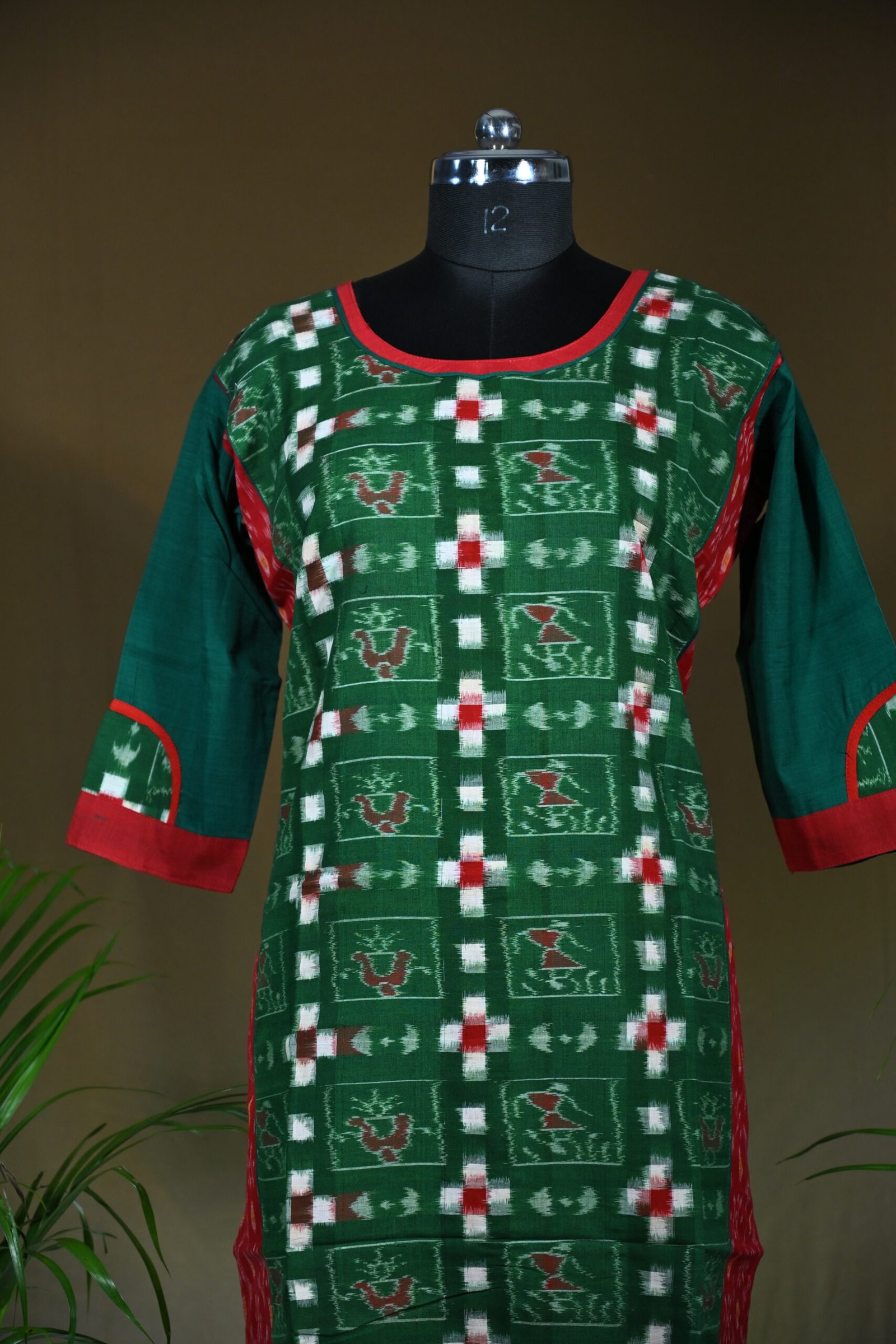 “Verdant Grace: Handwoven Sambalpuri Ikat Kurti”
