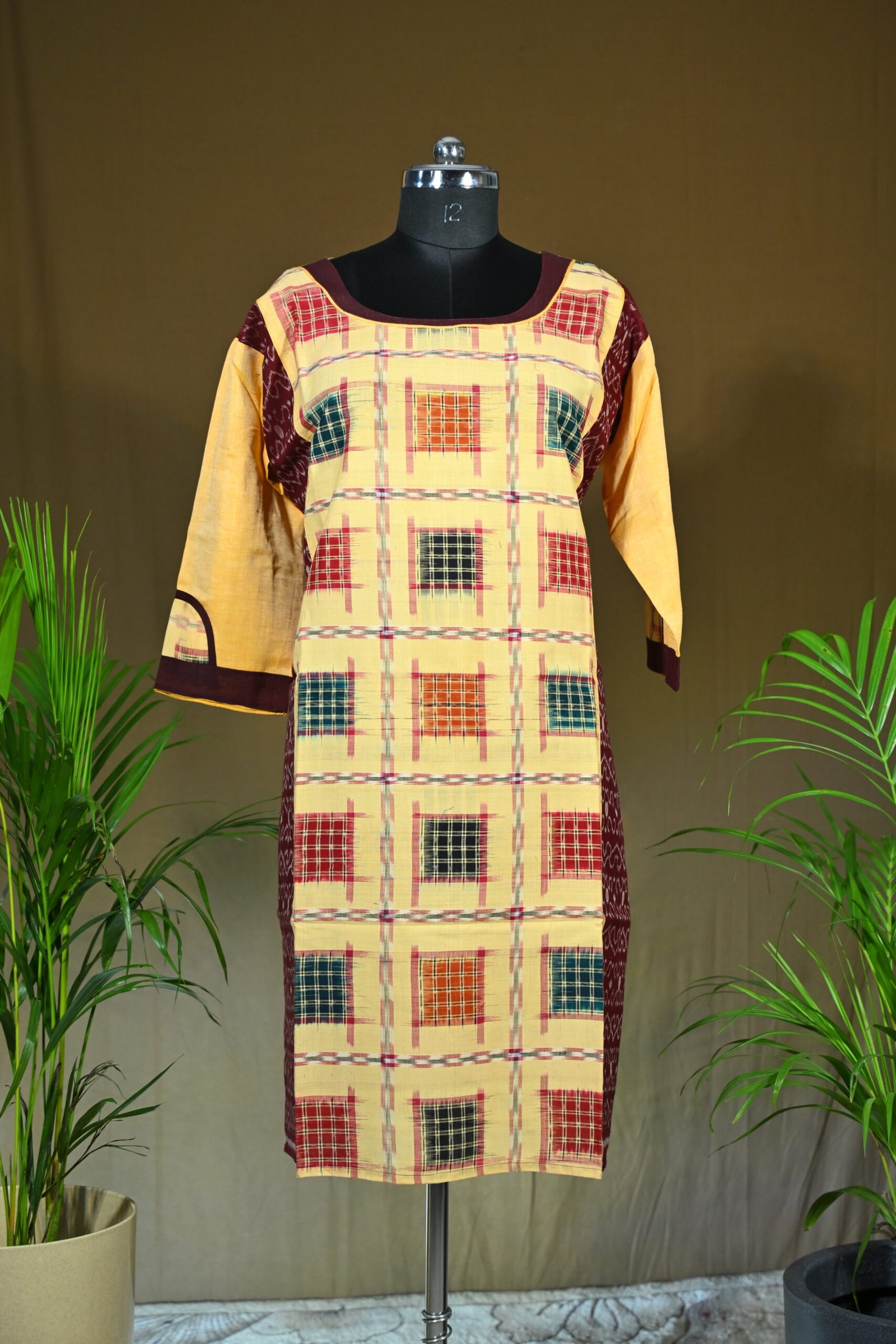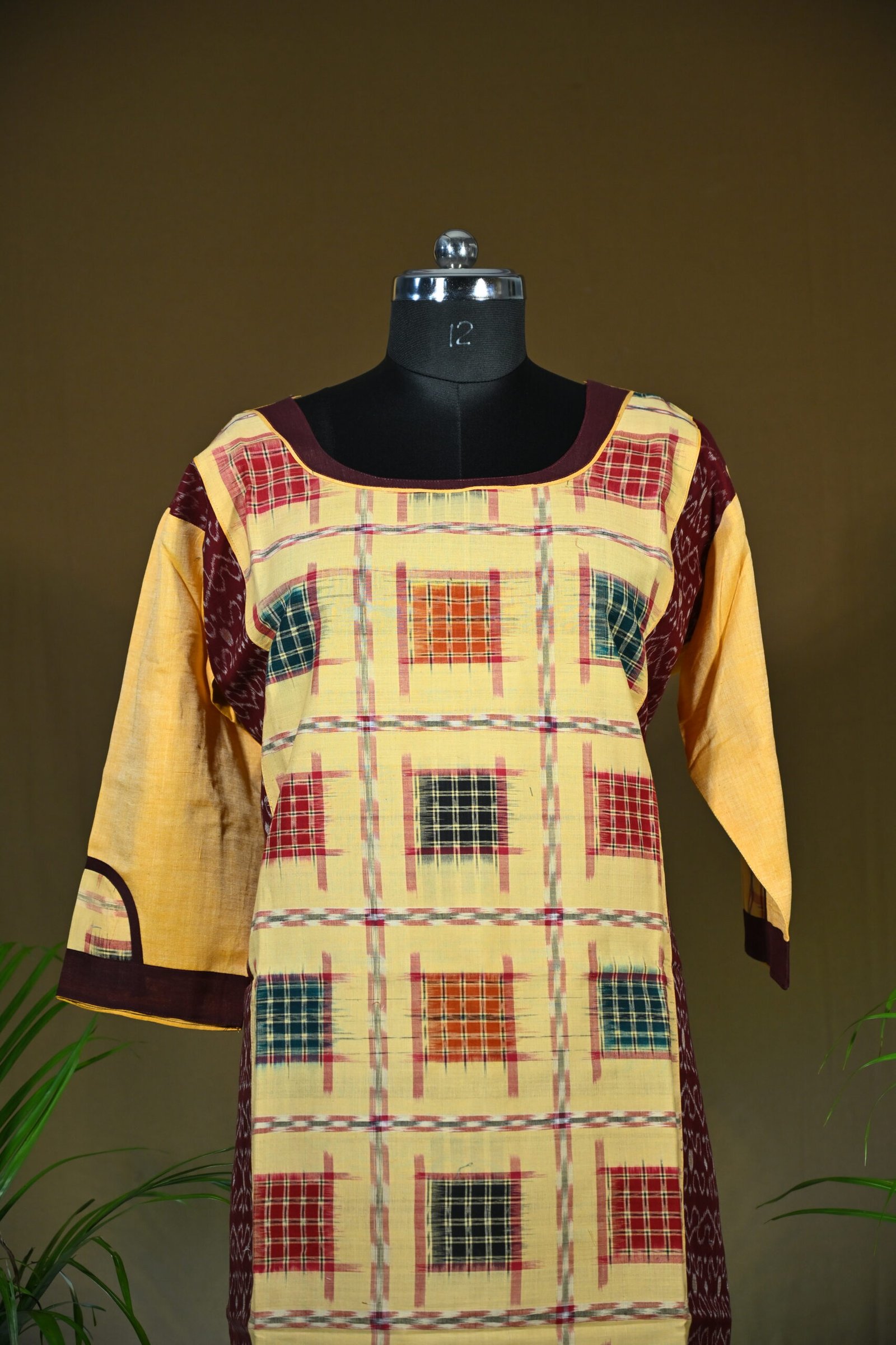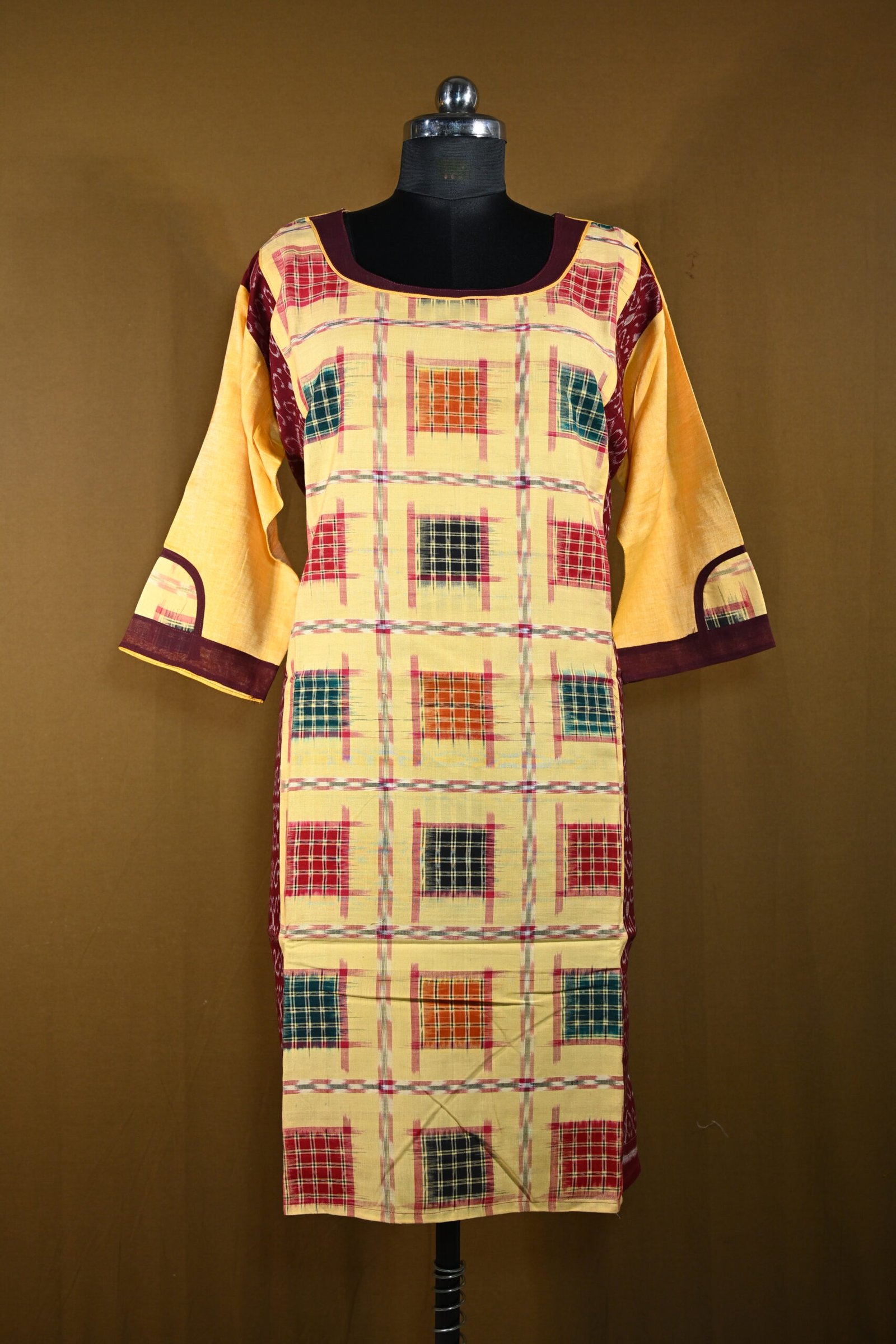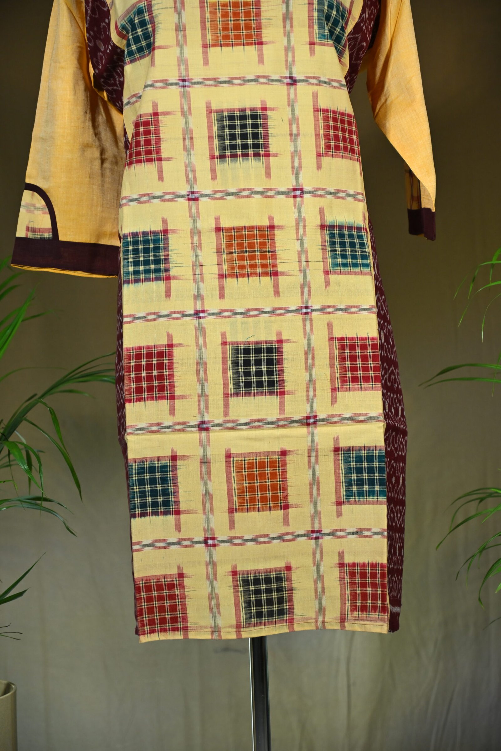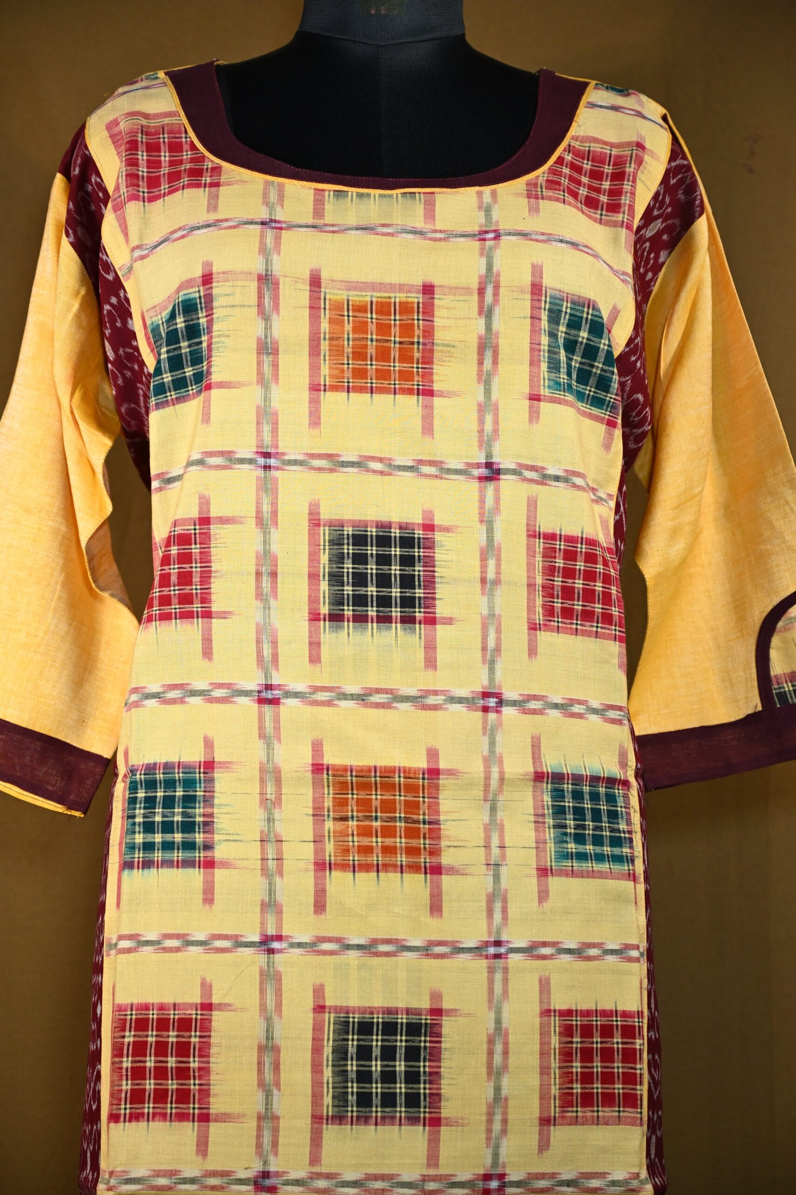 Traditional Sambalpuri Ikat cotton kurti in soft beige with a multicolored checkered box pattern