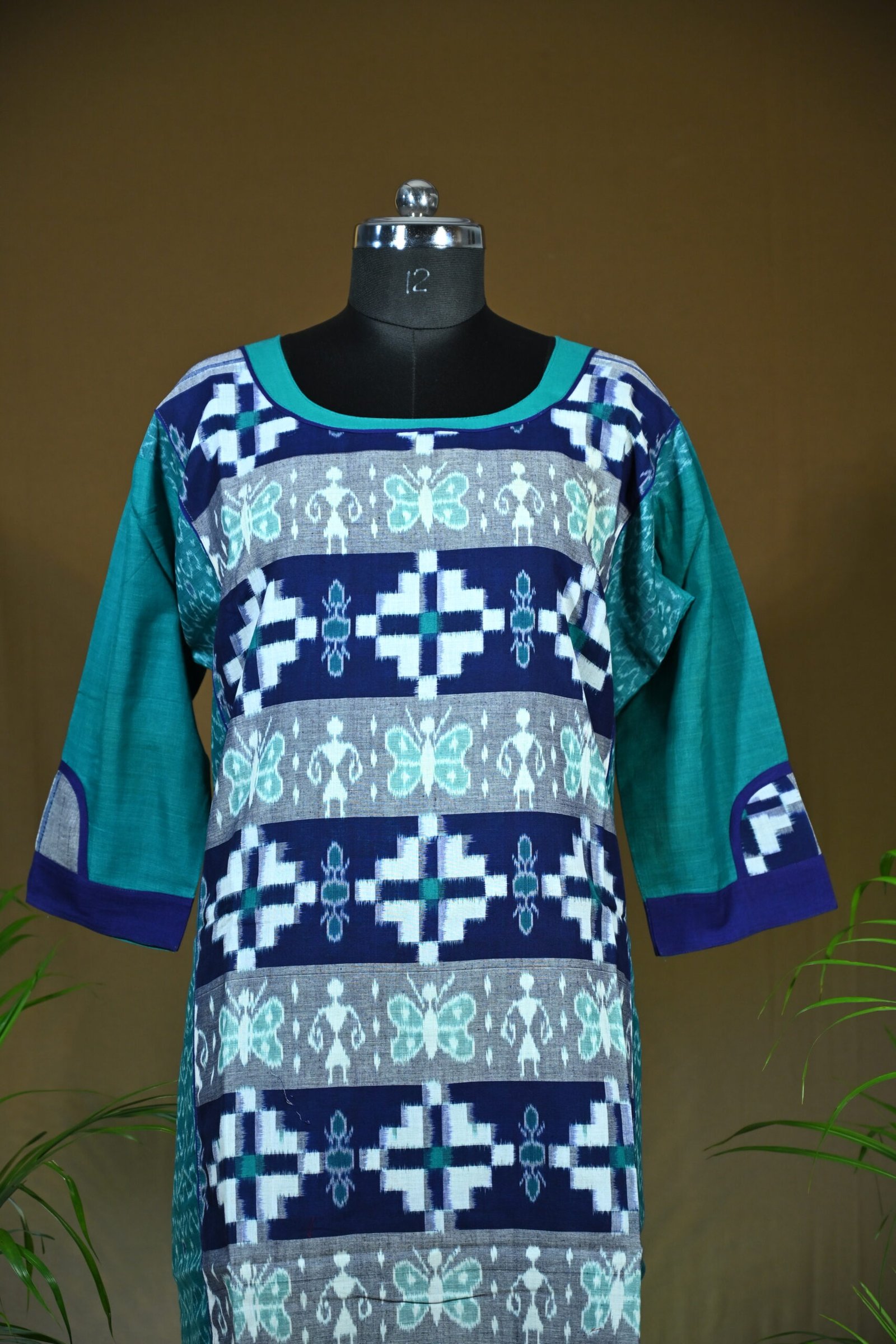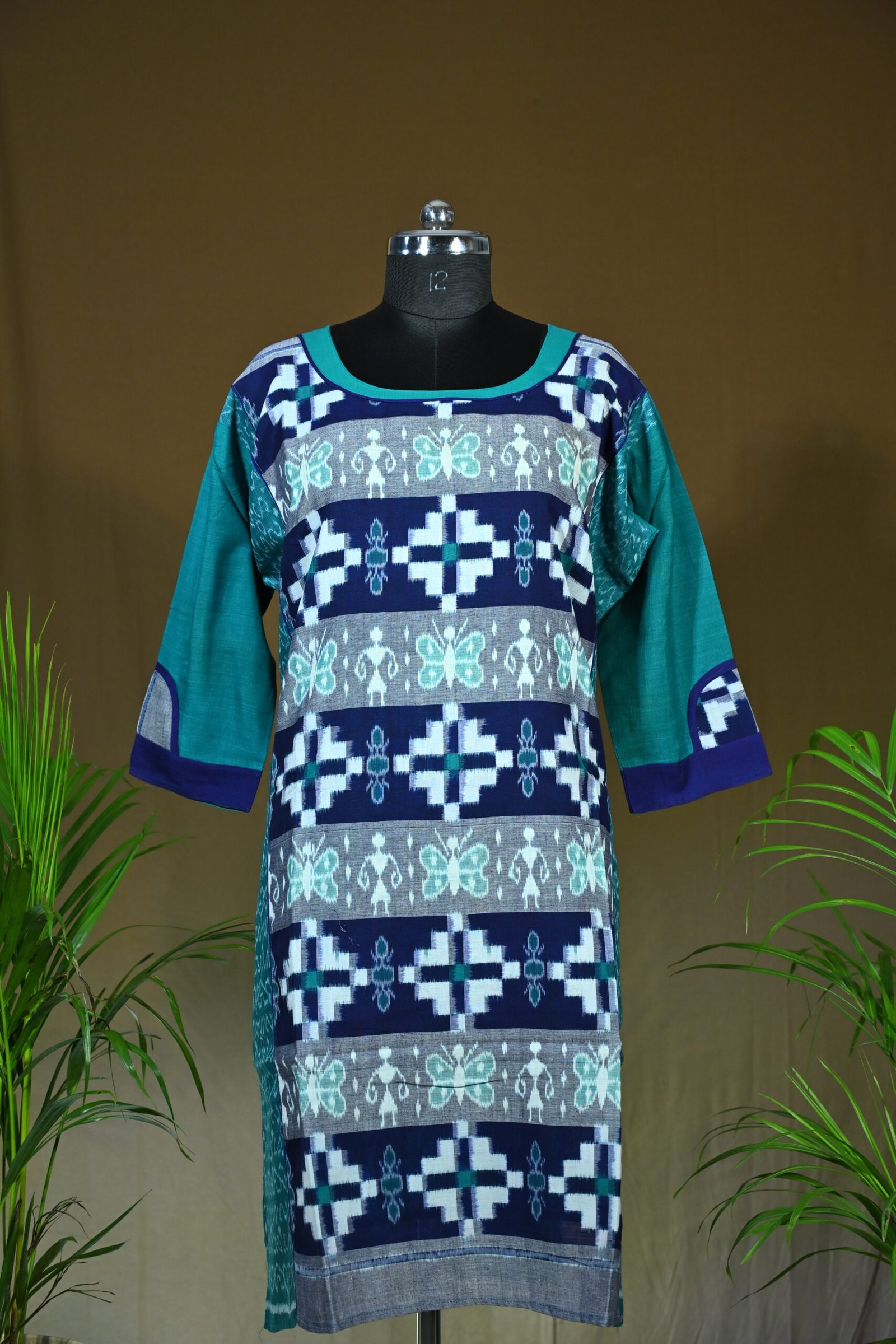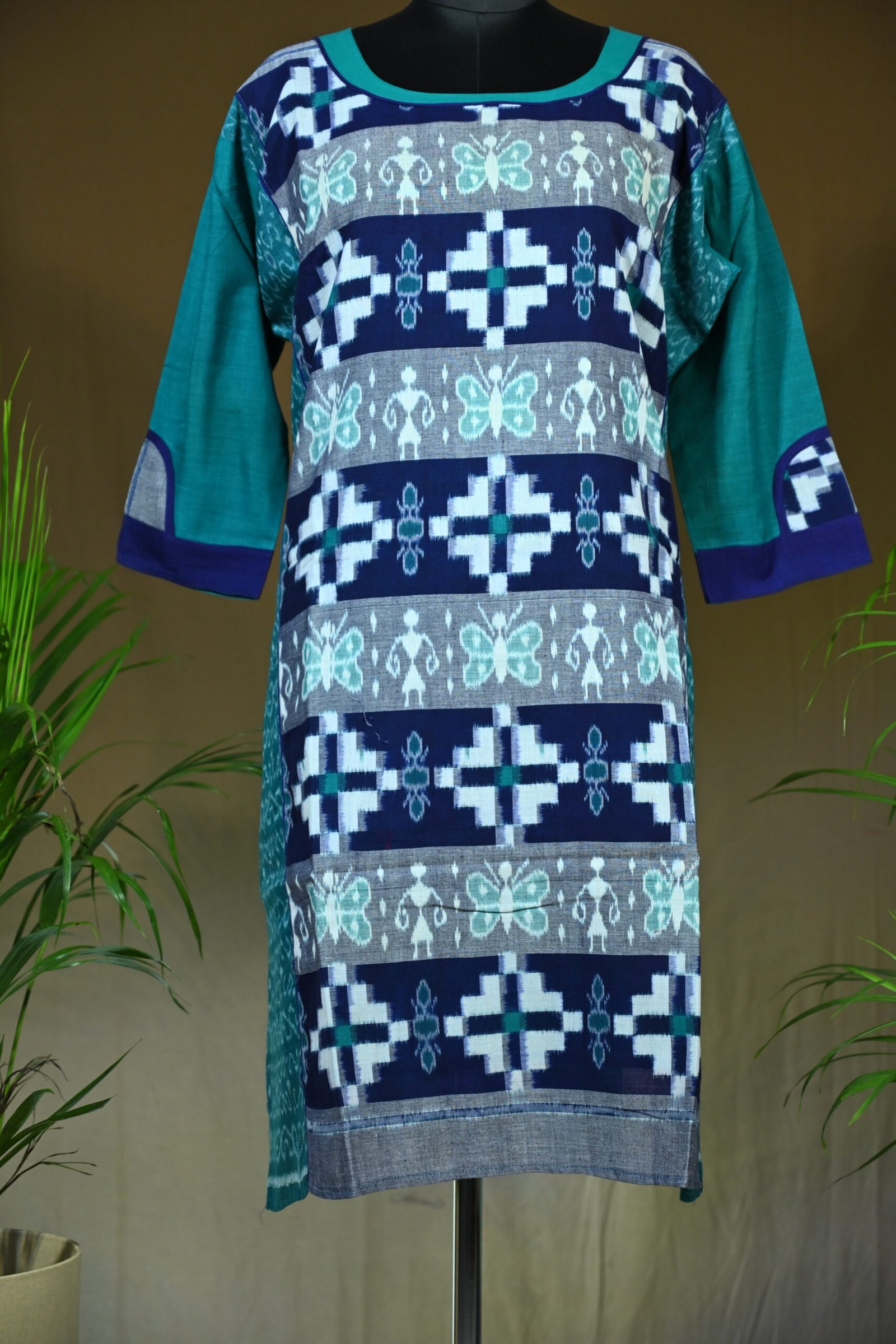 This Sambalpuri cotton kurti combines navy, teal, and aqua tones in a beautifully woven Ikat design. With tribal and butterfly-inspired motifs, this kurti offers a blend of culture and contemporary flair — perfect for everyday wear with a unique twist.