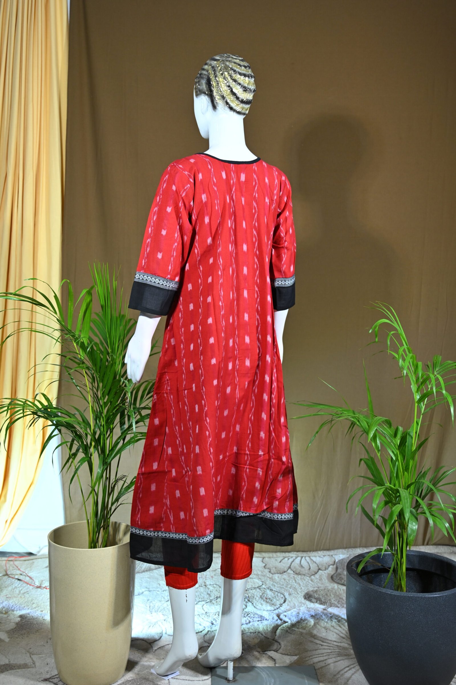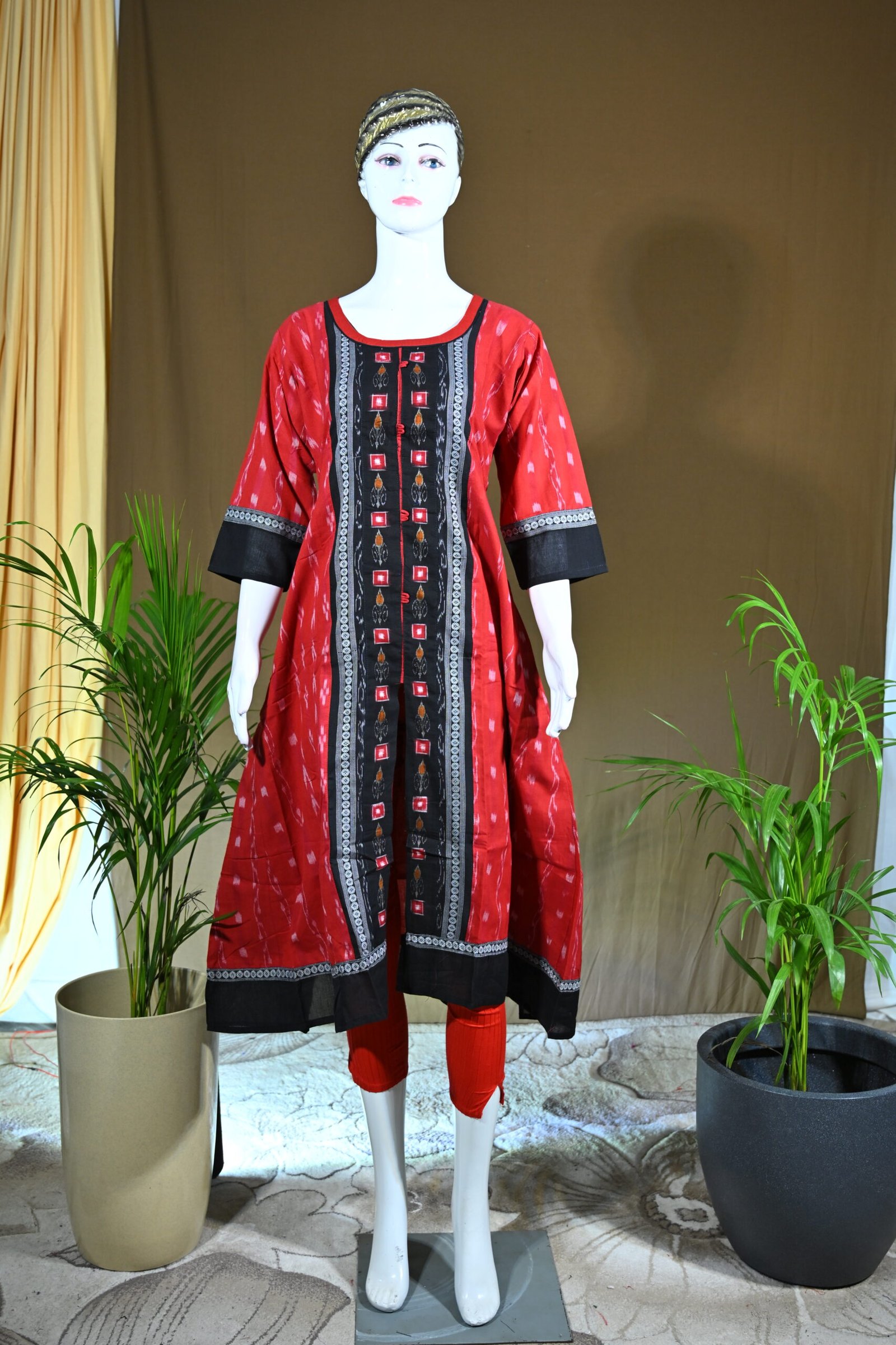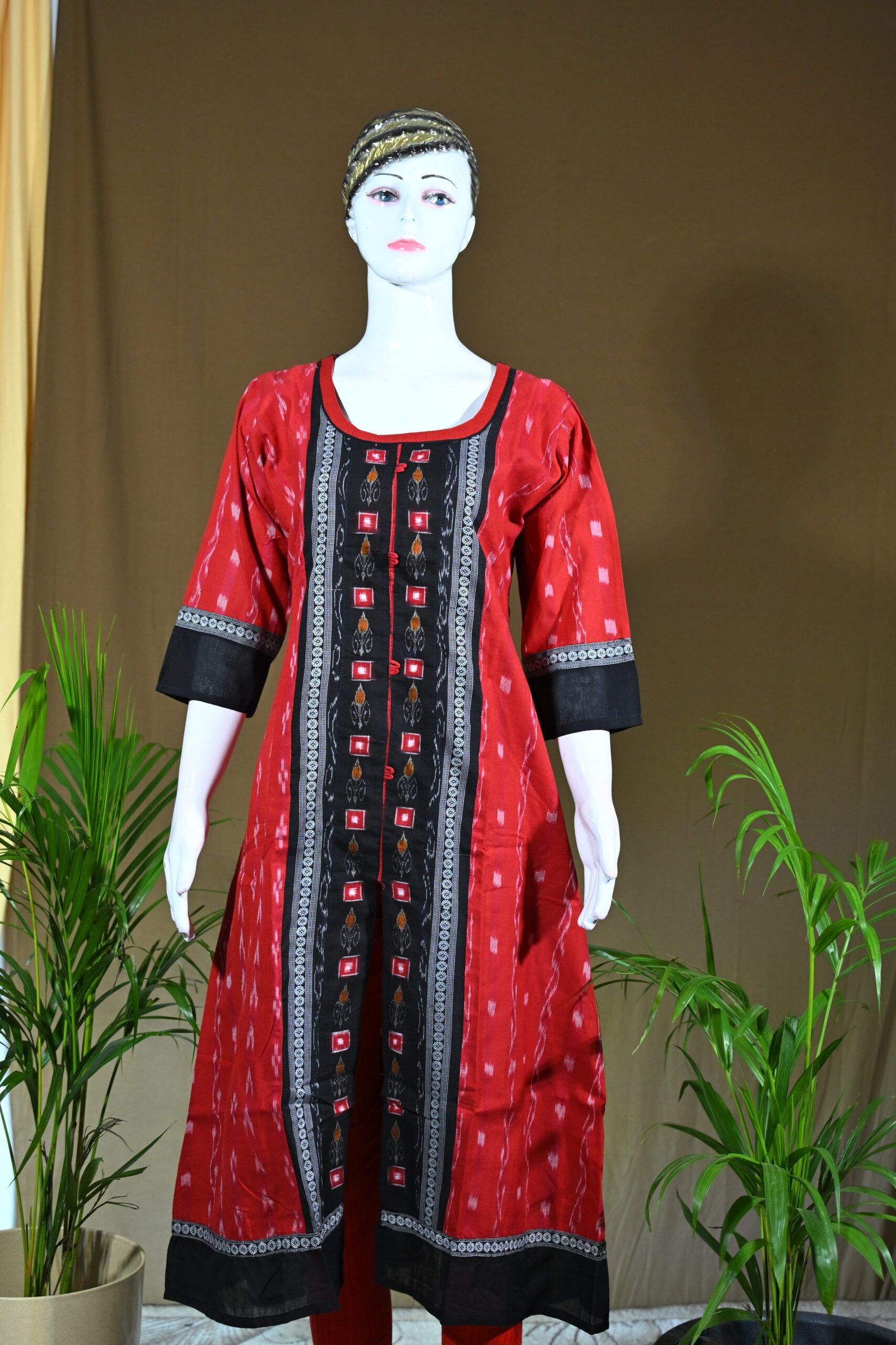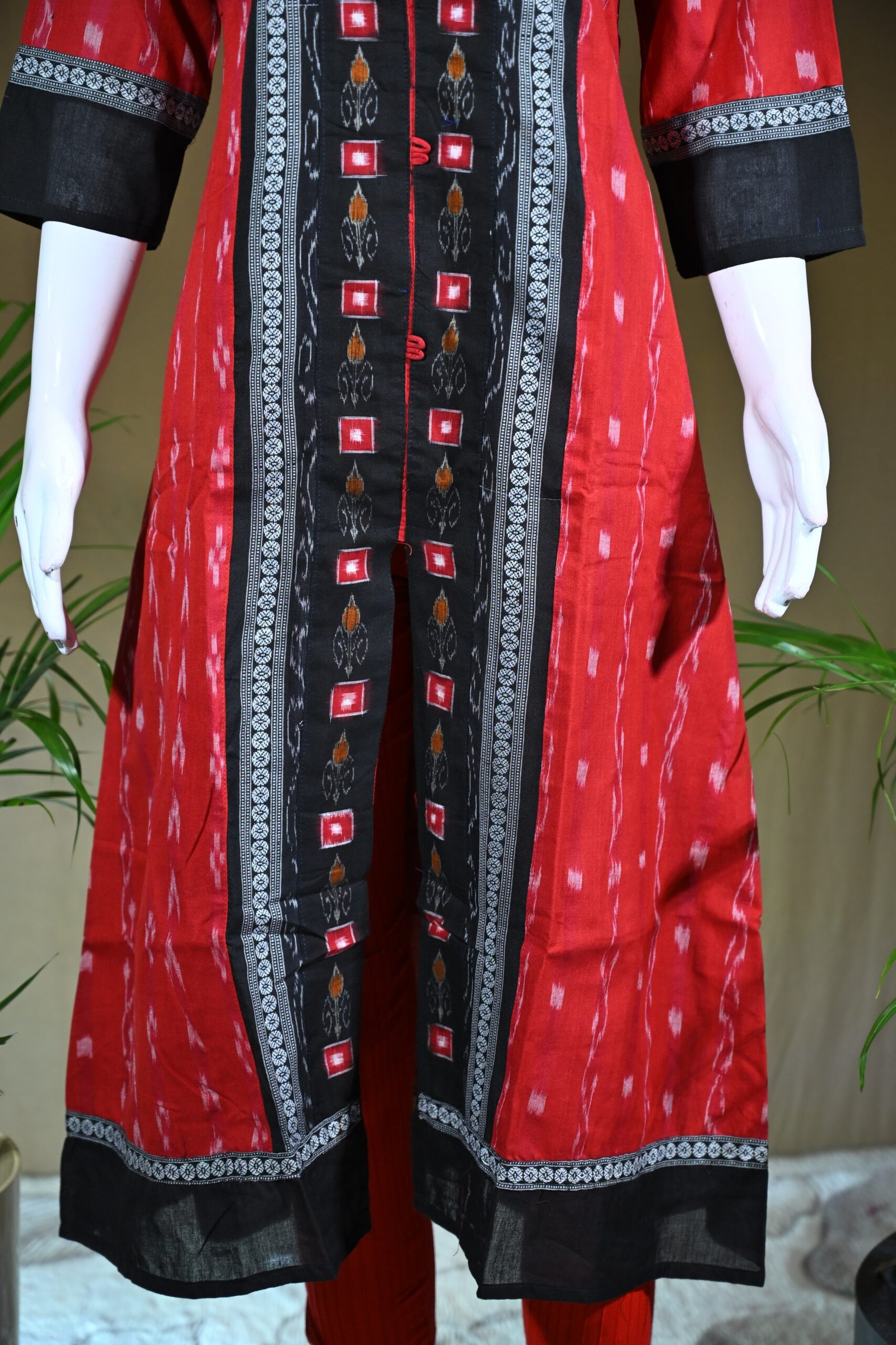 A vibrant red Sambalpuri kurti adorned with a striking black Ikat front panel and contrasting borders. Perfectly blending tradition with modern style, it is an elegant choice for festive and casual occasions.