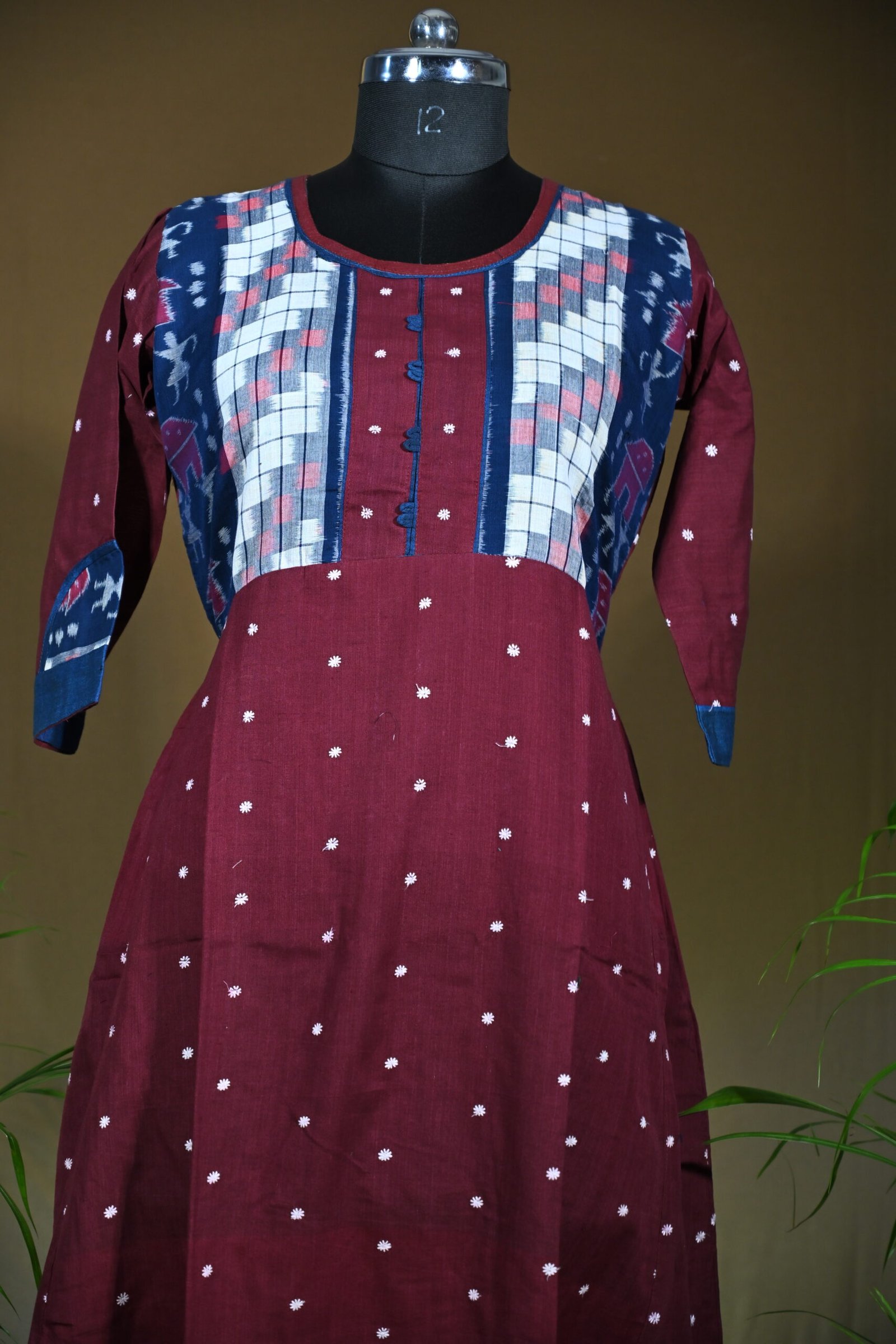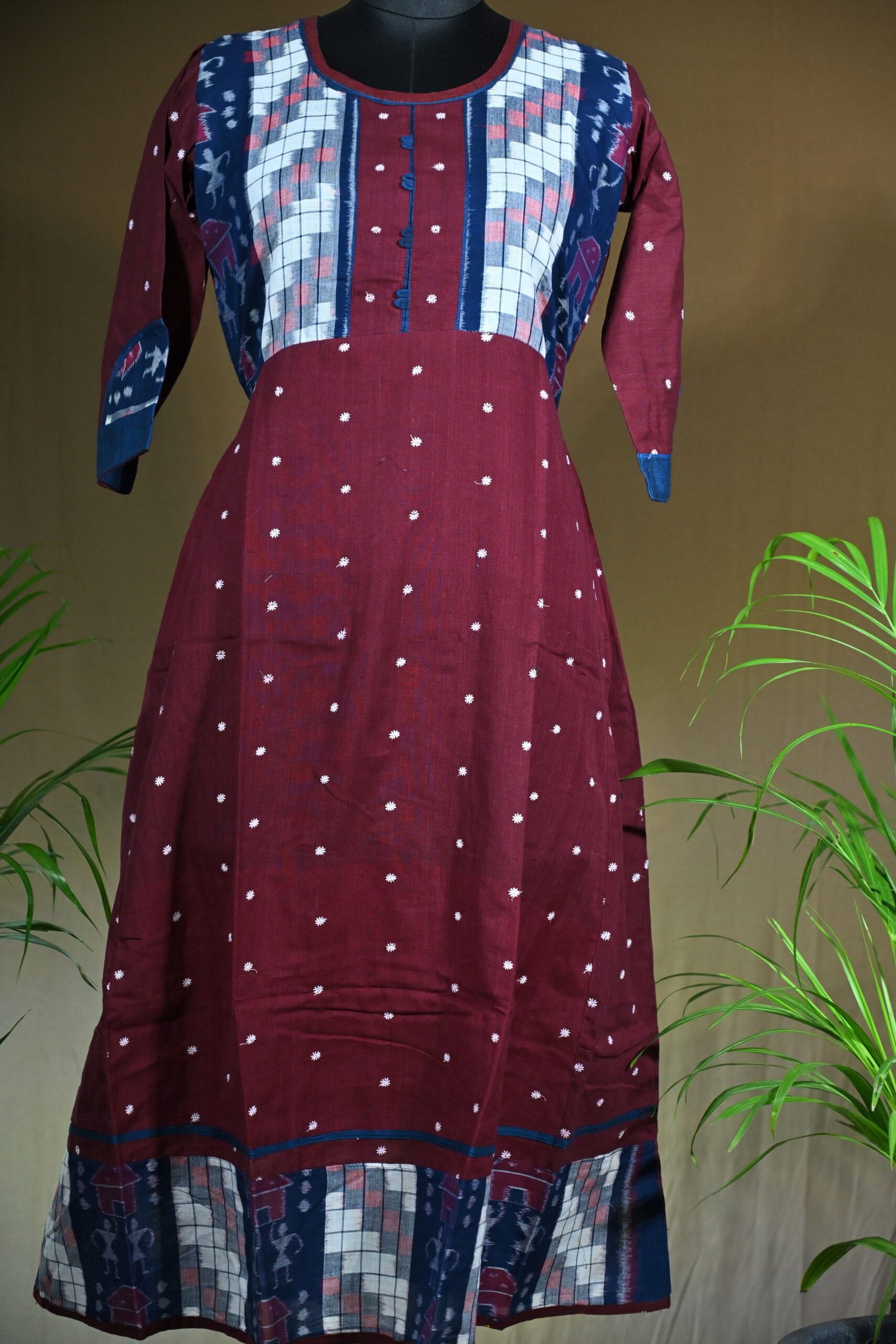 Yoke Pattern: Blue and maroon striped Ikat panel on the chest with button-style detailing for added sophistication.
