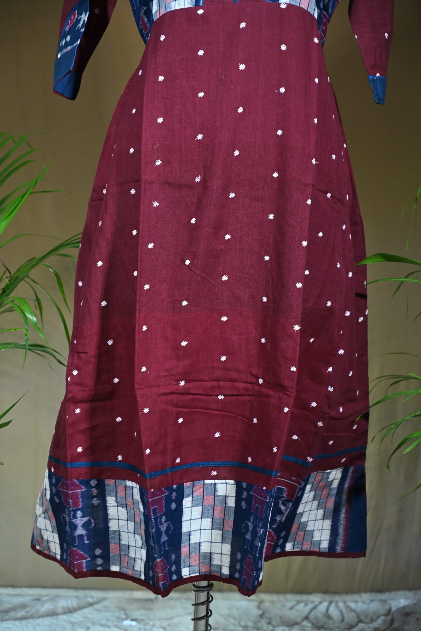 Sleeves: 3/4th maroon sleeves with matching blue Ikat cuffs, creating a balanced contrast.