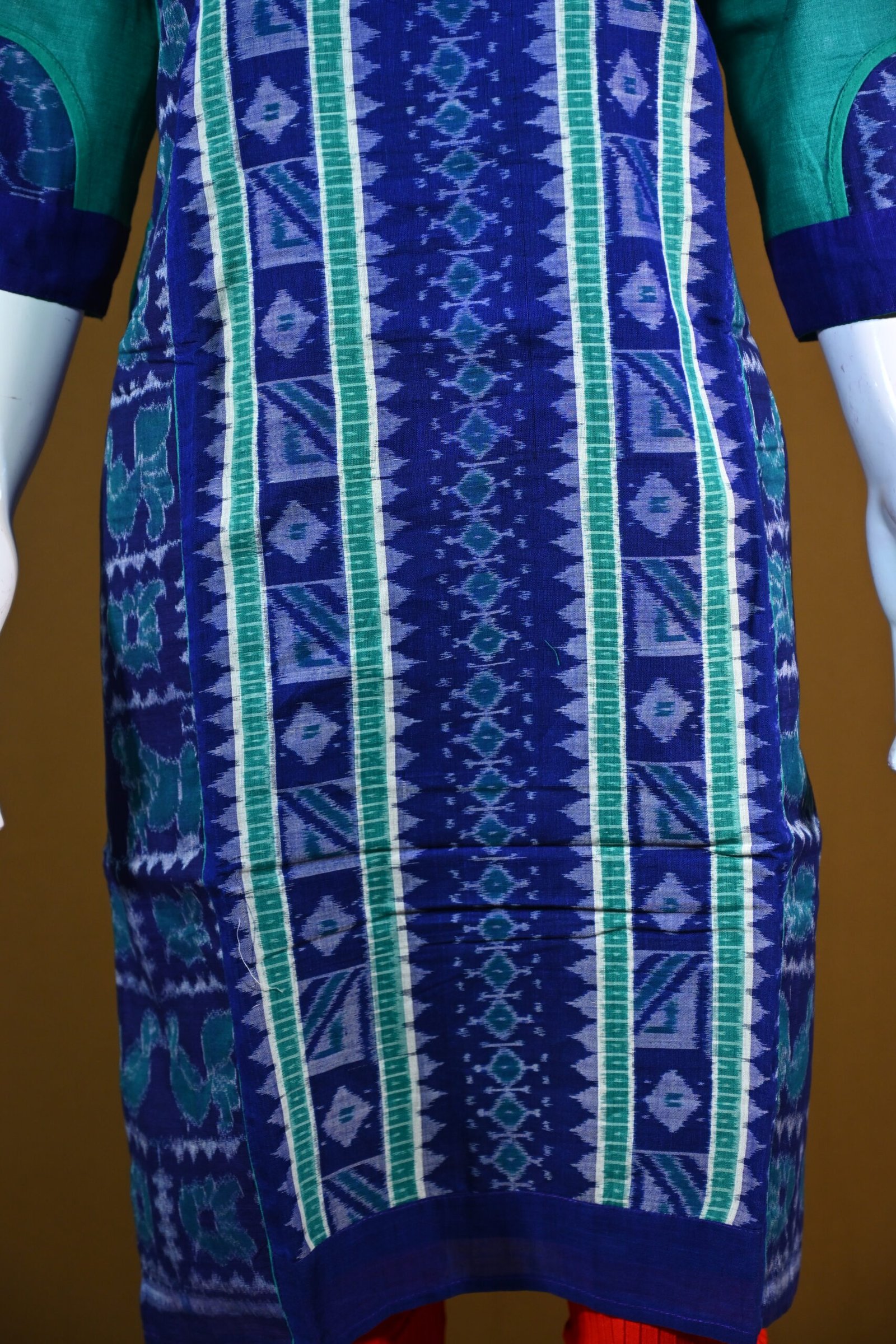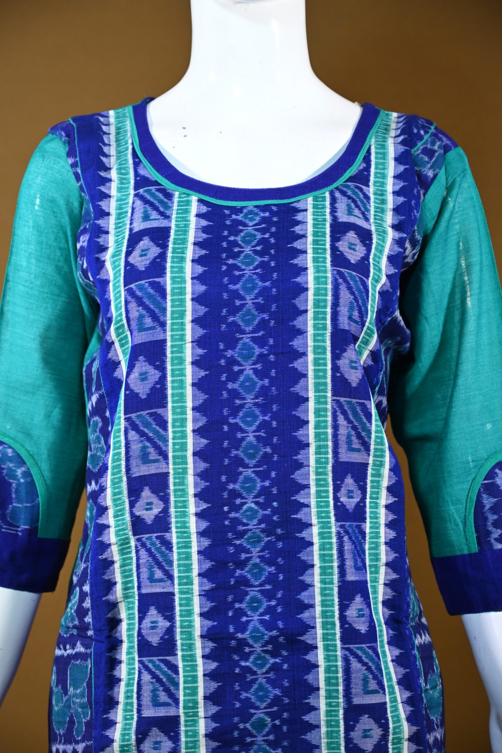 The rich blue and green combination with geometric patterns adds a refreshing ethnic touch. Perfect for casual outings or festive wear.