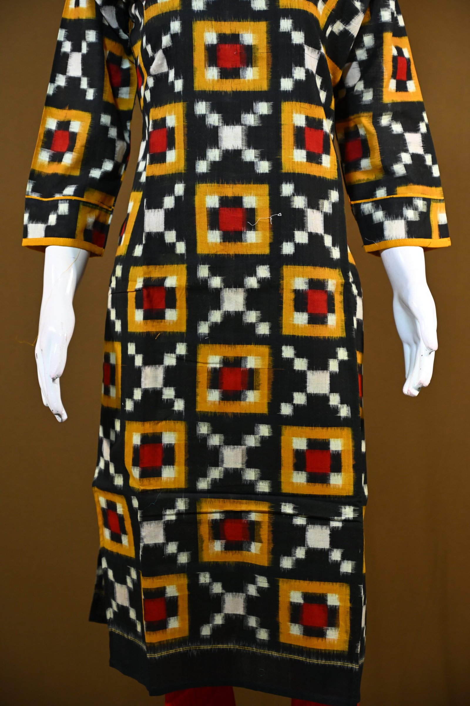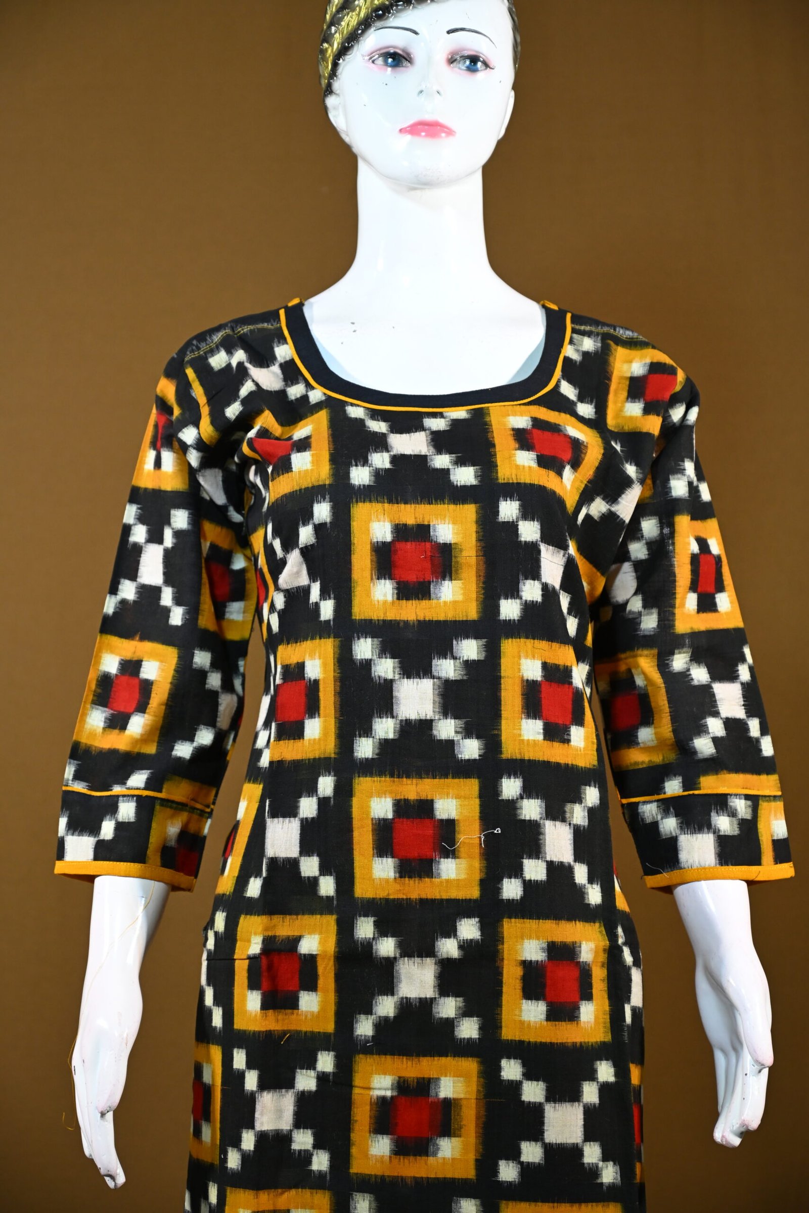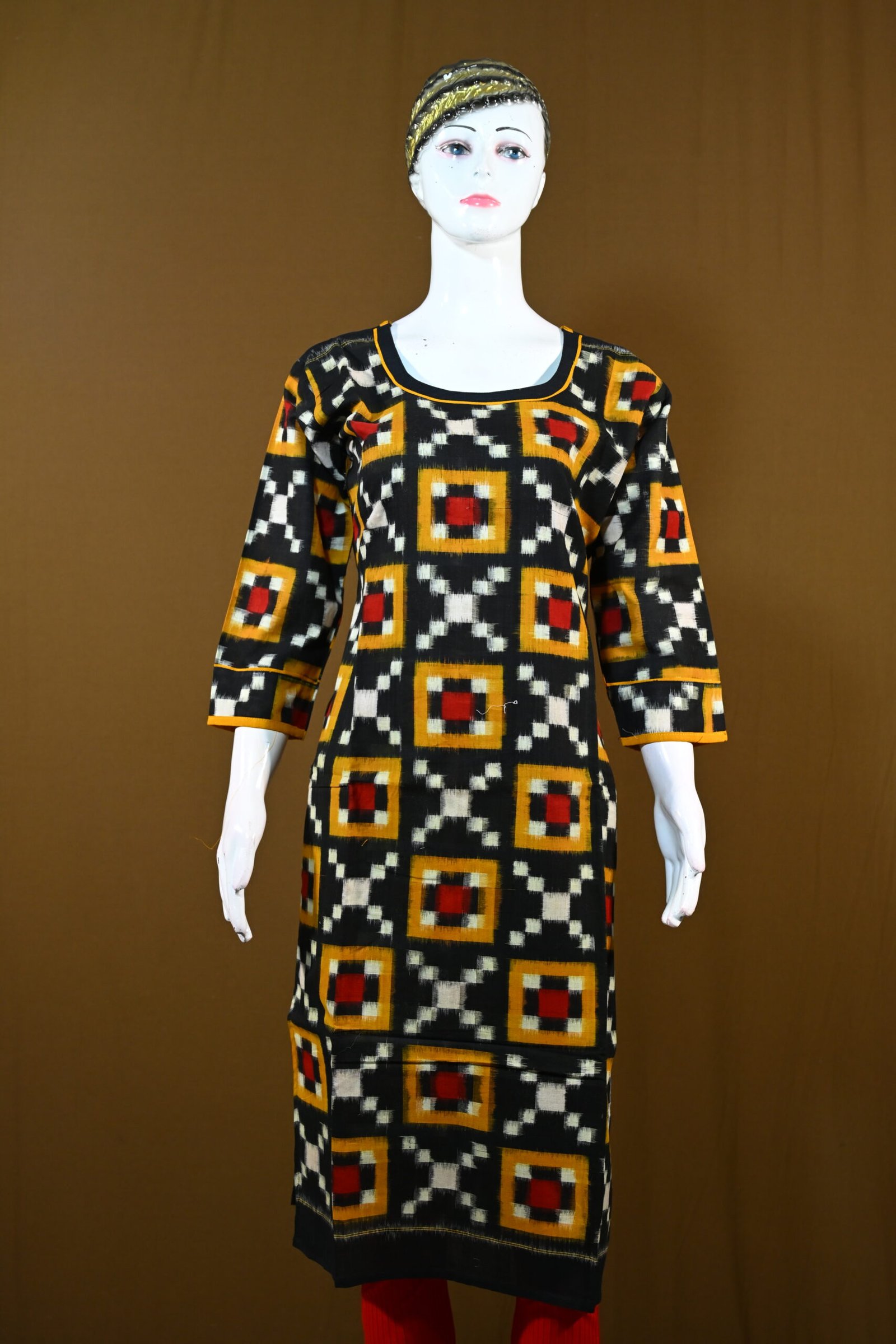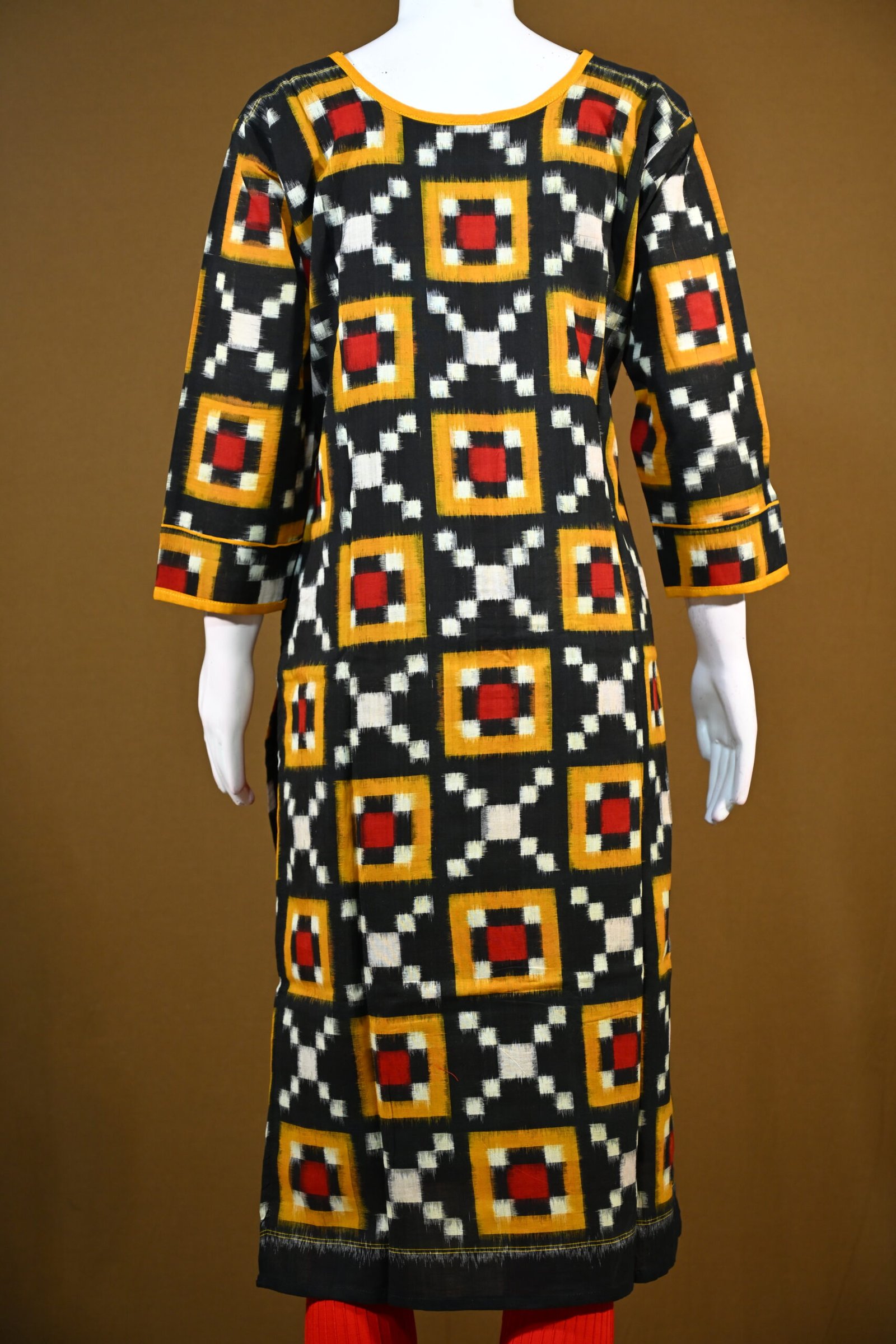 Embrace ethnic elegance with this pure Sambalpuri cotton kurti, showcasing traditional Ikat patterns in striking black, mustard, and red tones. The geometric motifs add a bold yet classic touch, perfect for casual and festive occasions.