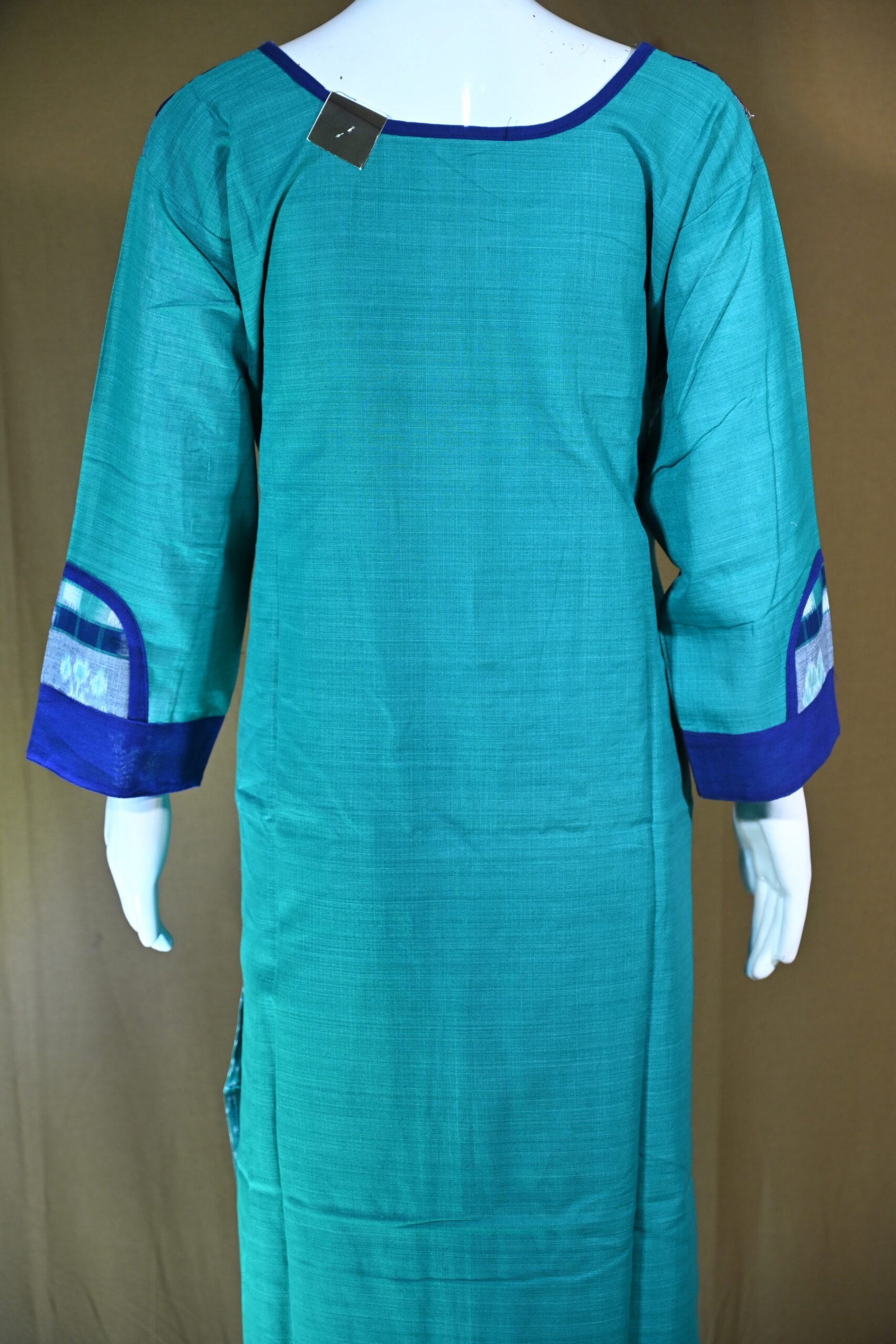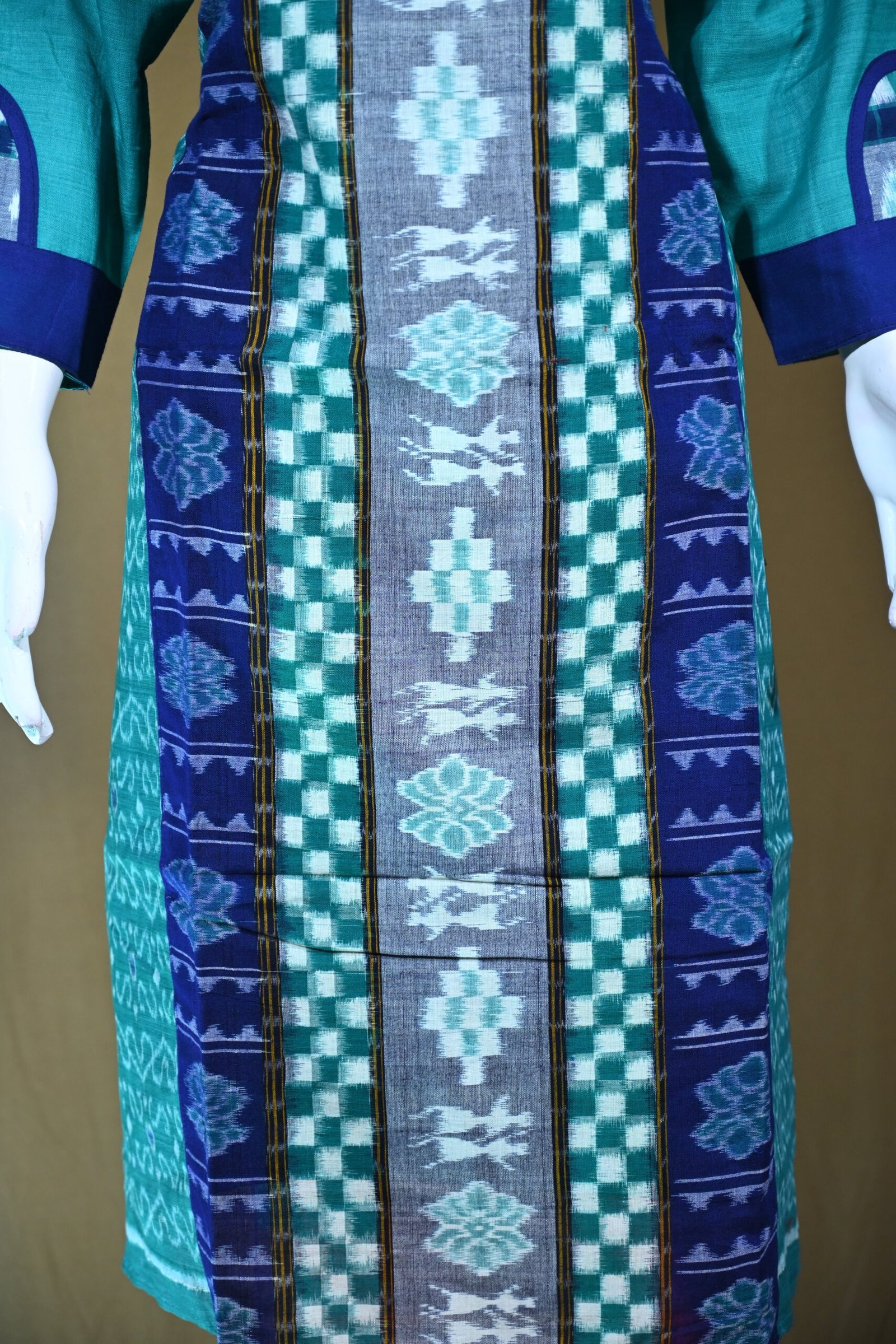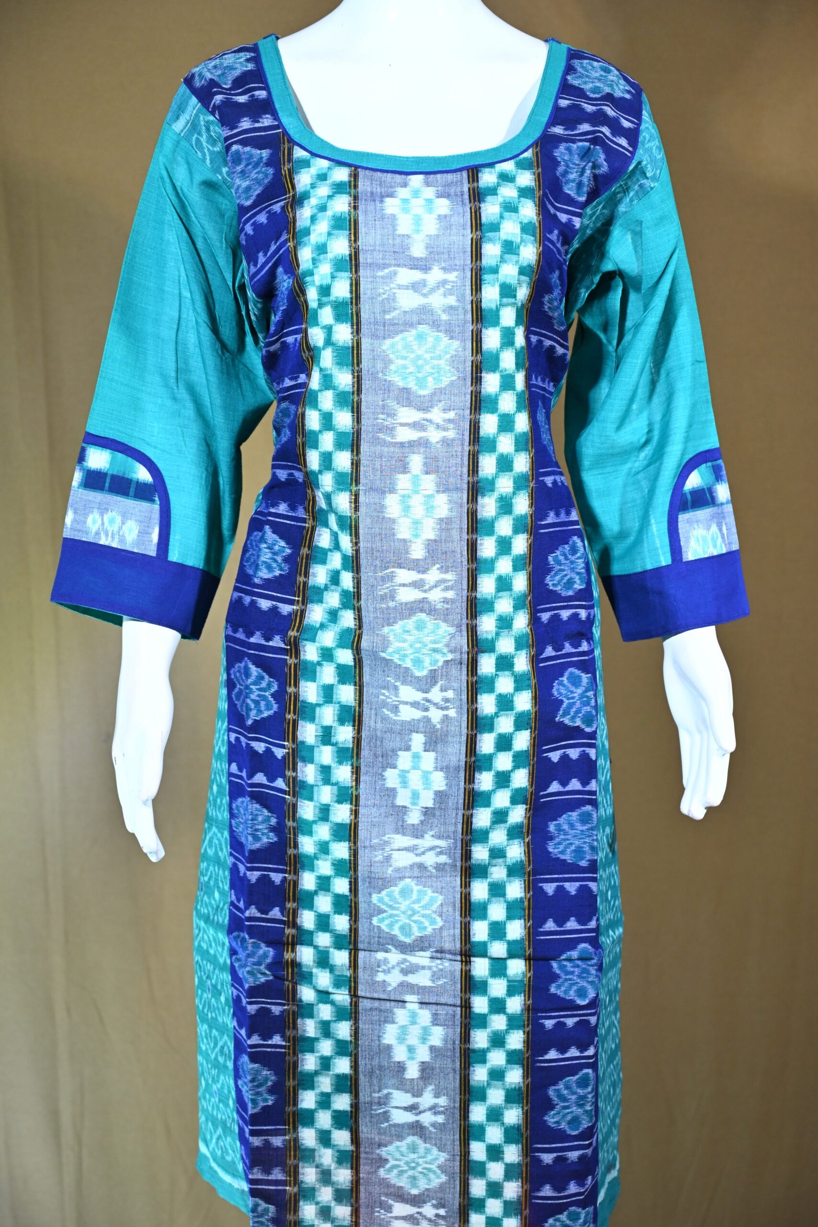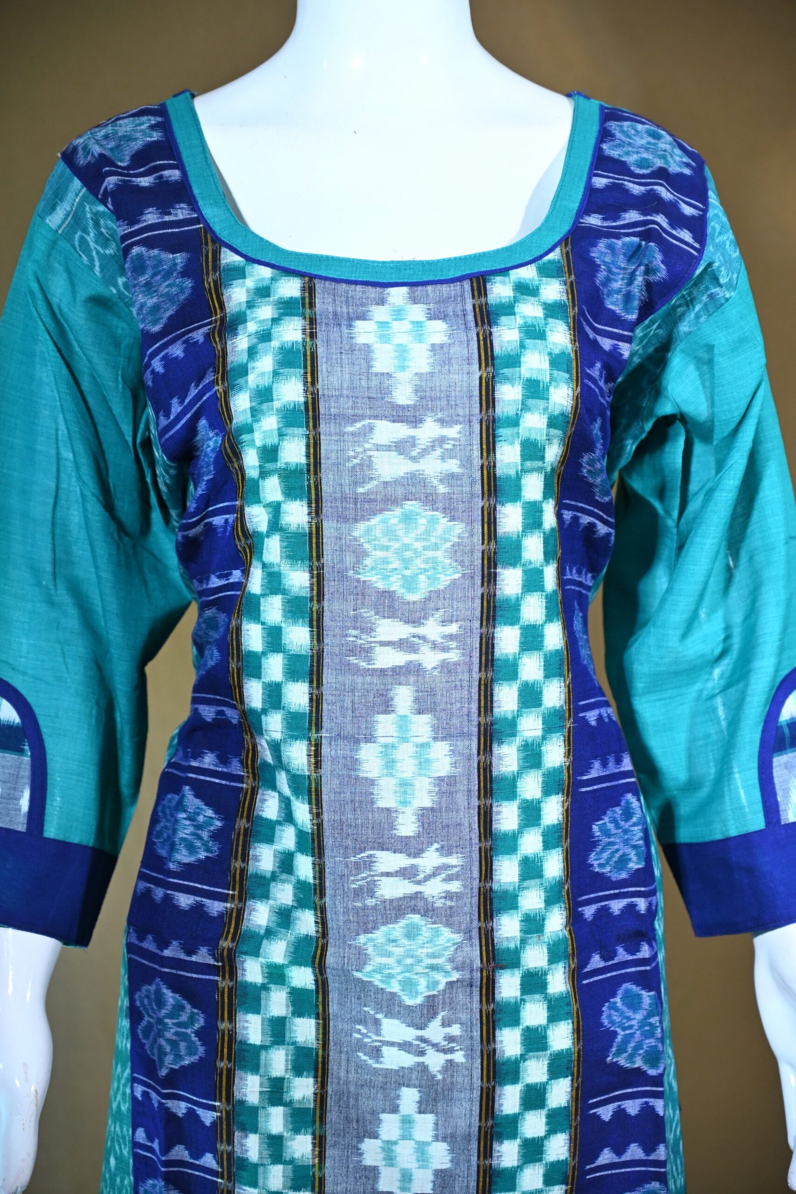 This is a vibrant Sambalpuri cotton Kurti featuring a rich combination of teal and deep blue. The central panel showcases traditional ikat motifs in white and aqua with checkered patterns, bordered by geometric designs. The sleeves are plain teal with contrasting blue cuffs adorned with ikat accents, blending elegance with cultural artistry.