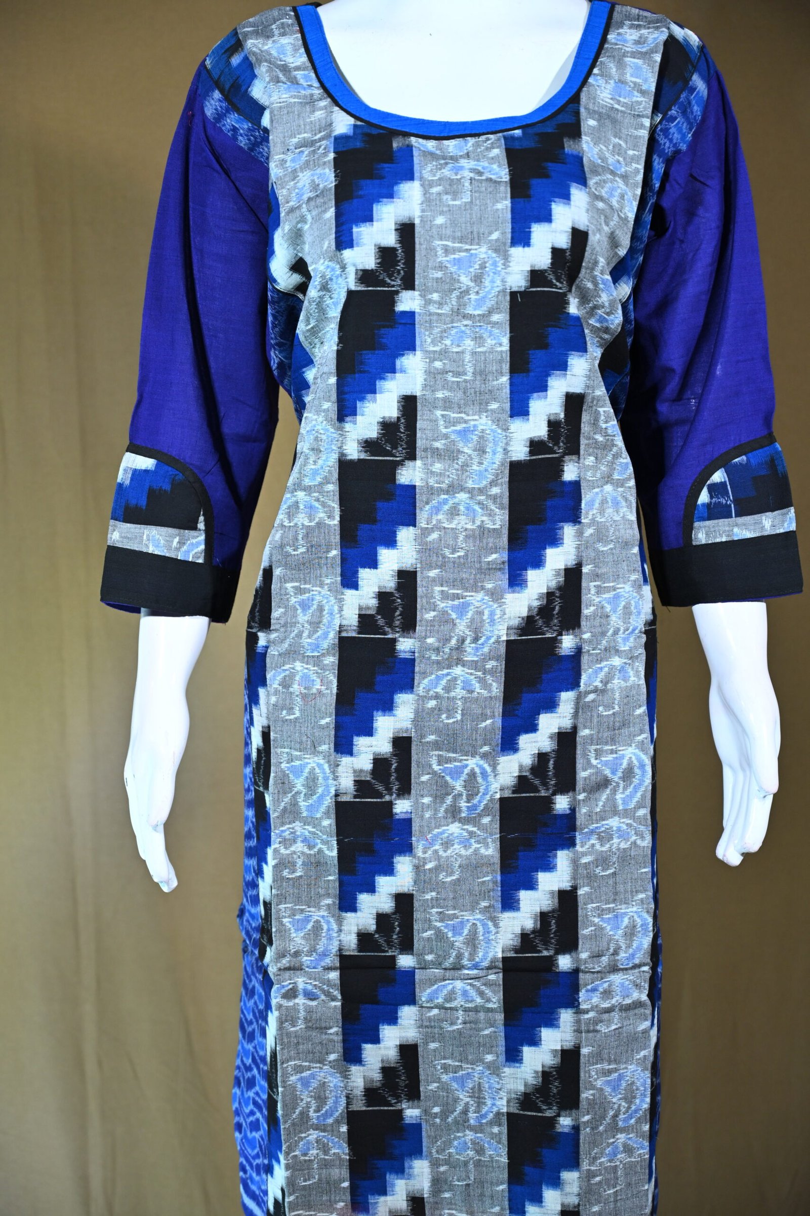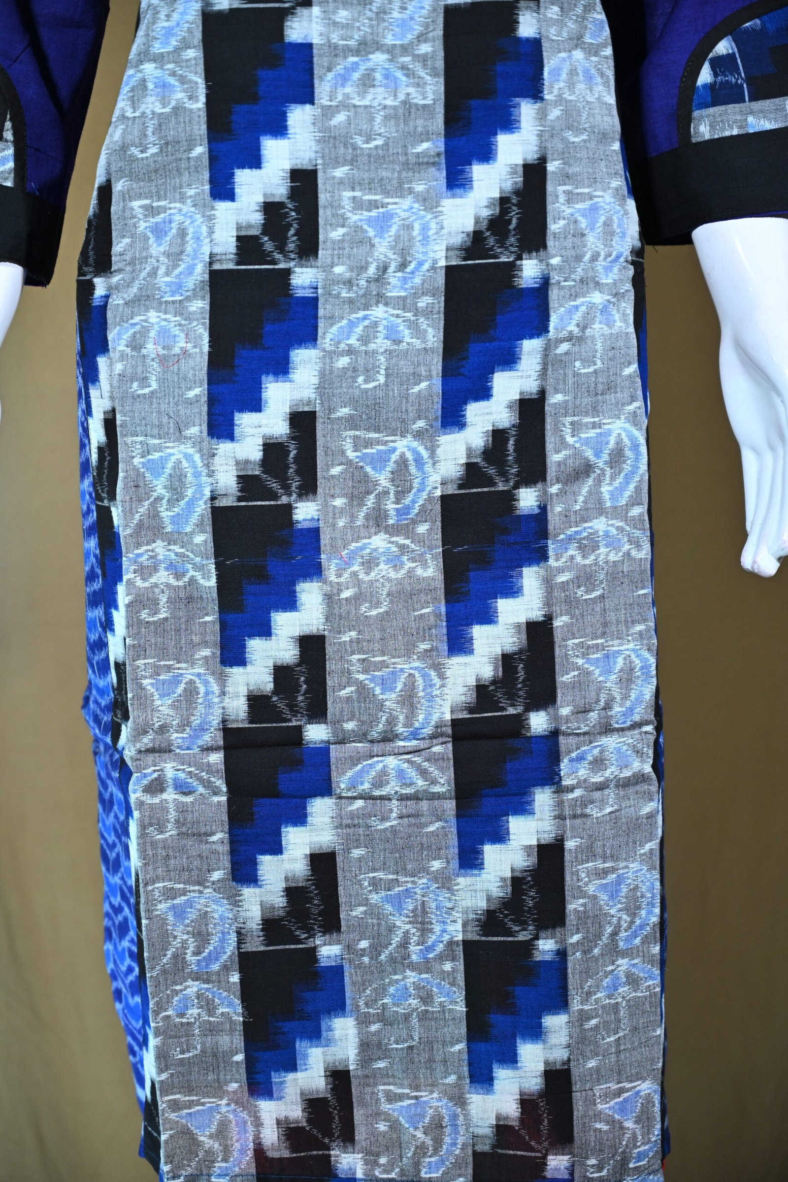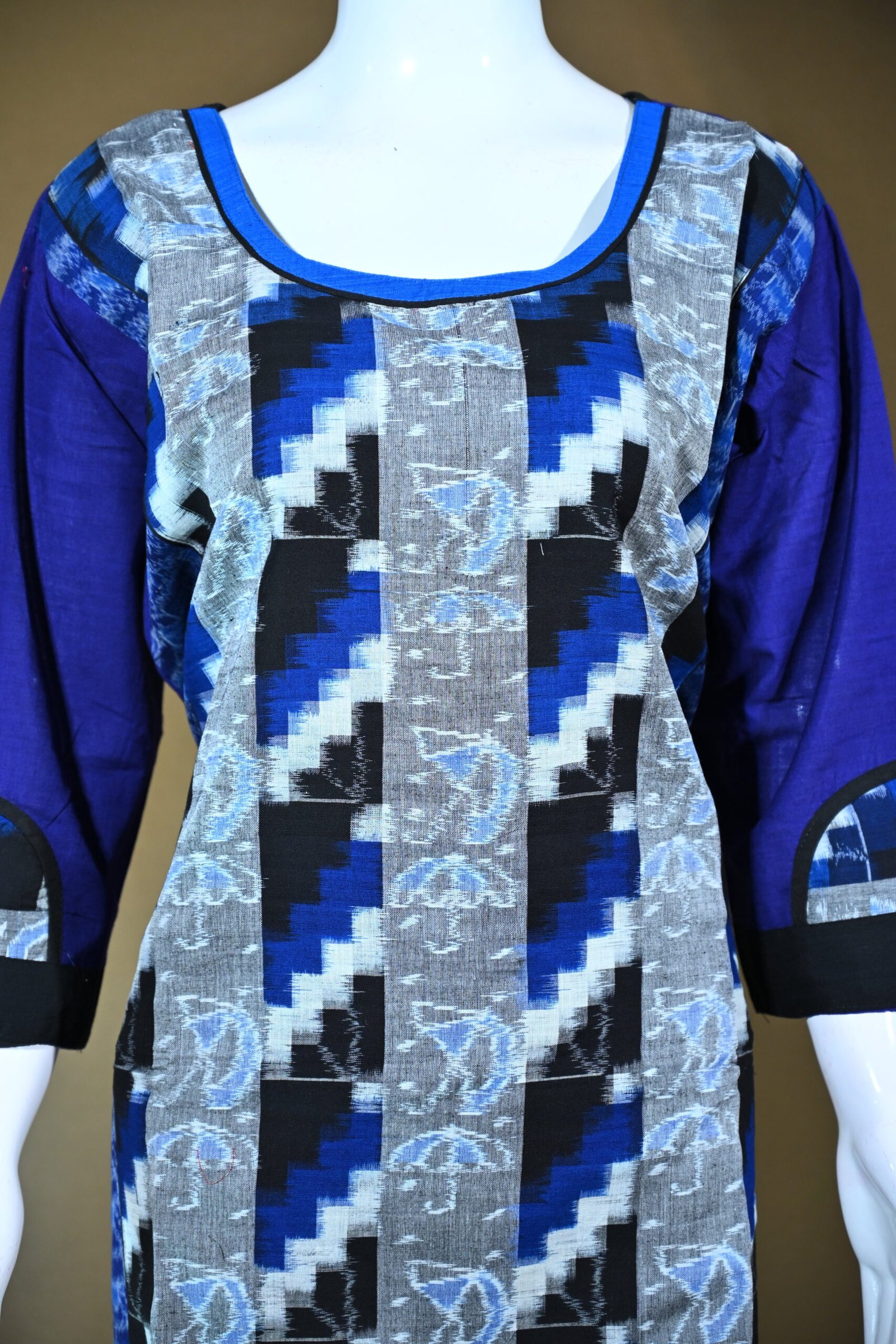 This Sambalpuri cotton kurti features a modern zigzag ikat pattern in shades of blue, black, and white on a grey base. The sleeves are solid deep blue with black cuffs, accented by matching ikat patches, giving it a bold and contemporary ethnic look.