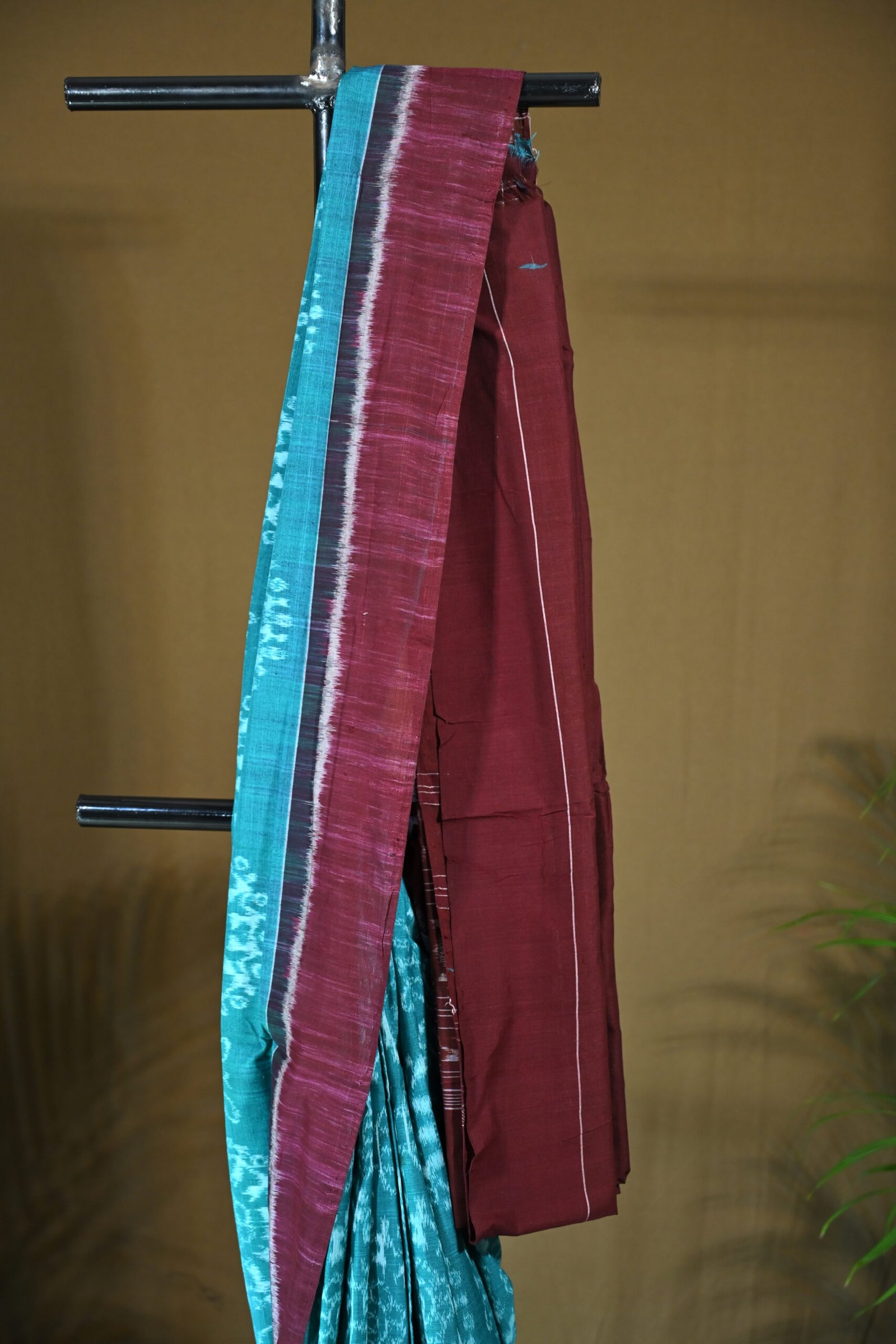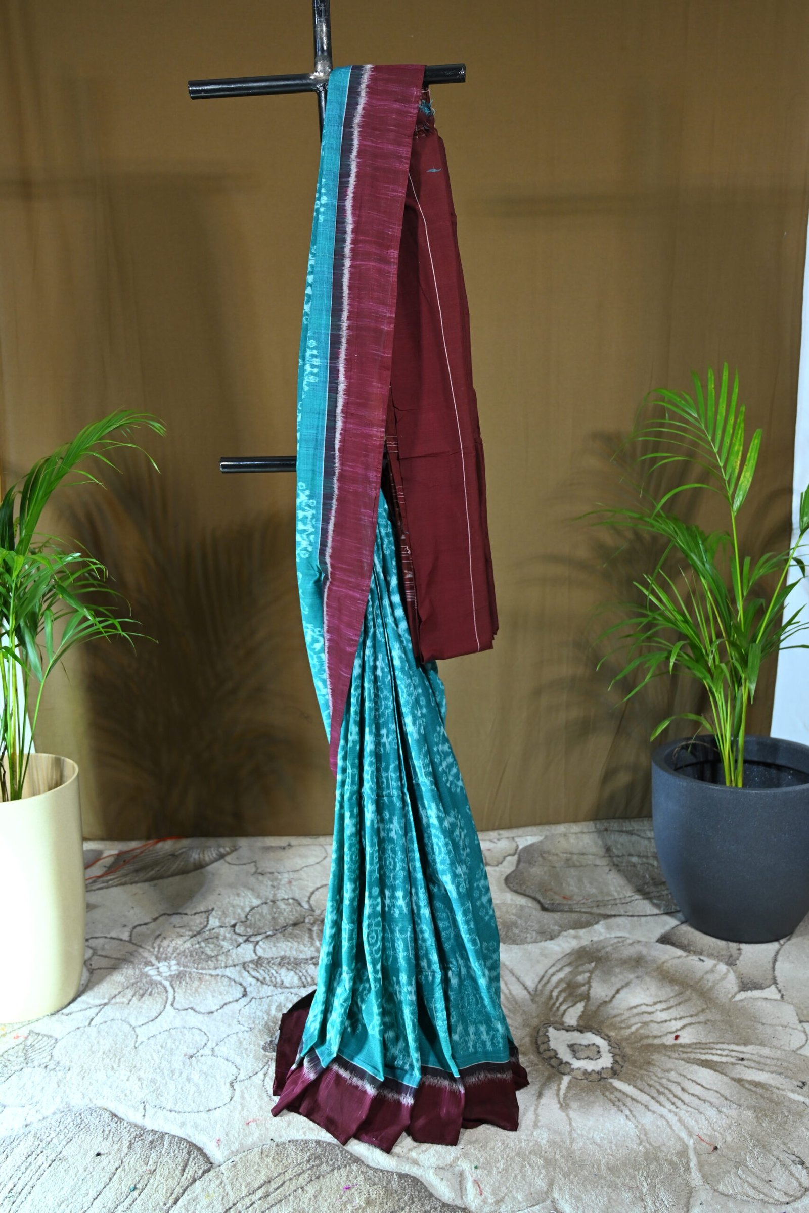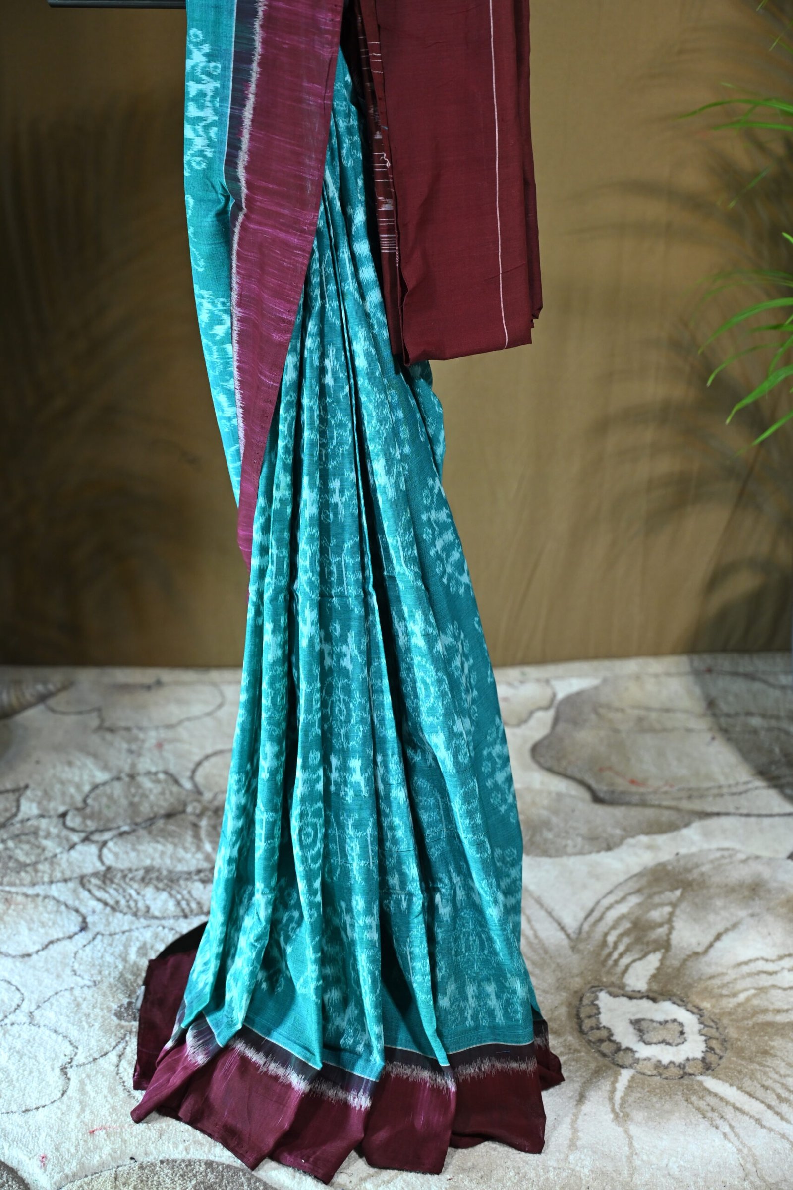 “Teal Elegance: The Maroon-Teal Sambalpuri Ikat Masterpiece”