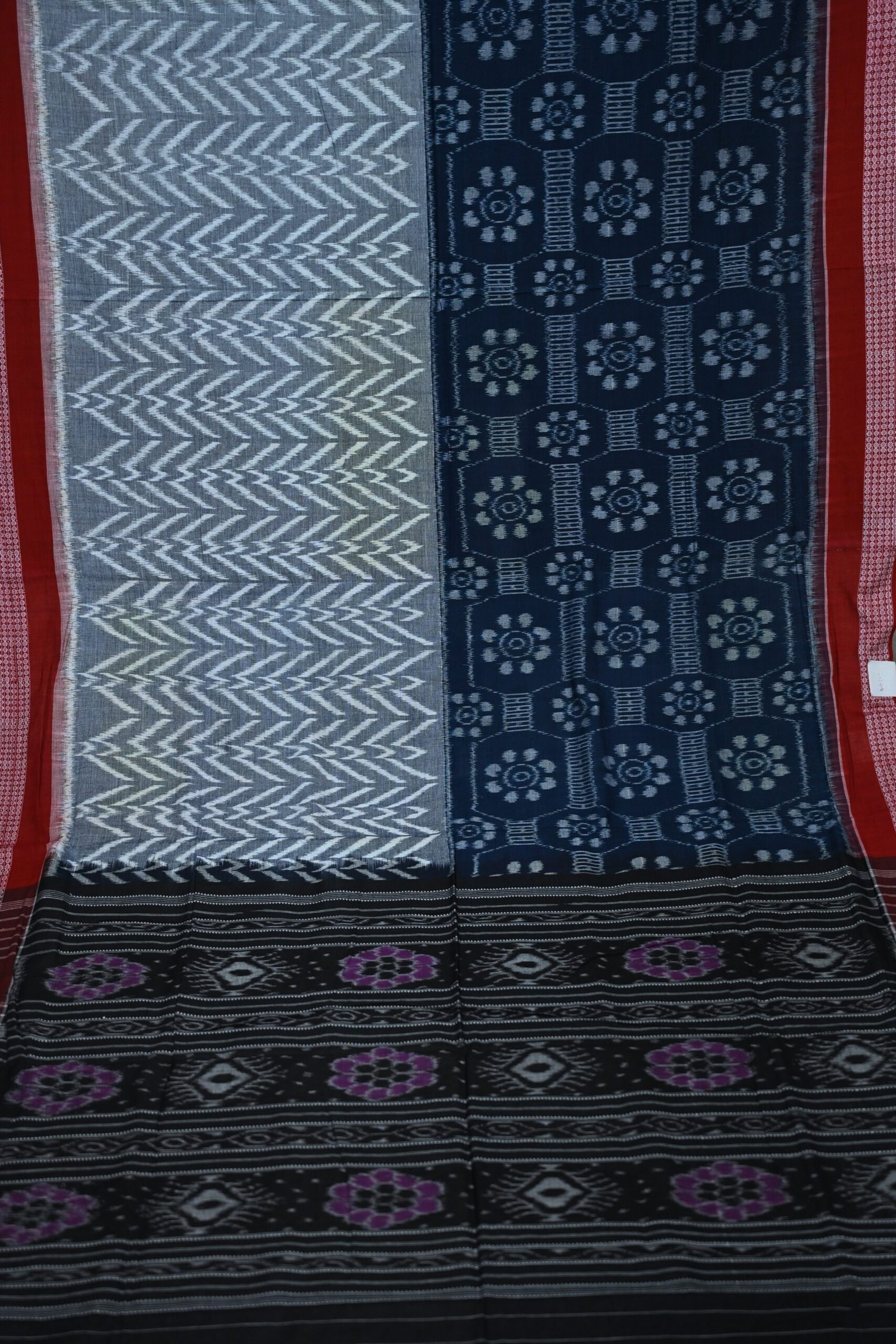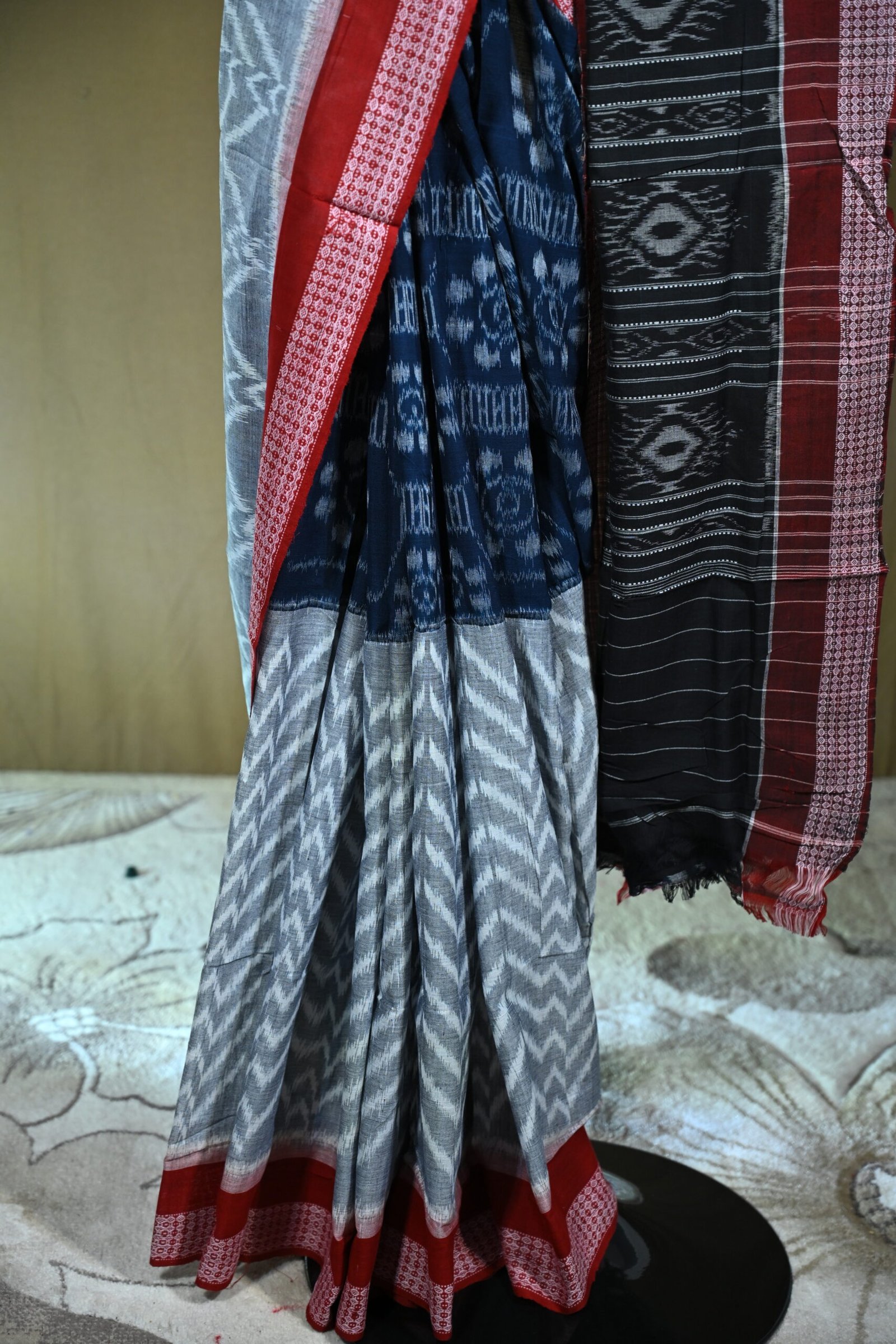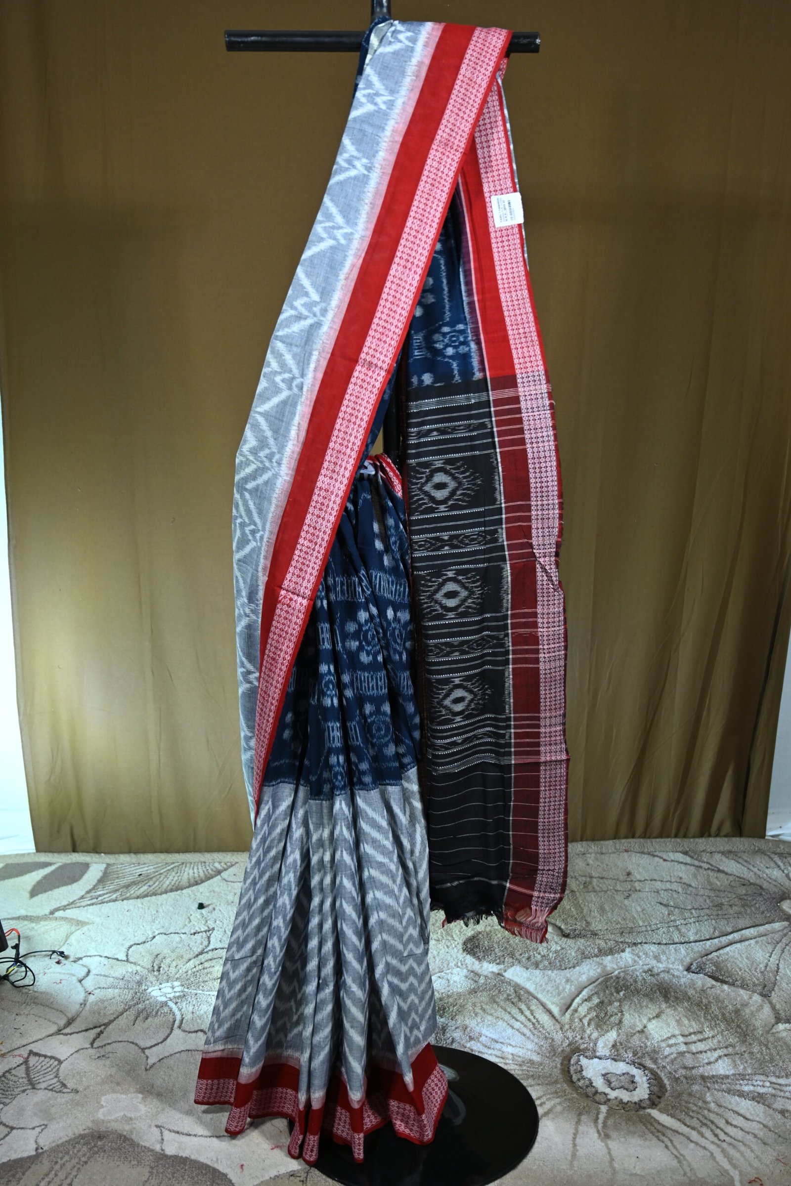 This Sambalpuri saree features a sophisticated blend of grey, red, black, and blue with traditional ikat artistry.