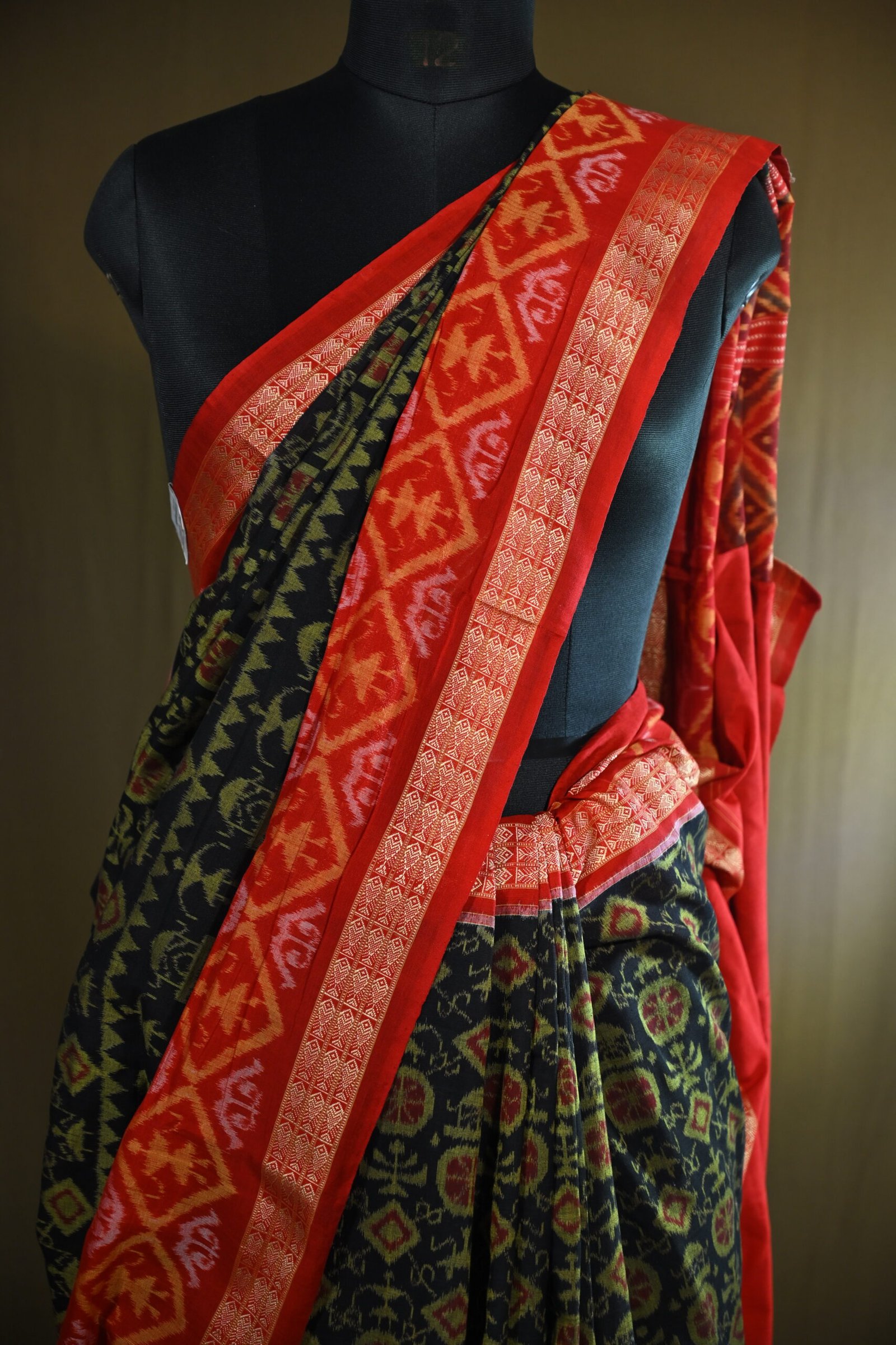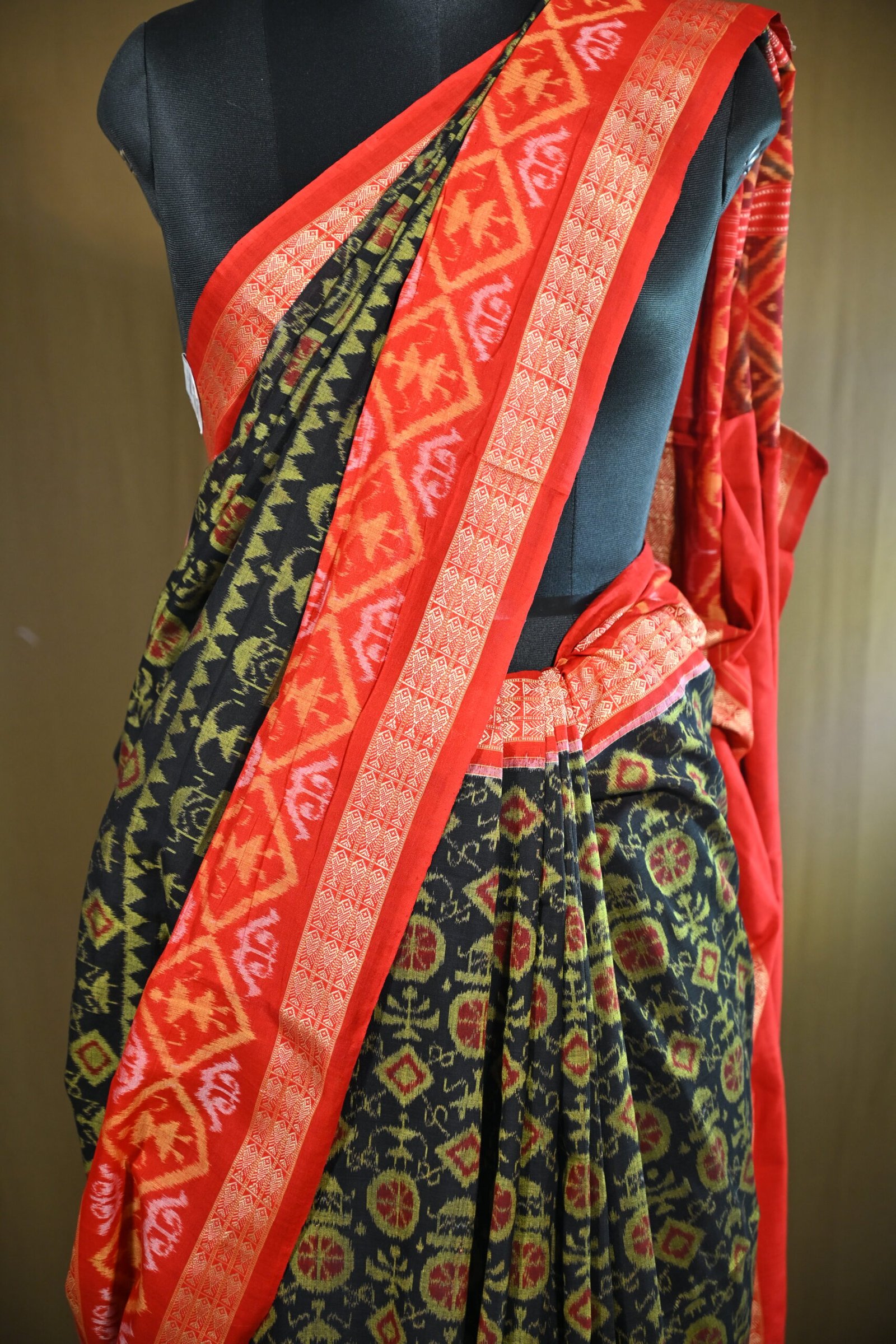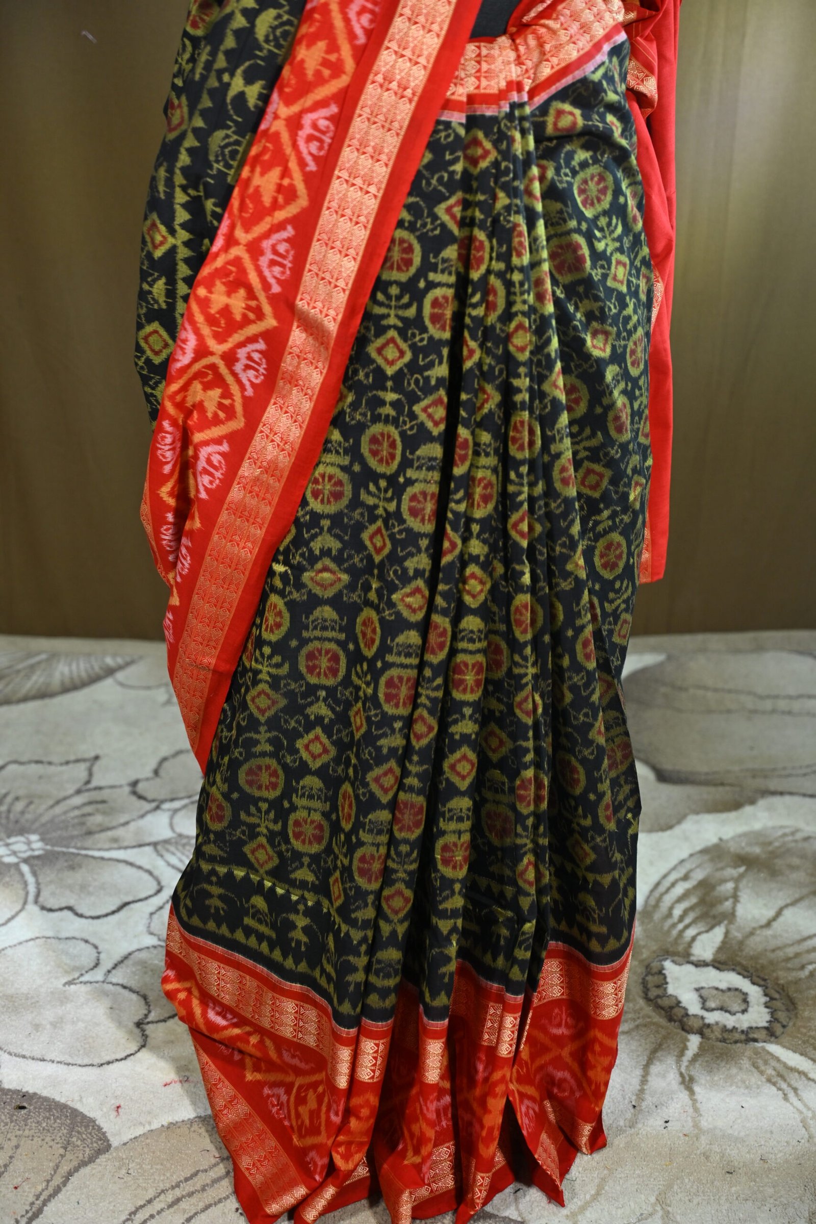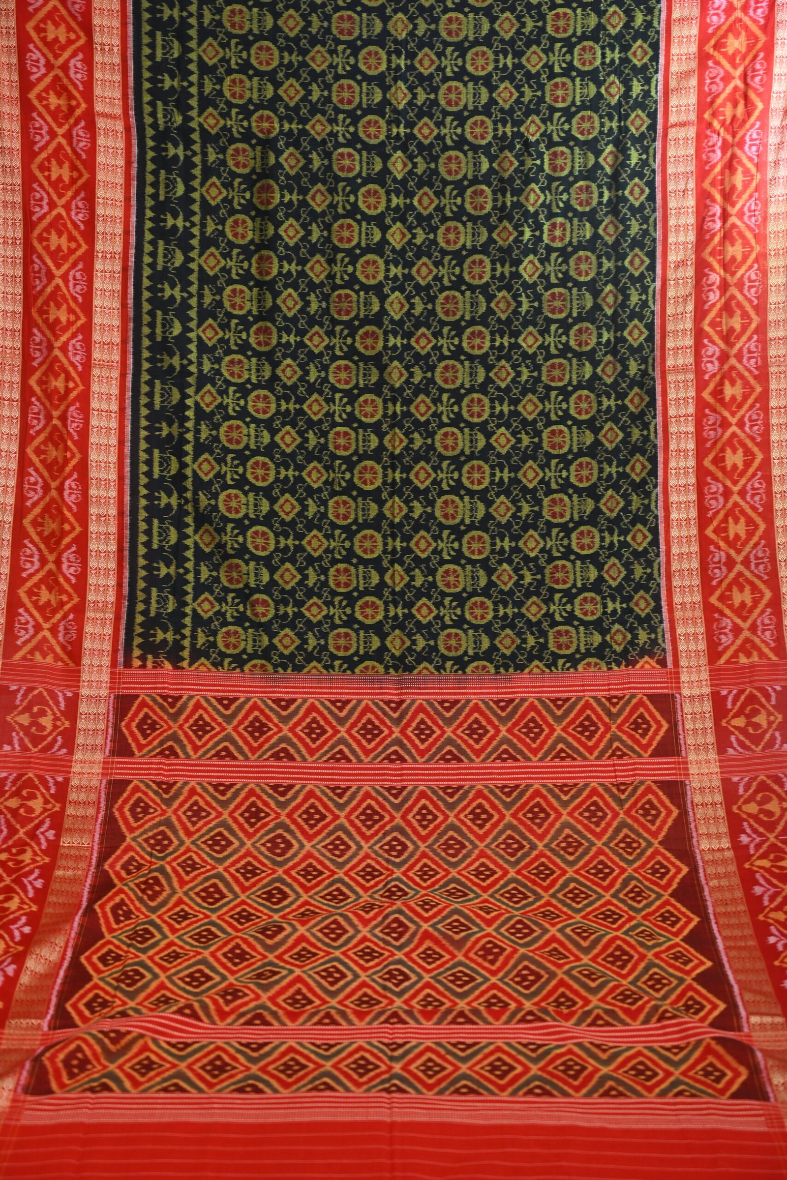 The body features geometric and floral motifs typical of Sambalpuri designs. These motifs are intricately woven using the tie-dye Ikat technique.