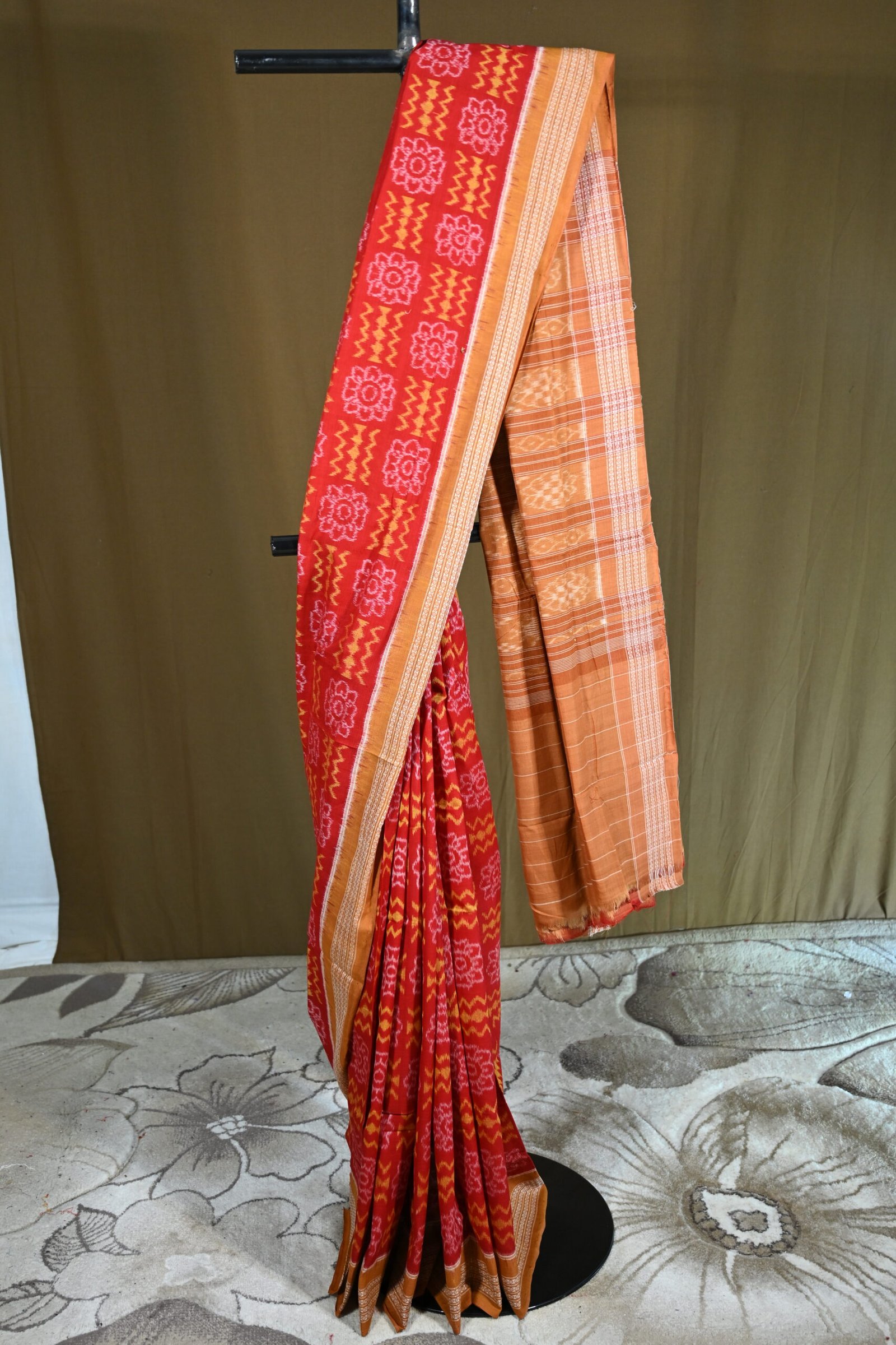 The pallu (end piece) shifts to a warm ochre-orange shade, showcasing fine white check lines and subtle Ikat patterns, giving a softer, elegant contrast to the bright red body.