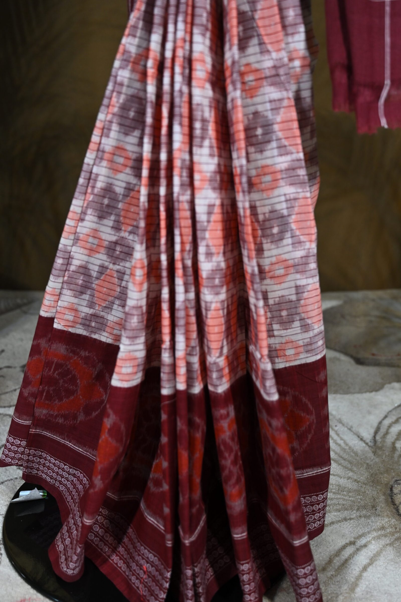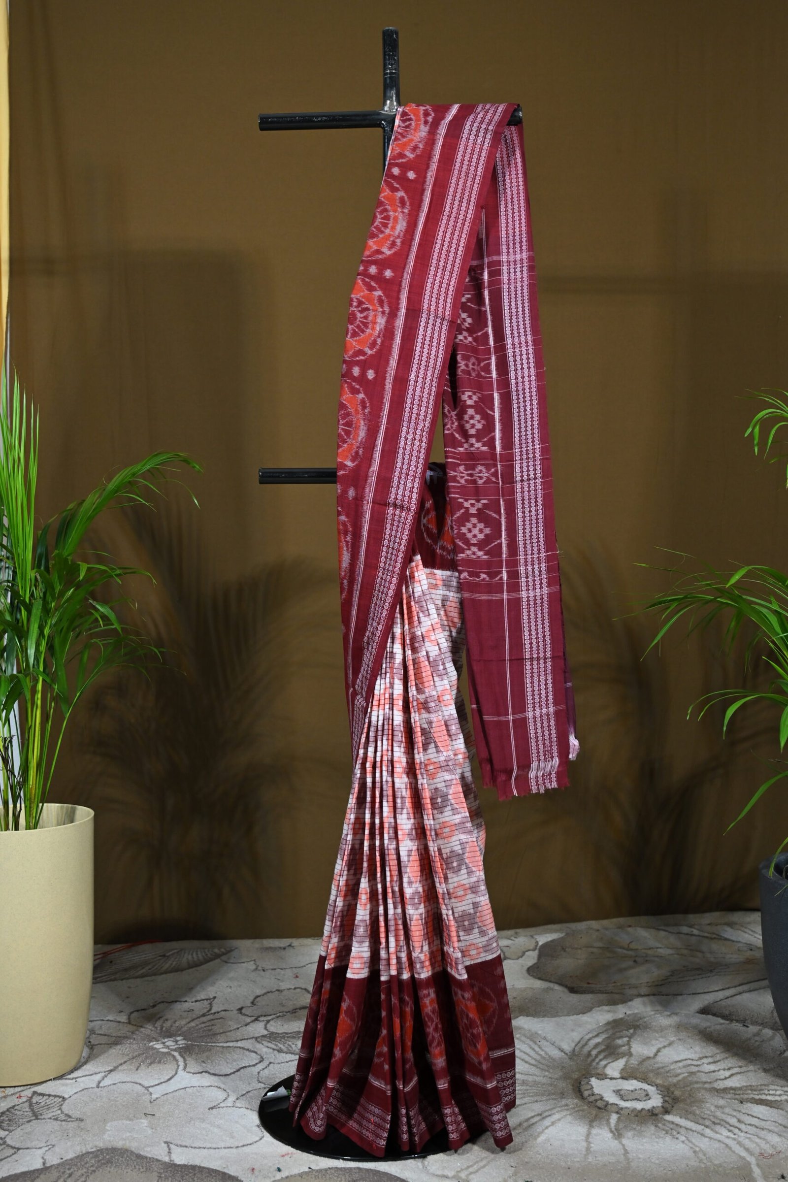 Maroon & White Sambalpuri Ikat Cotton Saree with Traditional Motifs