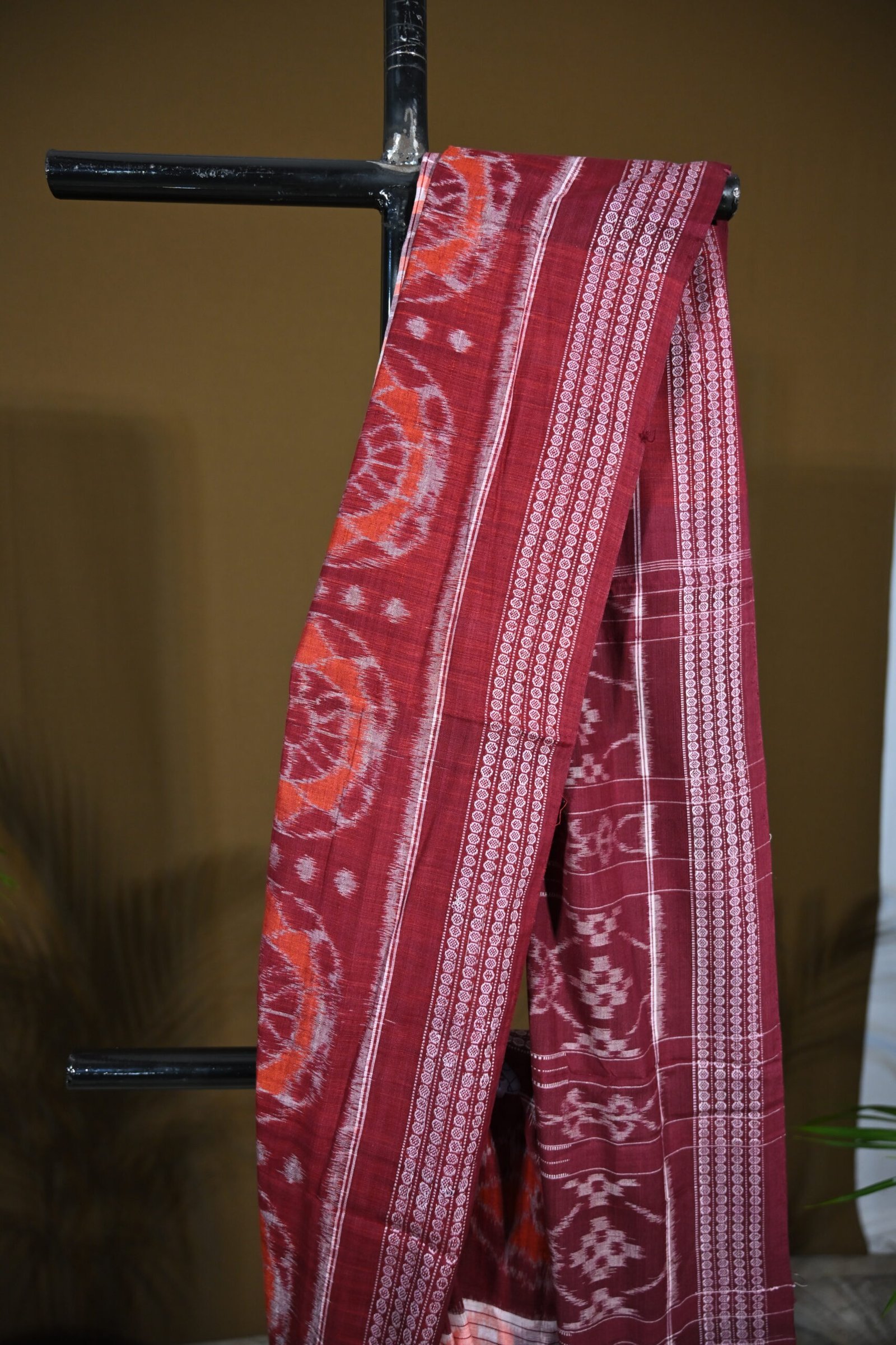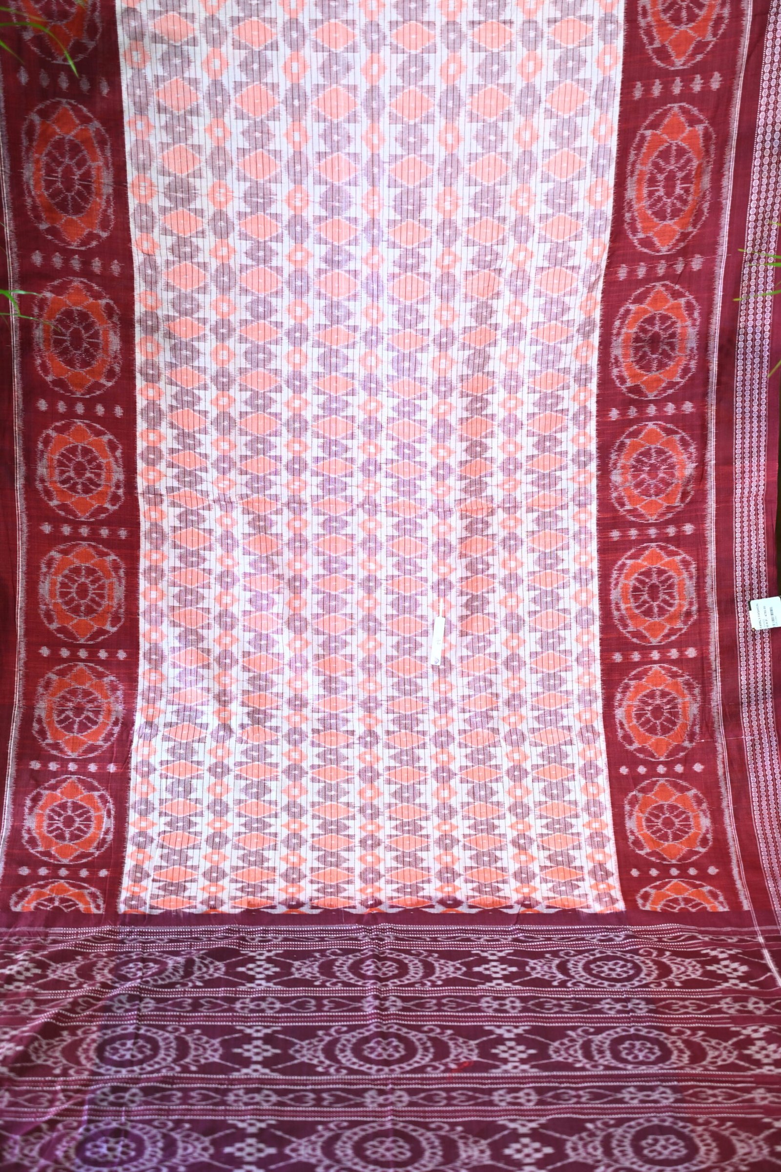 This elegant Sambalpuri saree features a rich maroon base with intricate white and orange ikat patterns across the pallu and borders. The body blends light pinkish-white hues with abstract traditional designs, creating a subtle yet refined look. Perfect for ethnic occasions and cultural celebrations.
