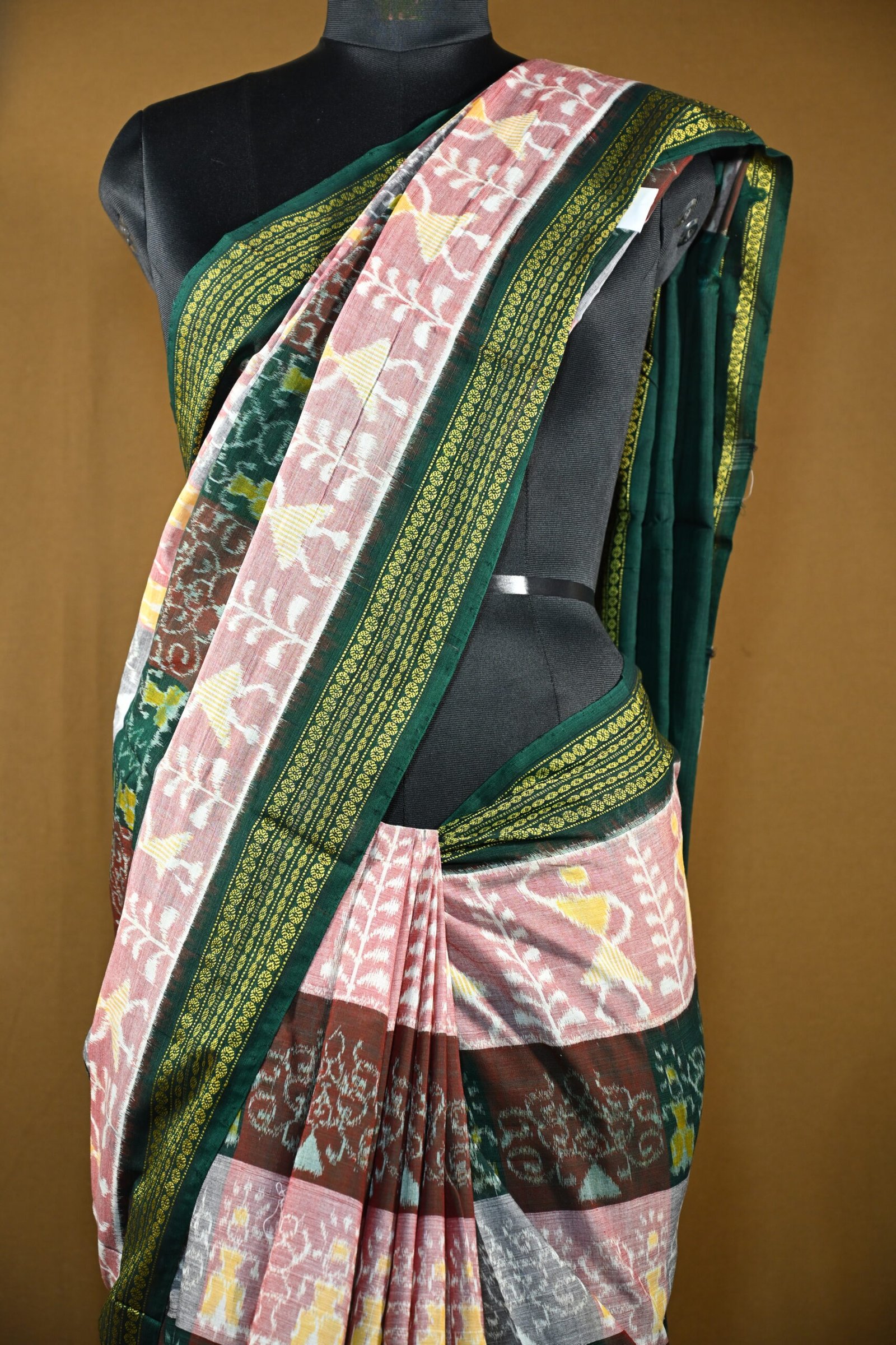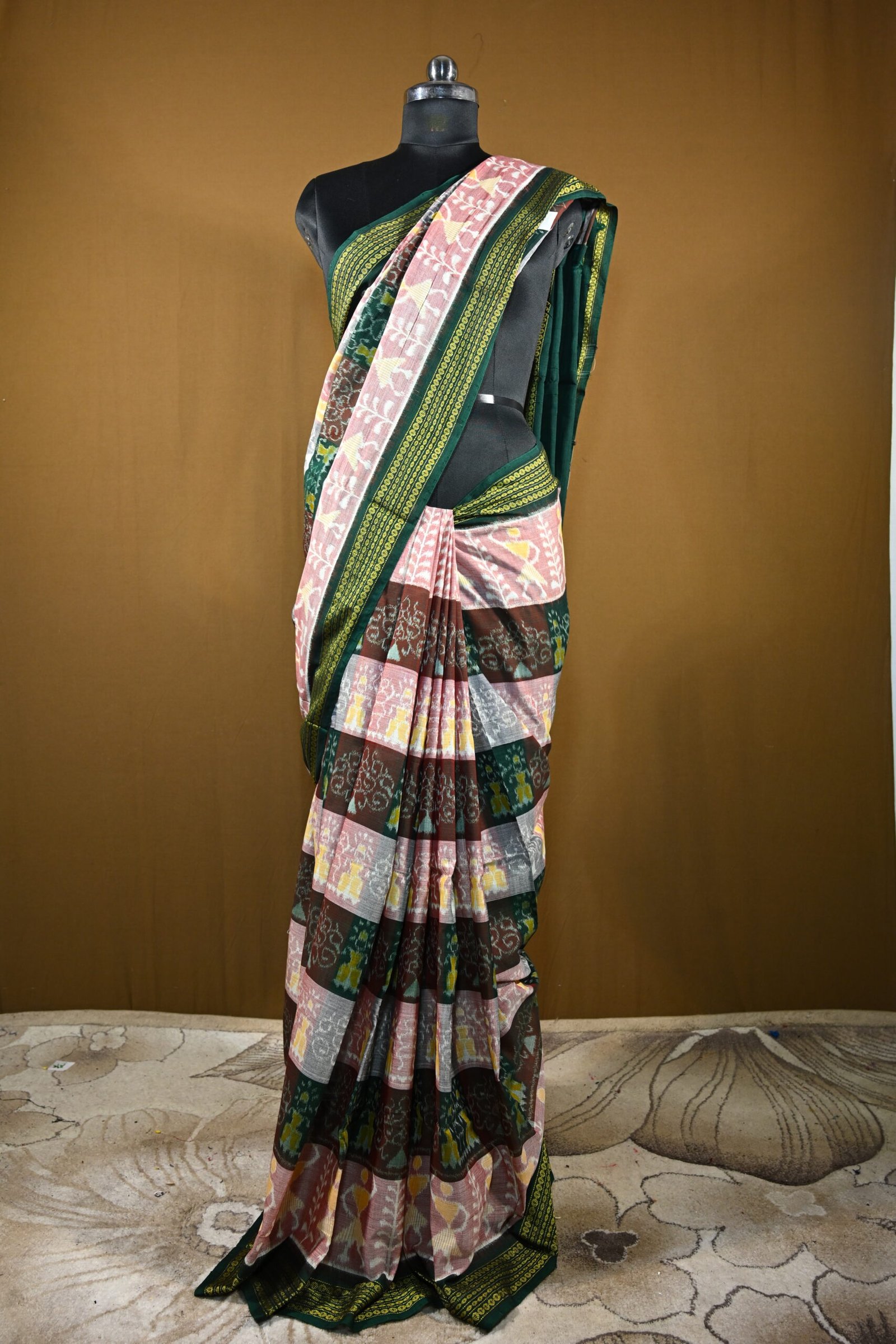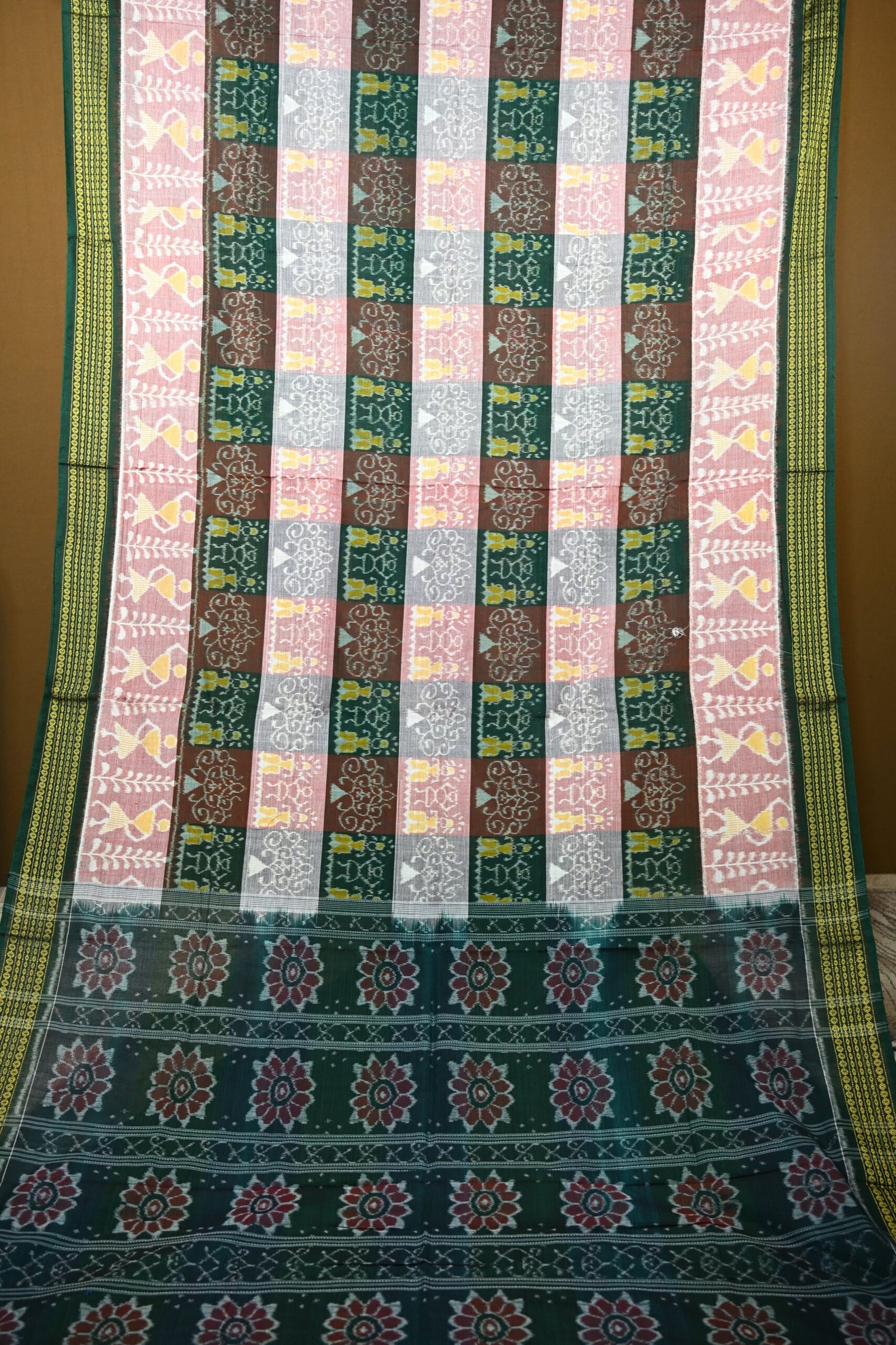 Pure Sambalpuri Cotton Saree – Multi-Color Checkered Ikat with Green Border