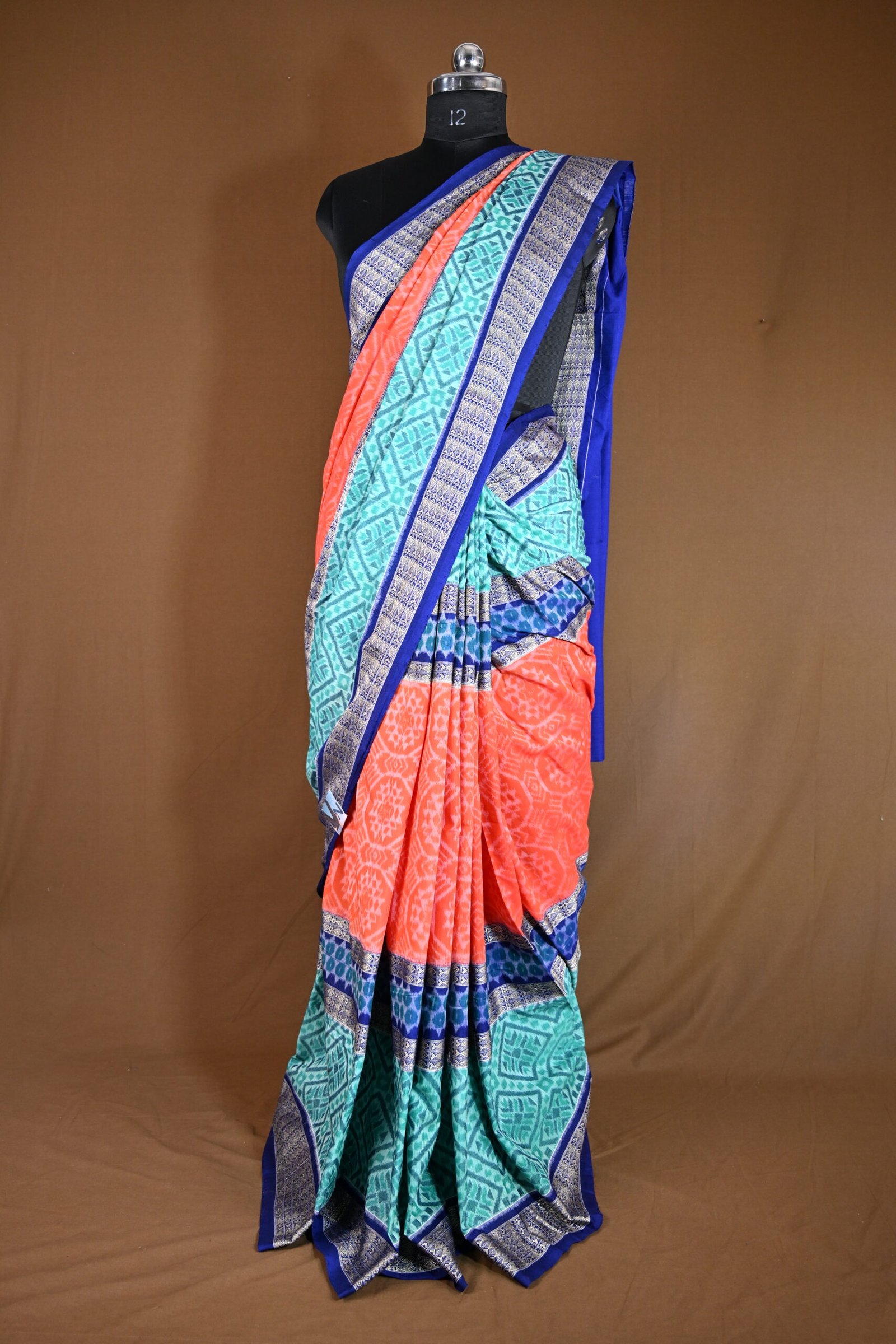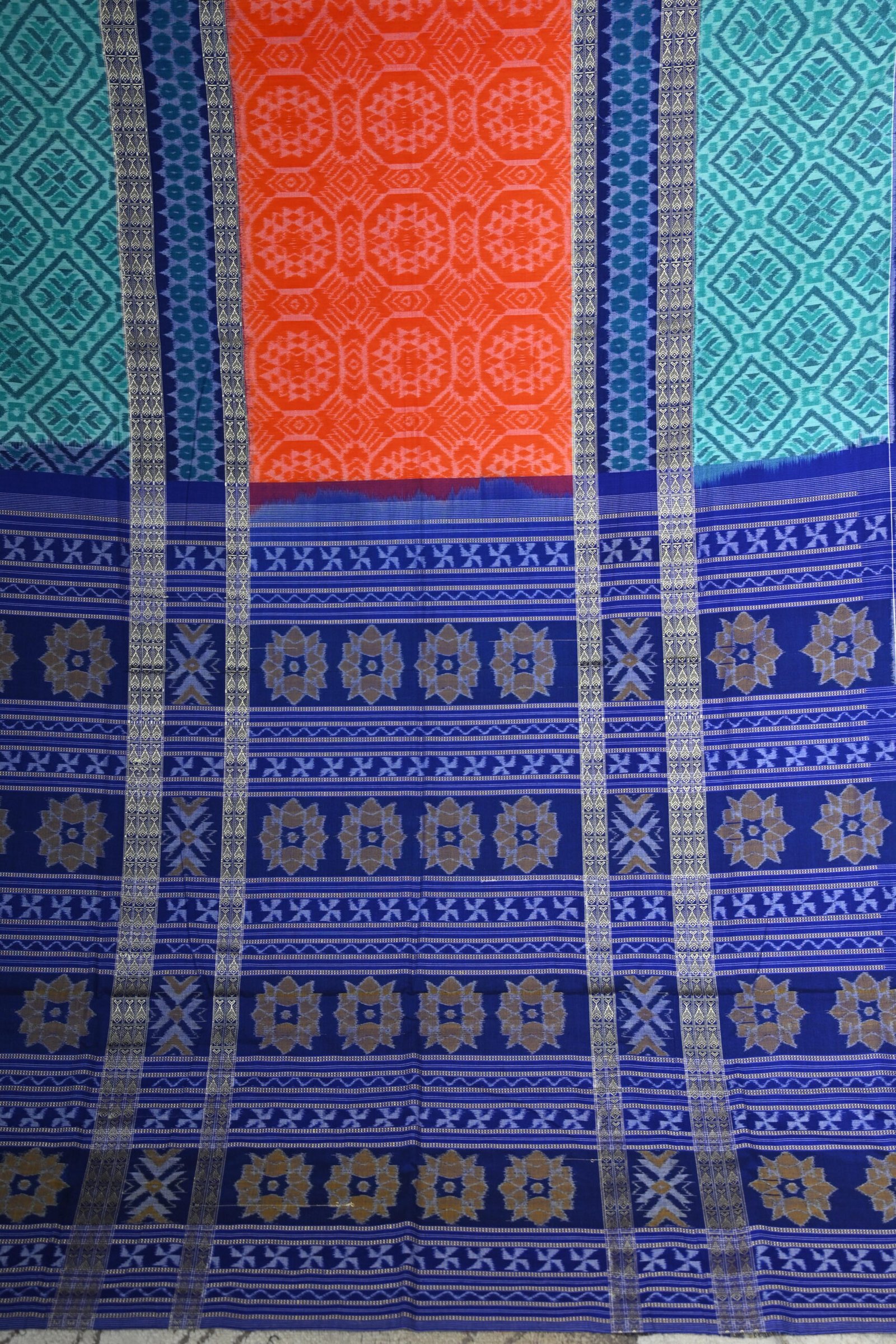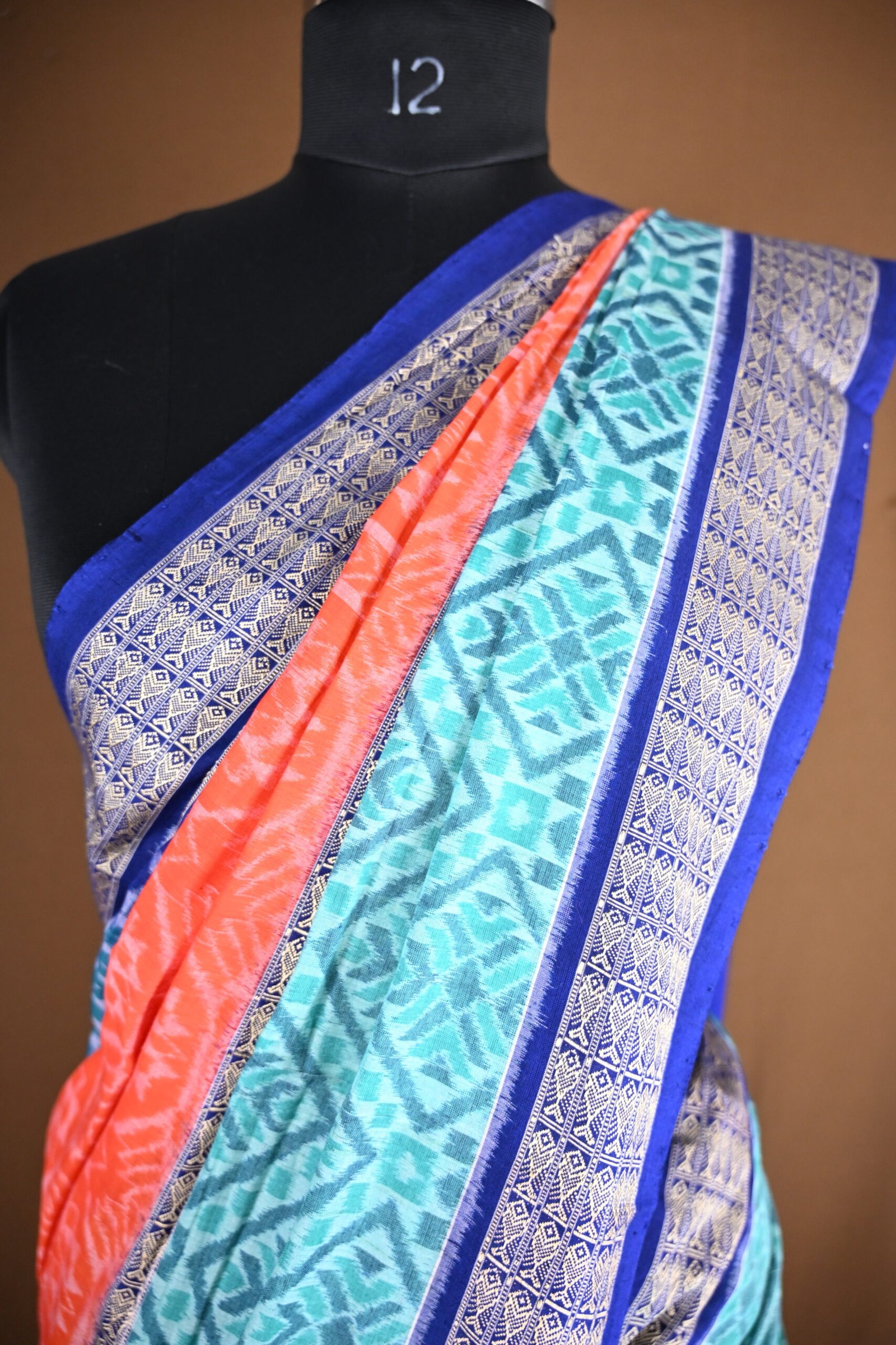 a vibrant dual-tone design with turquoise green and bright coral-orange body, adorned with traditional Ikat patterns. It is framed by a deep blue border with SIX golden FISH BORDER work, adding an elegant contrast. The pallu continues the intricate motifs in matching shades, giving it a rich and festive appeal.
