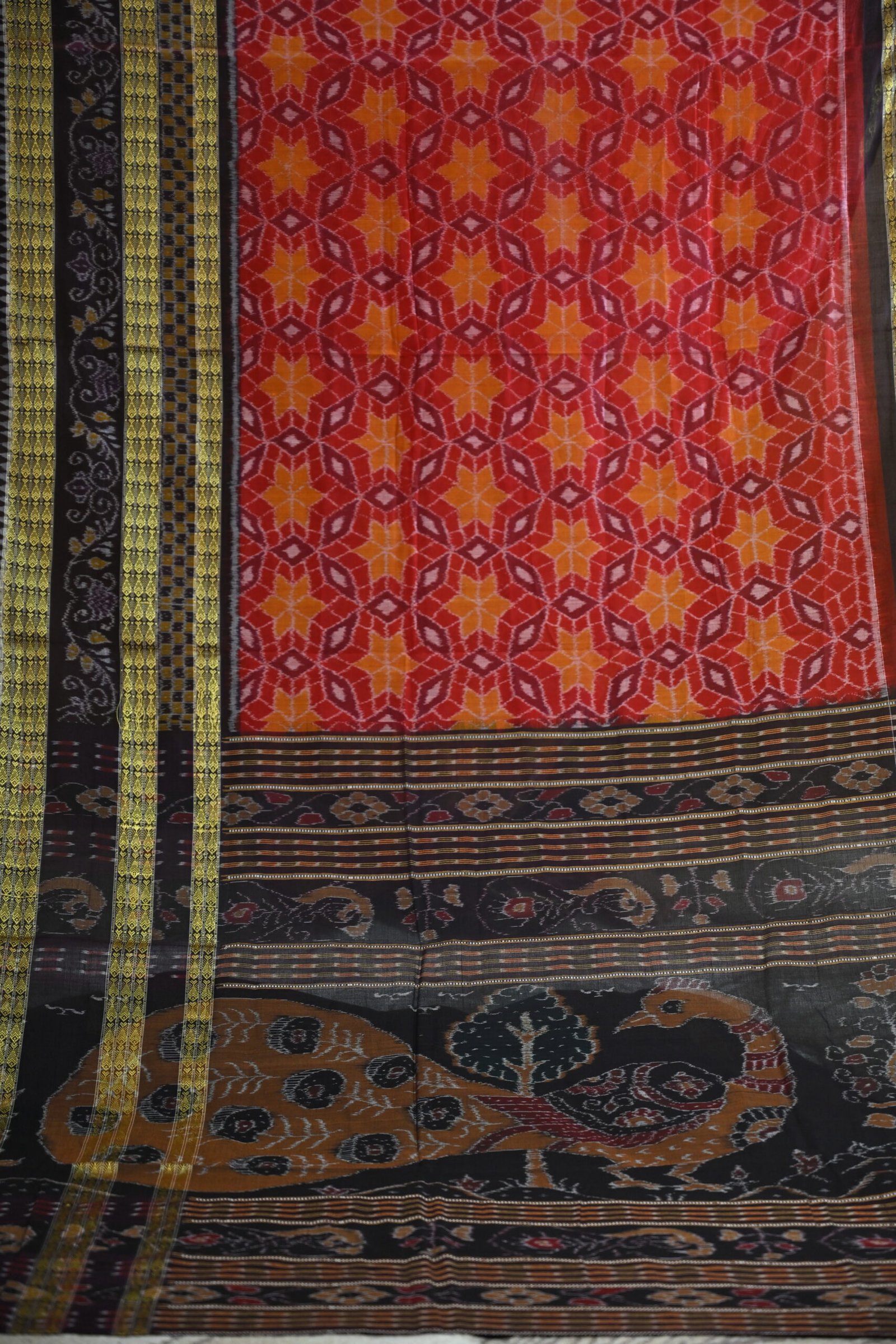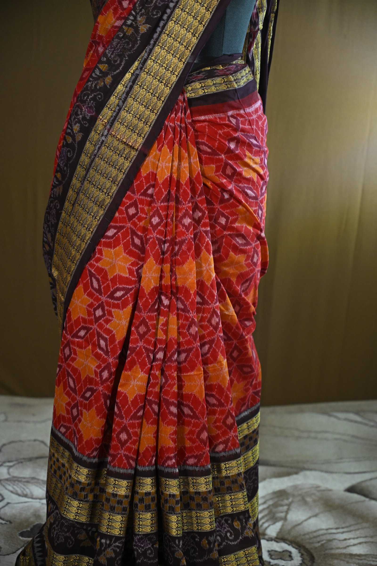 Continuation of the red base with Ikat motifs at the top and black-golden zari patterning towards the bottom.