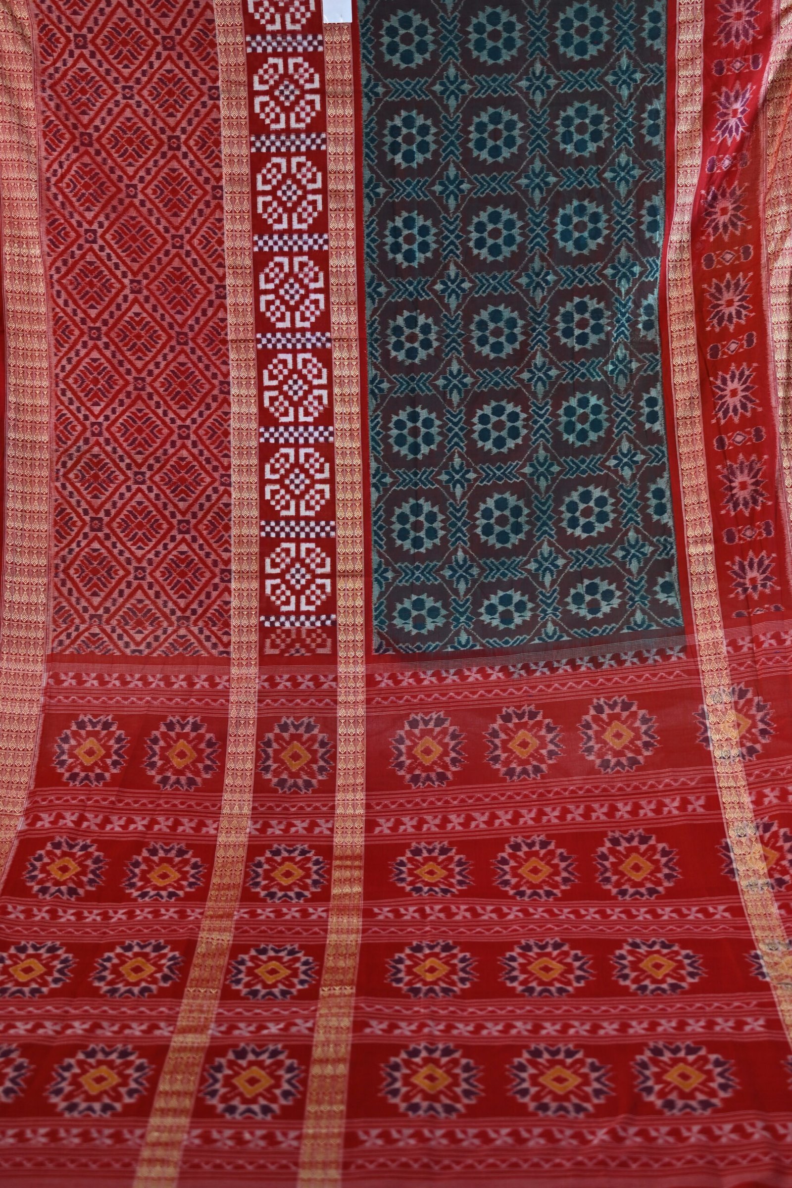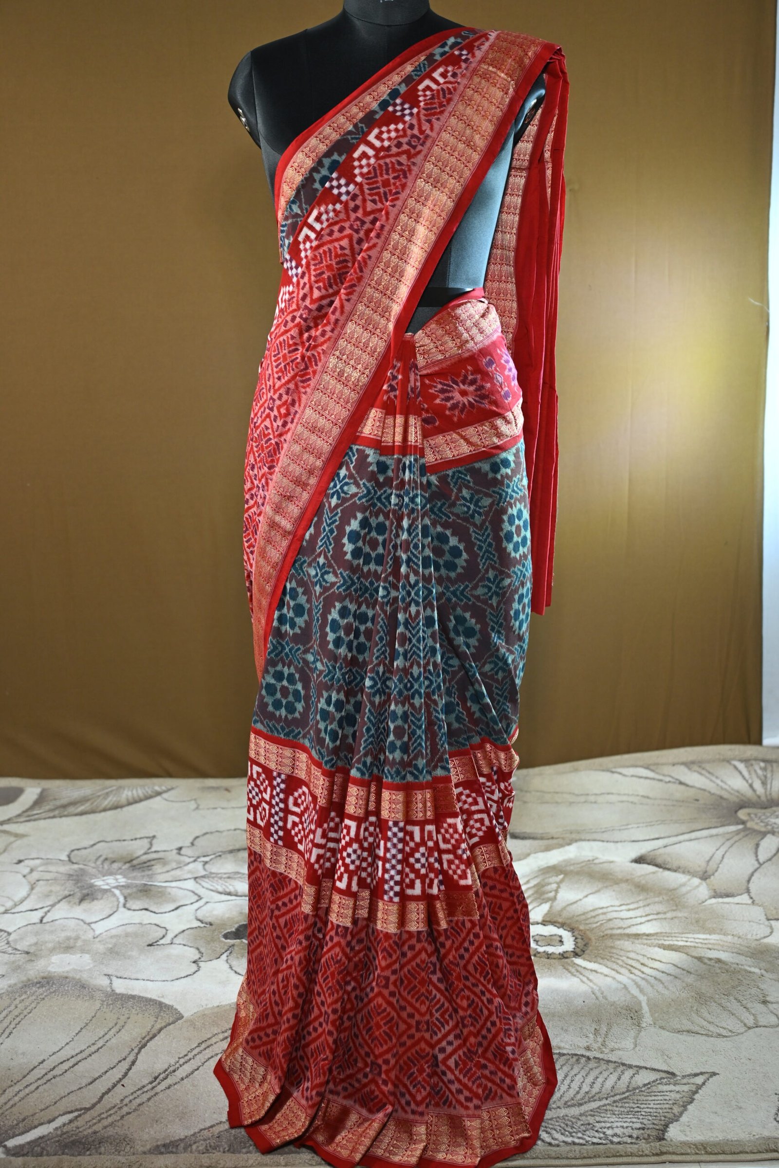 Pleats Section: Alternates between red Ikat patterns and teal floral patterns.