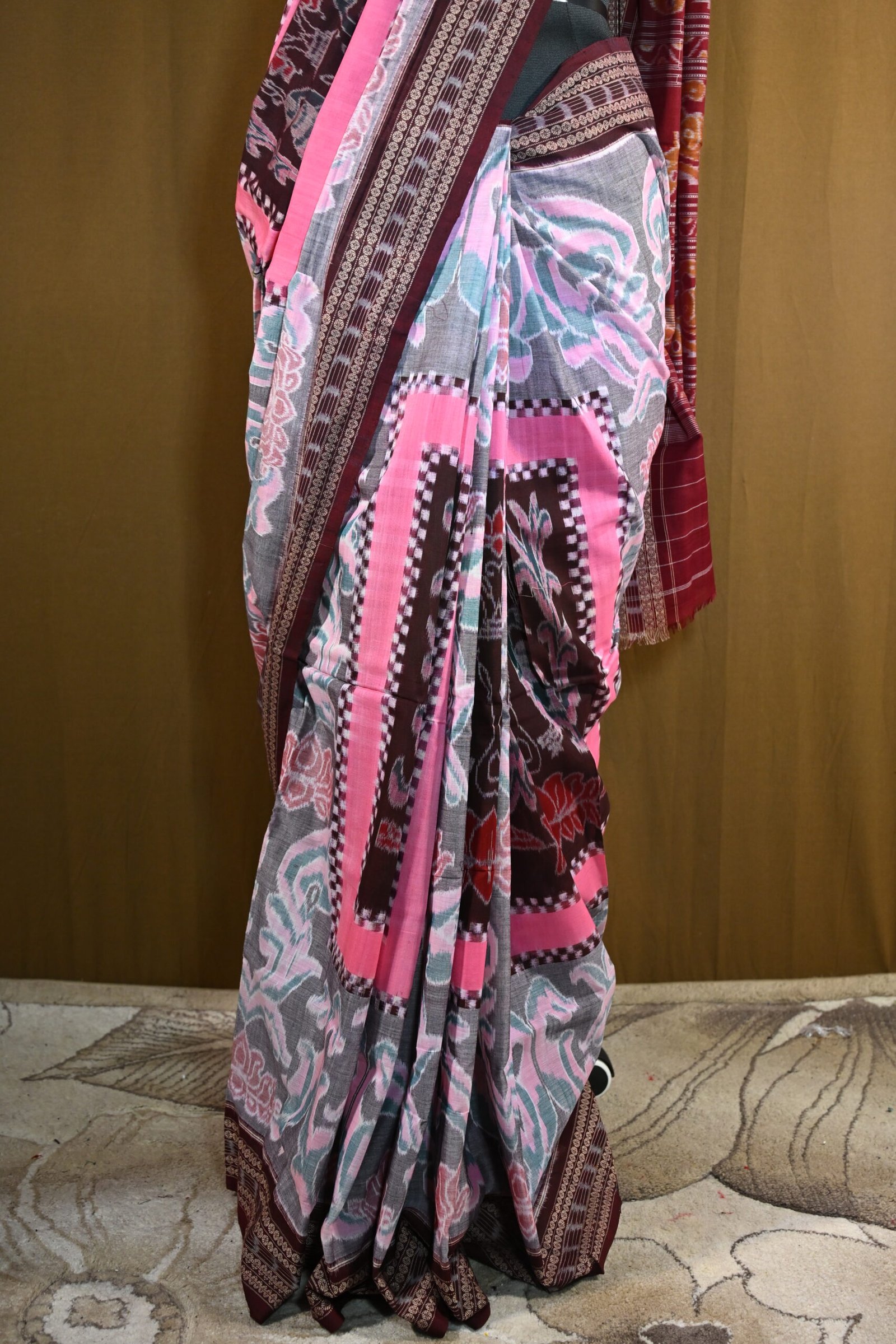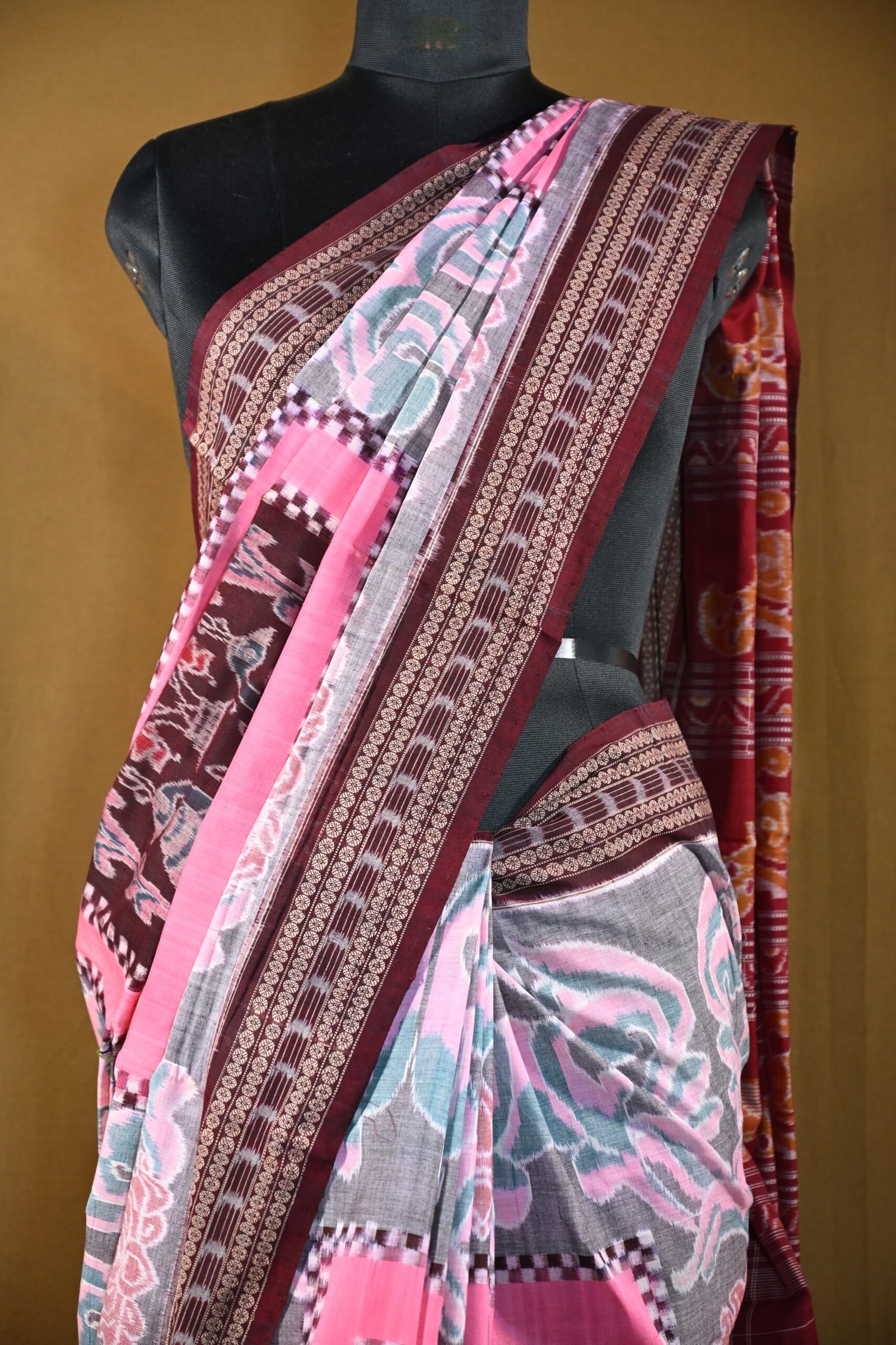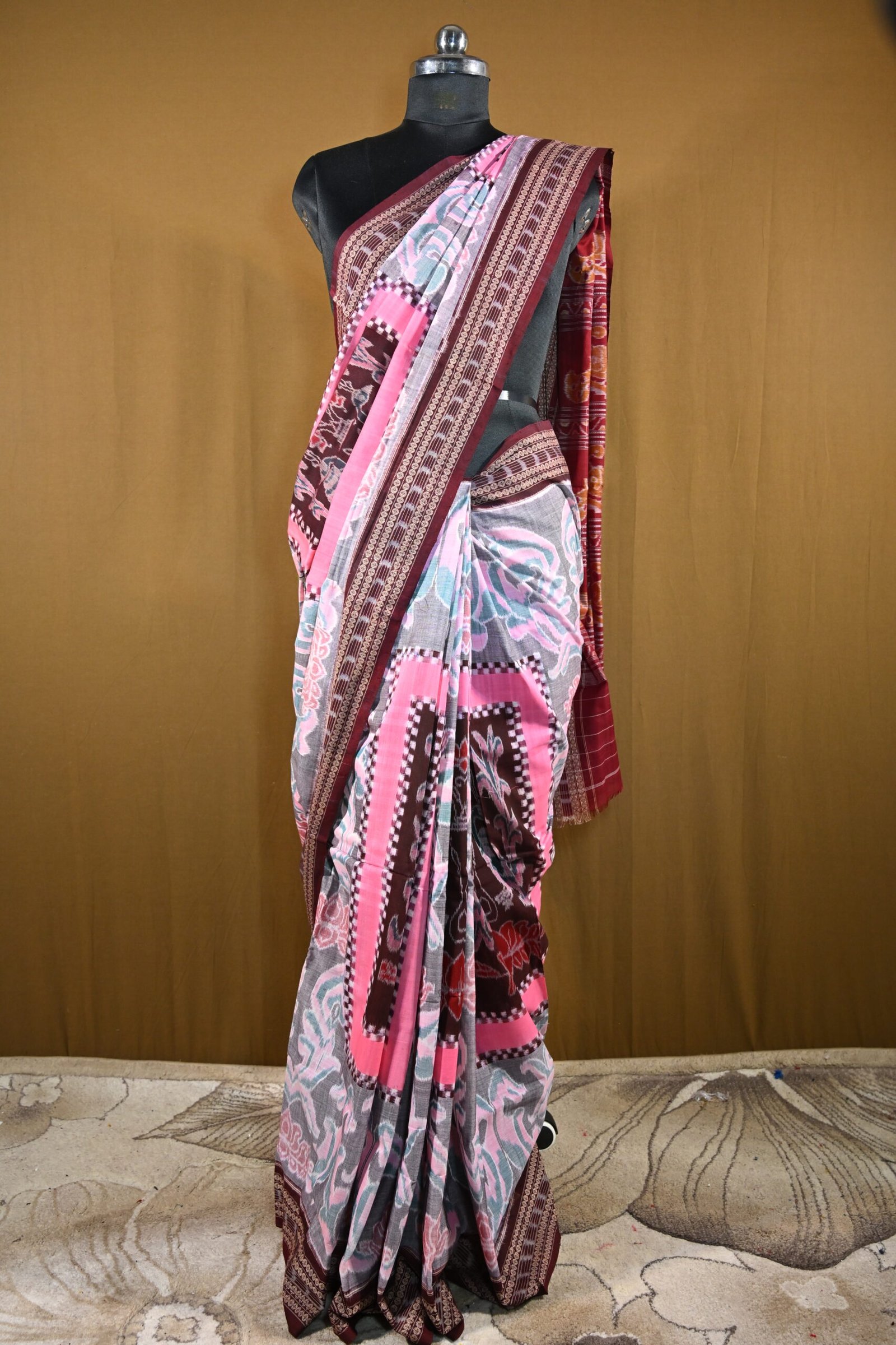 Pure Sambalpuri Cotton Saree – Pink & Maroon Handwoven Ikat Design