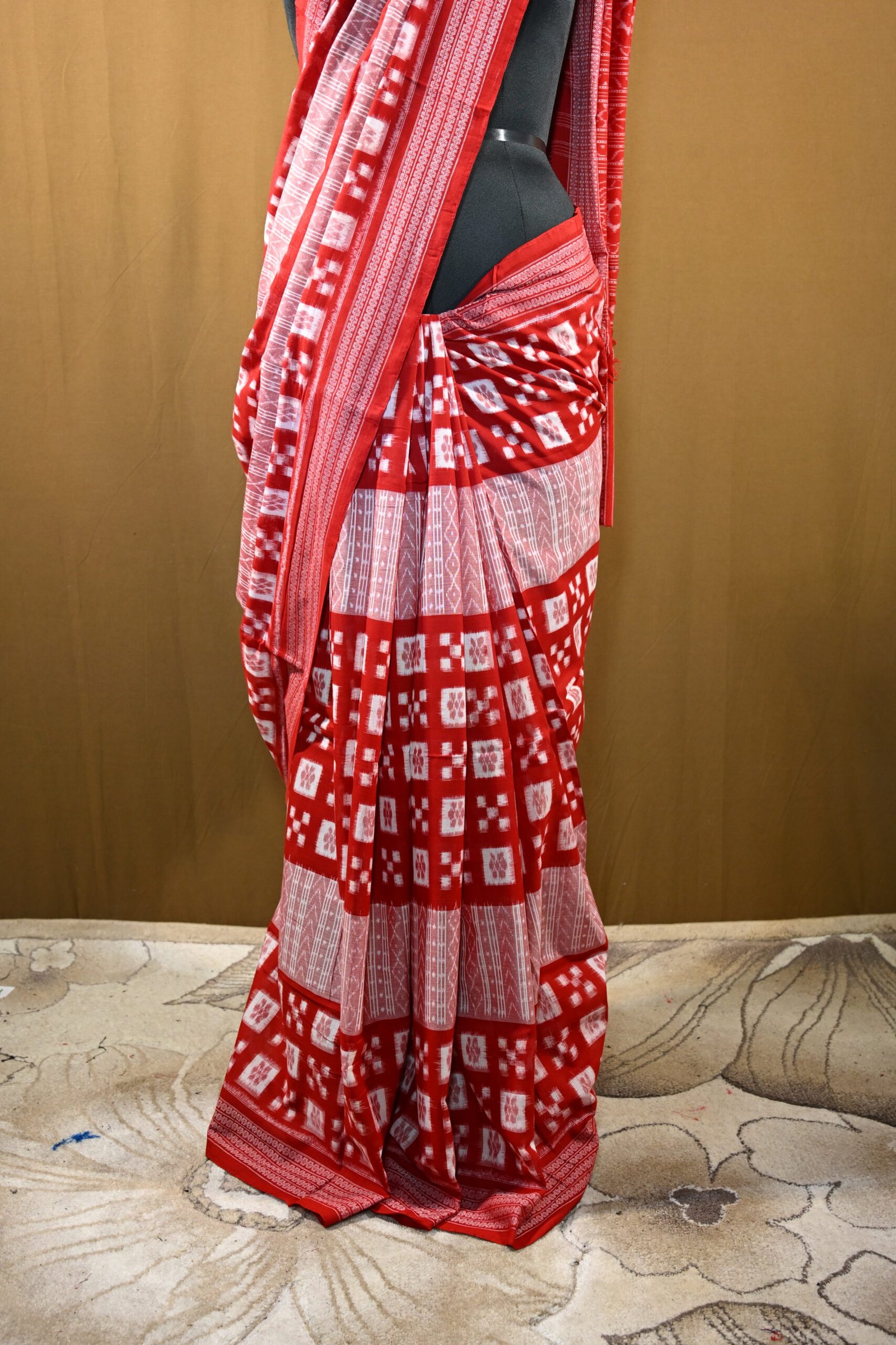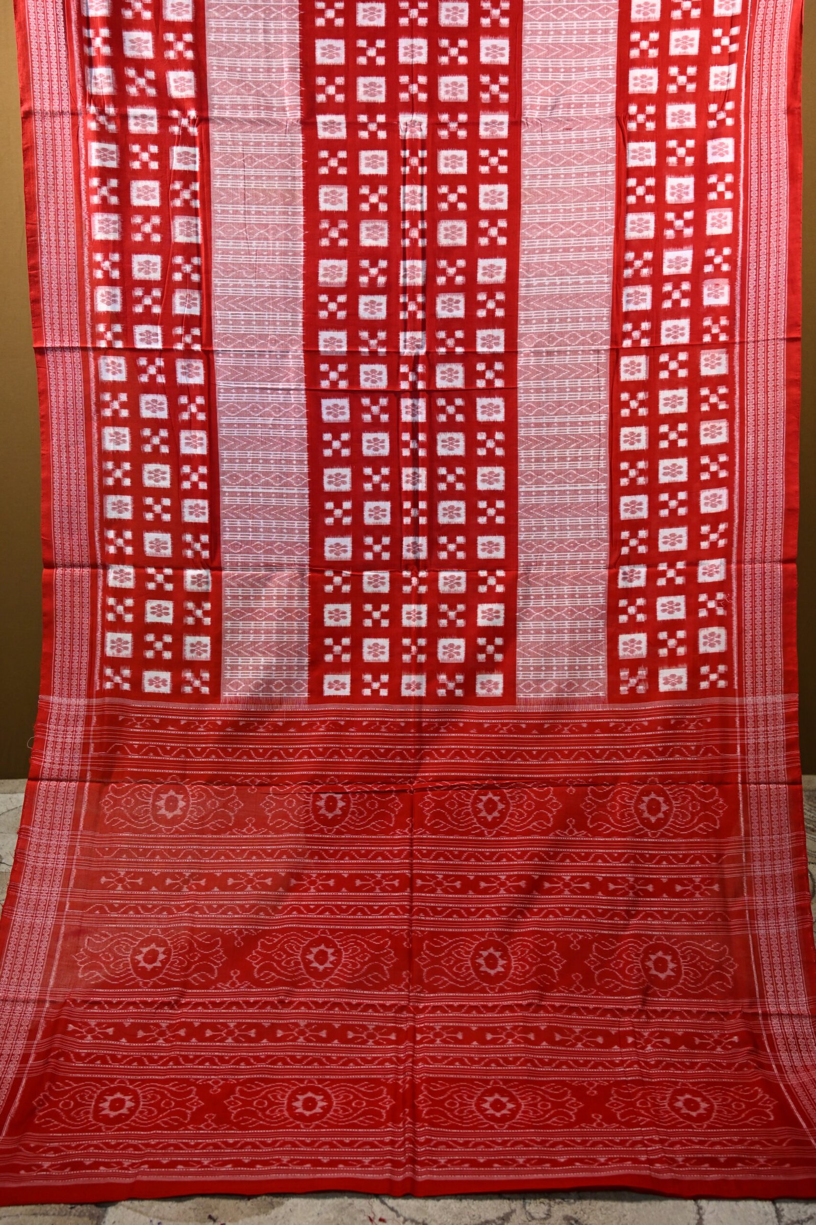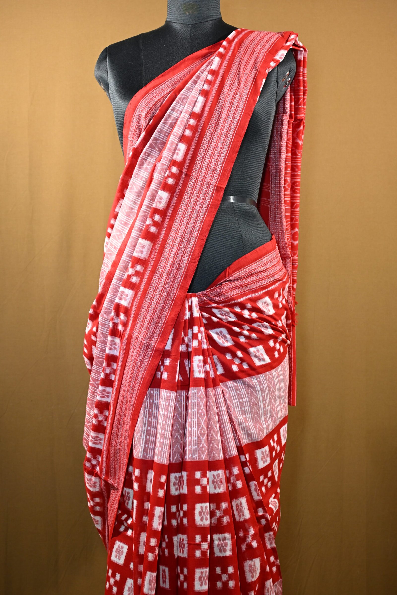 levate your ethnic wardrobe with this Pure Sambalpuri Handloom Saree in striking red and white hues. Crafted with traditional Ikat weaving techniques, this saree showcases intricate geometric patterns and fine craftsmanship from Odisha. Perfect for festive occasions and cultural events, it combines elegance with comfort in pure cotton fabric.