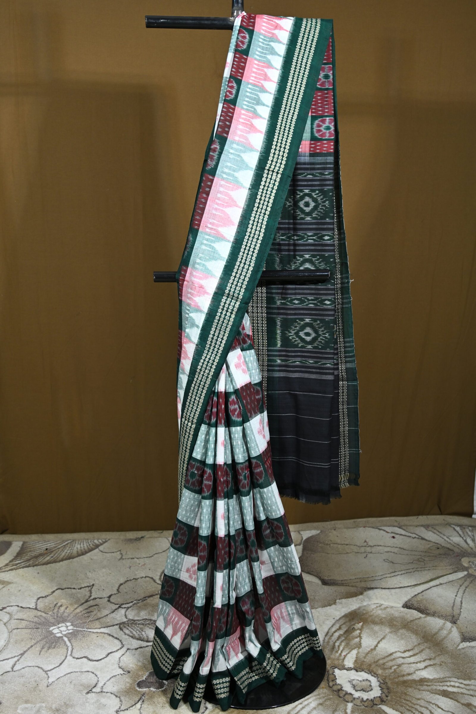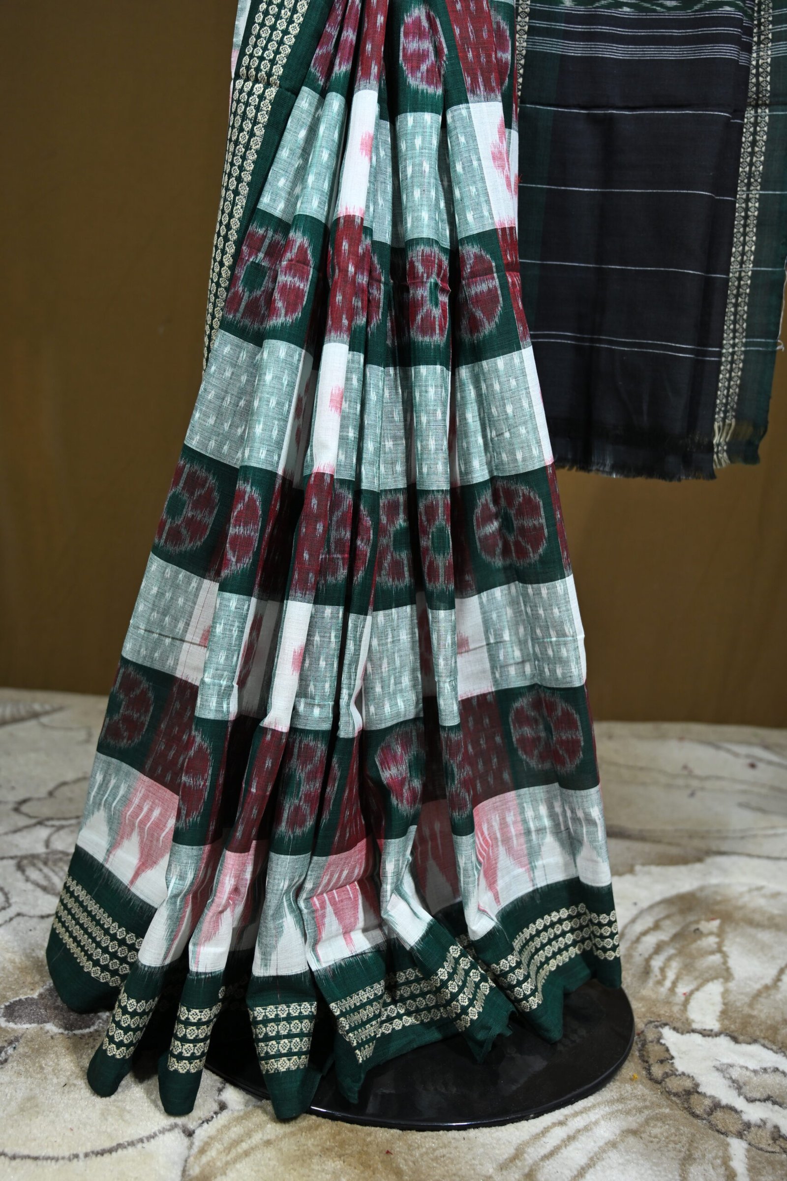 Pallu (end piece): Deep greenish-black base decorated with white and green diamond-shaped Ikat motifs, along with fine horizontal stripes in white.