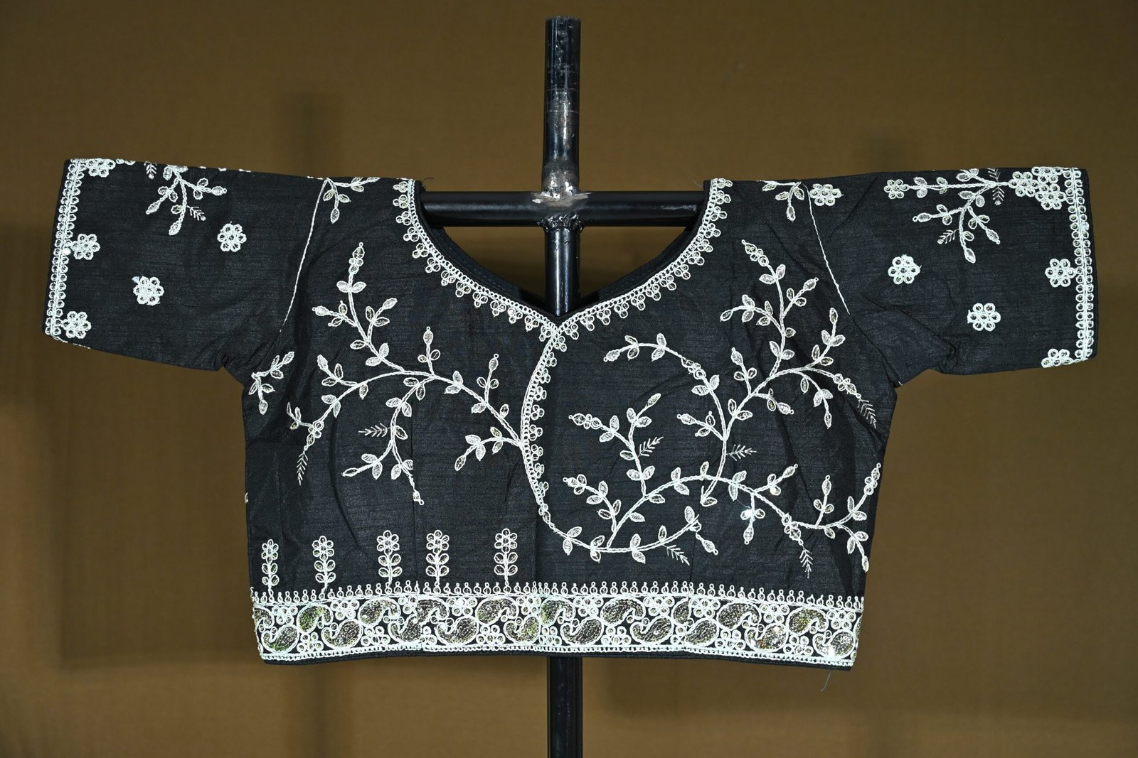Border: It features an ornate silver and white embroidered border, which adds richness and contrast to the dark fabric.
