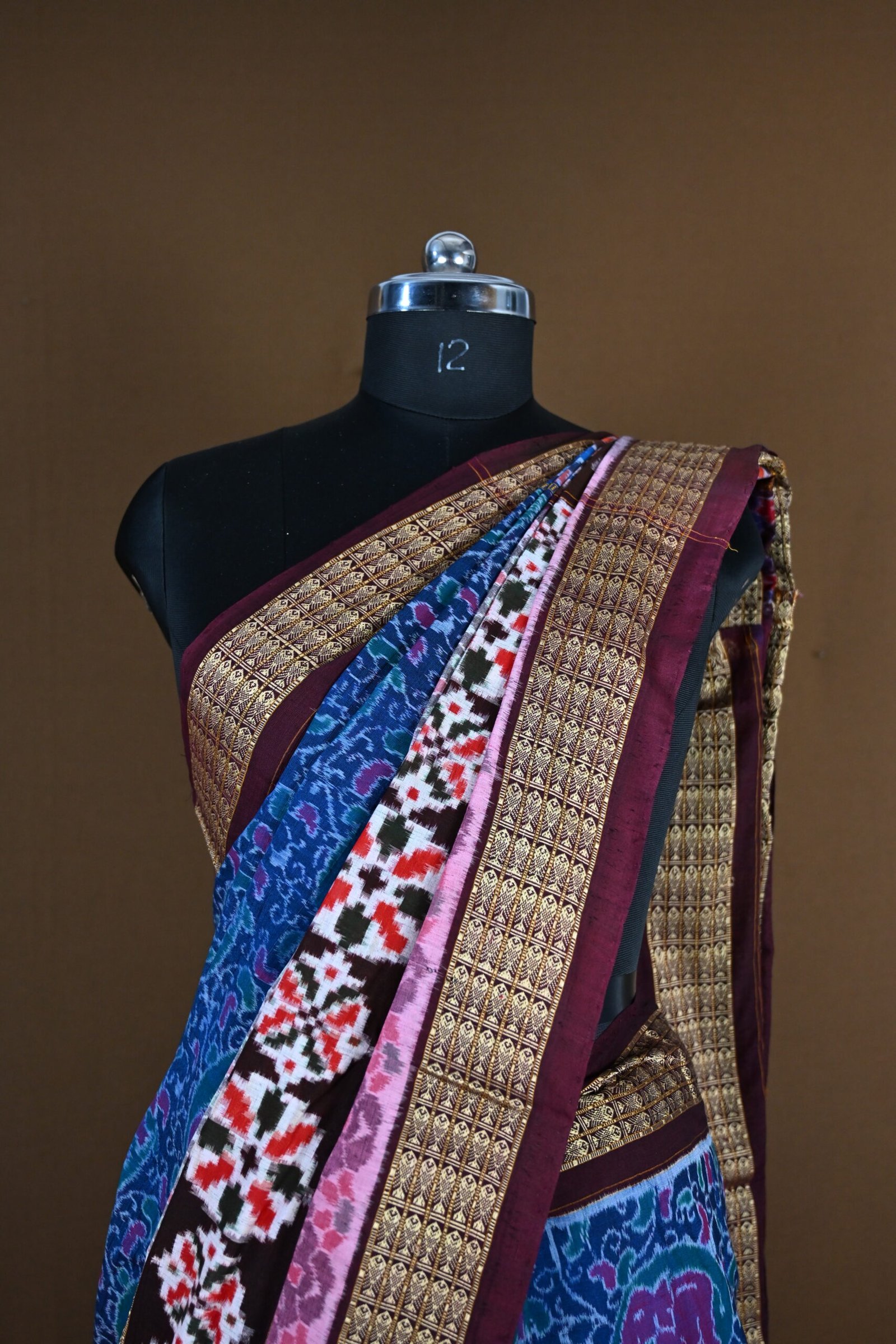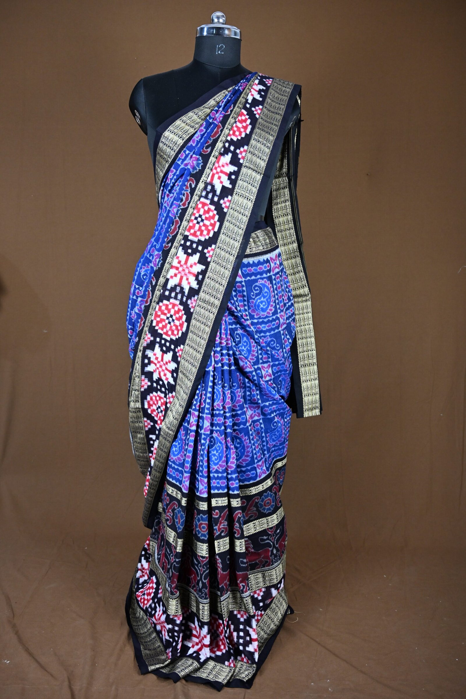 The saree has a striking combination of black, blue, gold, and bright accent colors with intricate detailing: