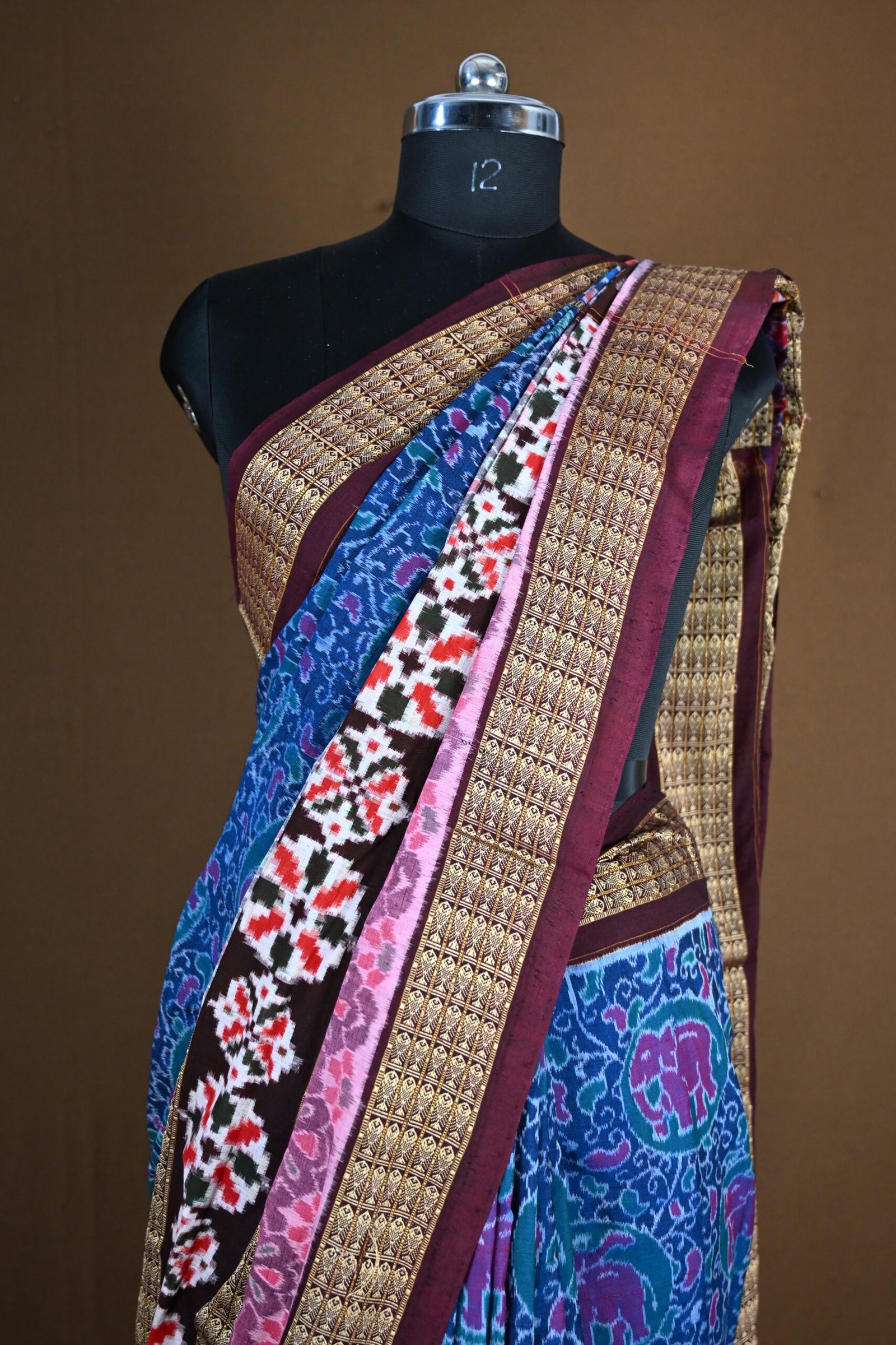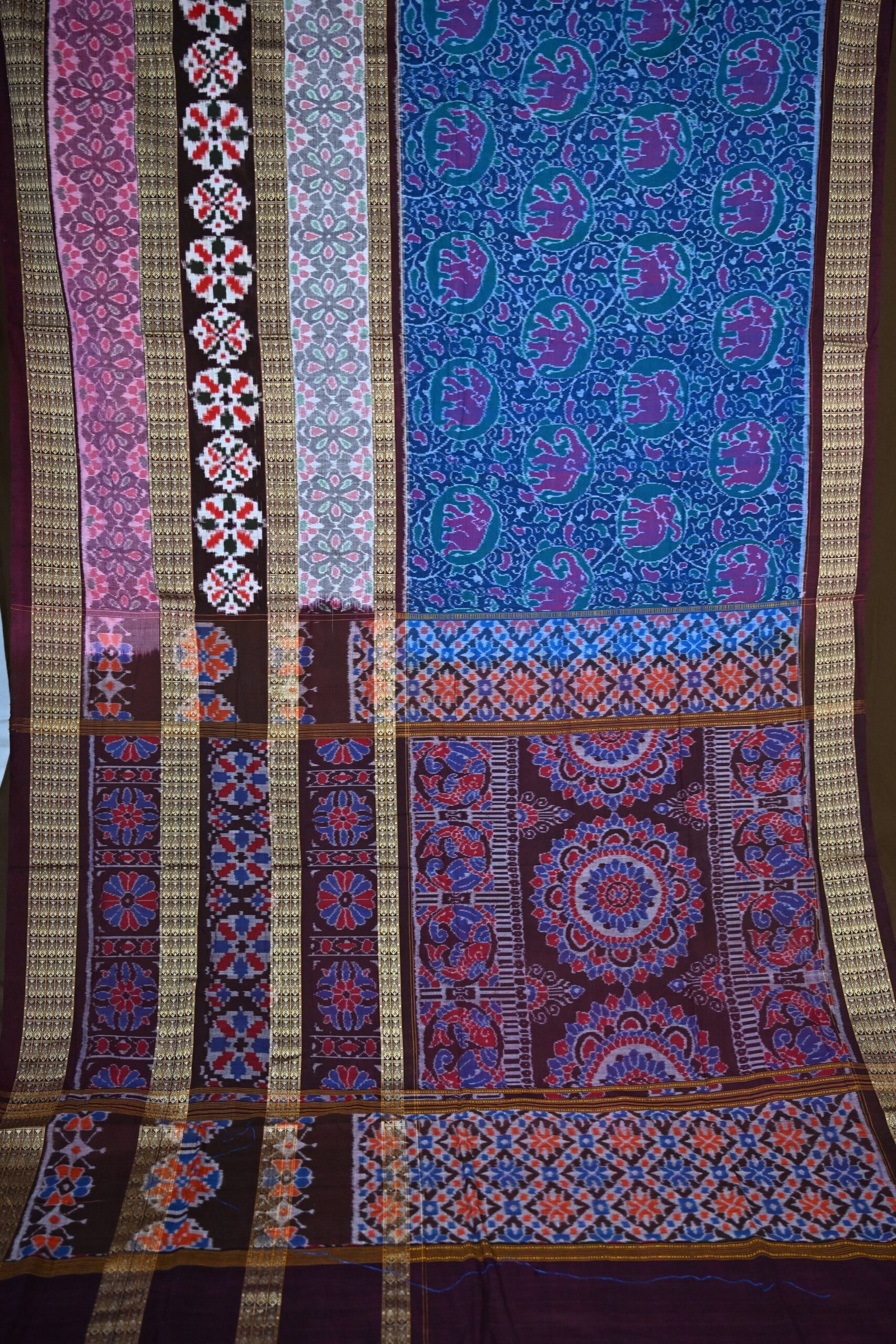 Lower Panels: Near the pleats and bottom section, the saree features bold black stripes with golden zari work and additional Ikat motifs, creating an ornamental finish.