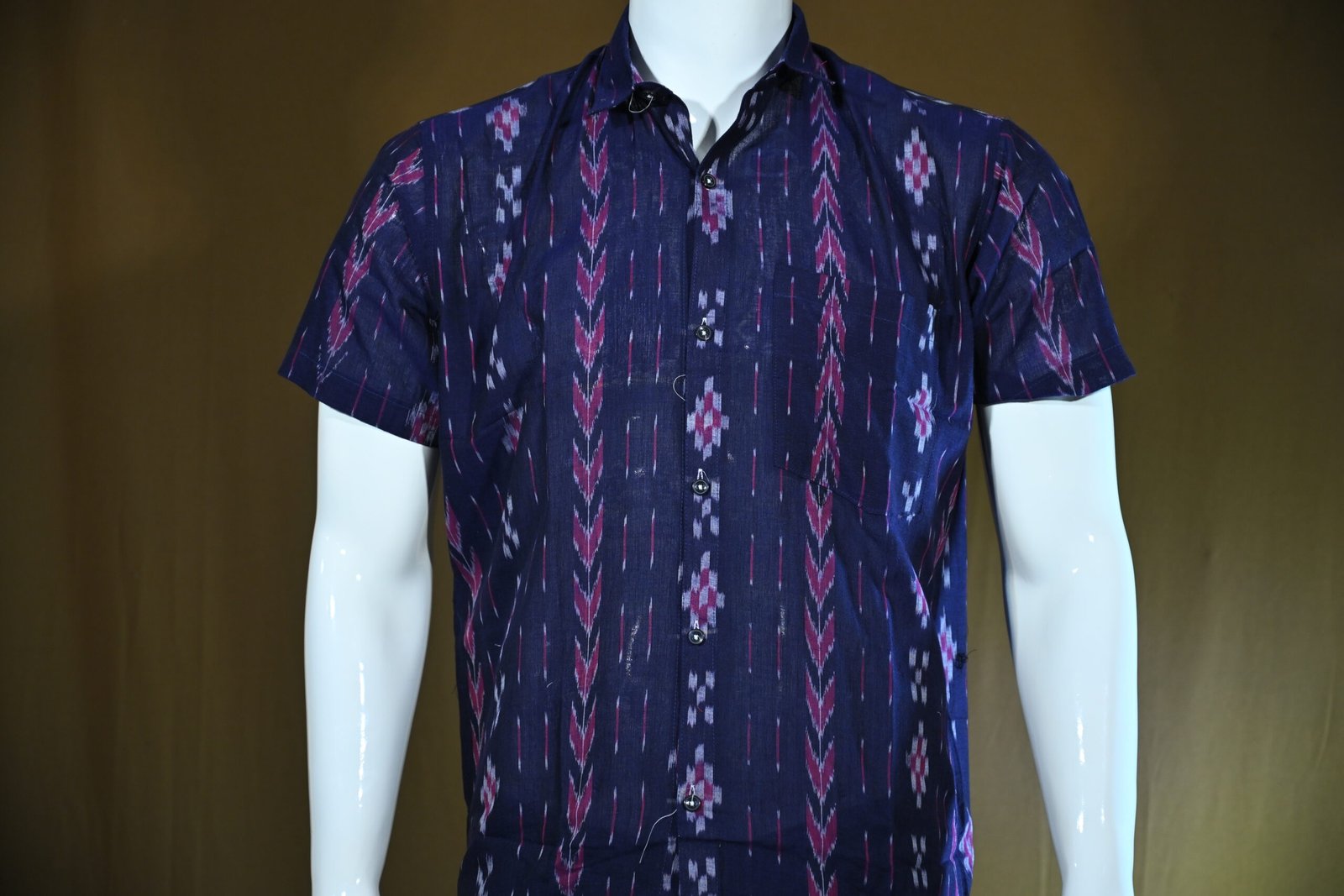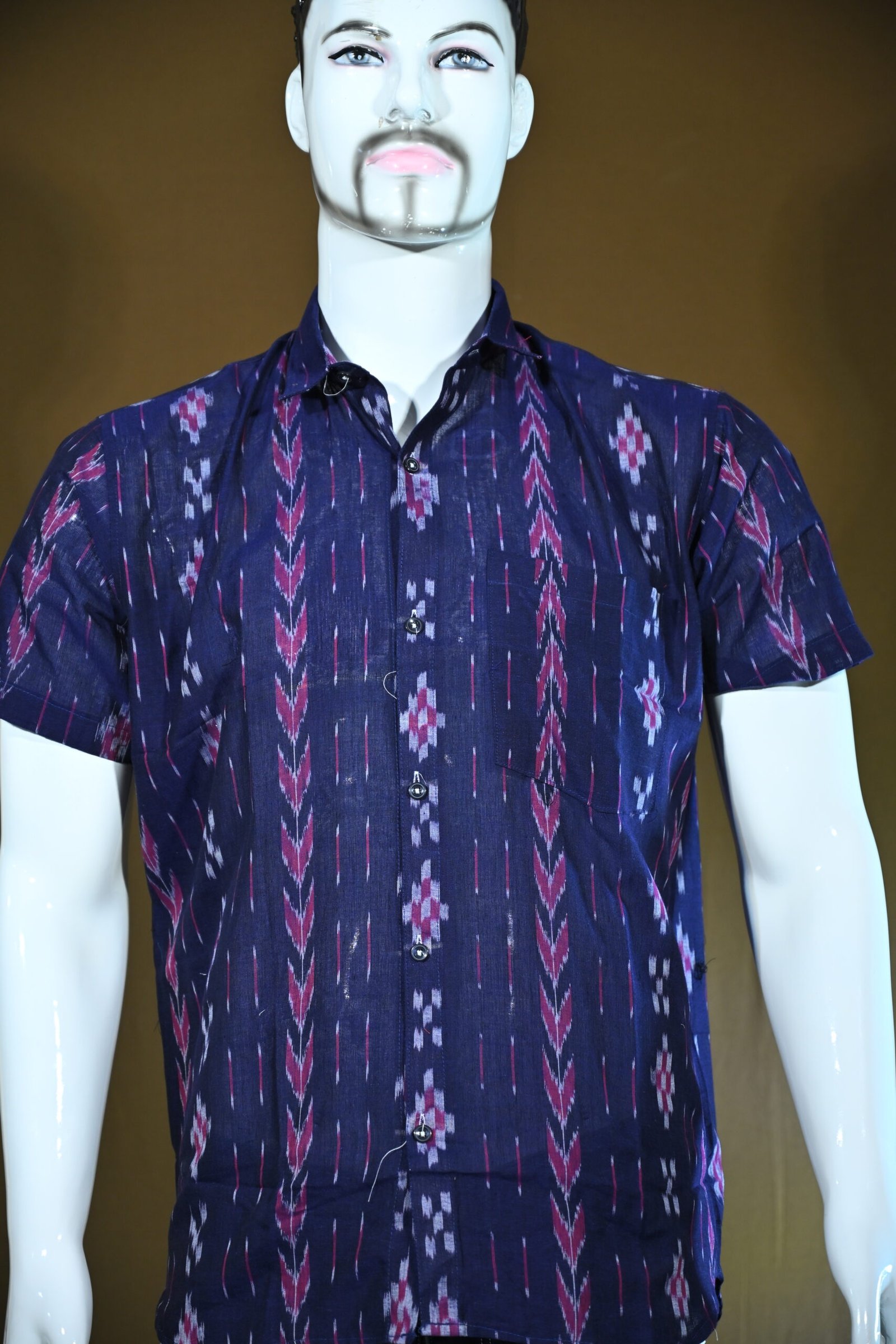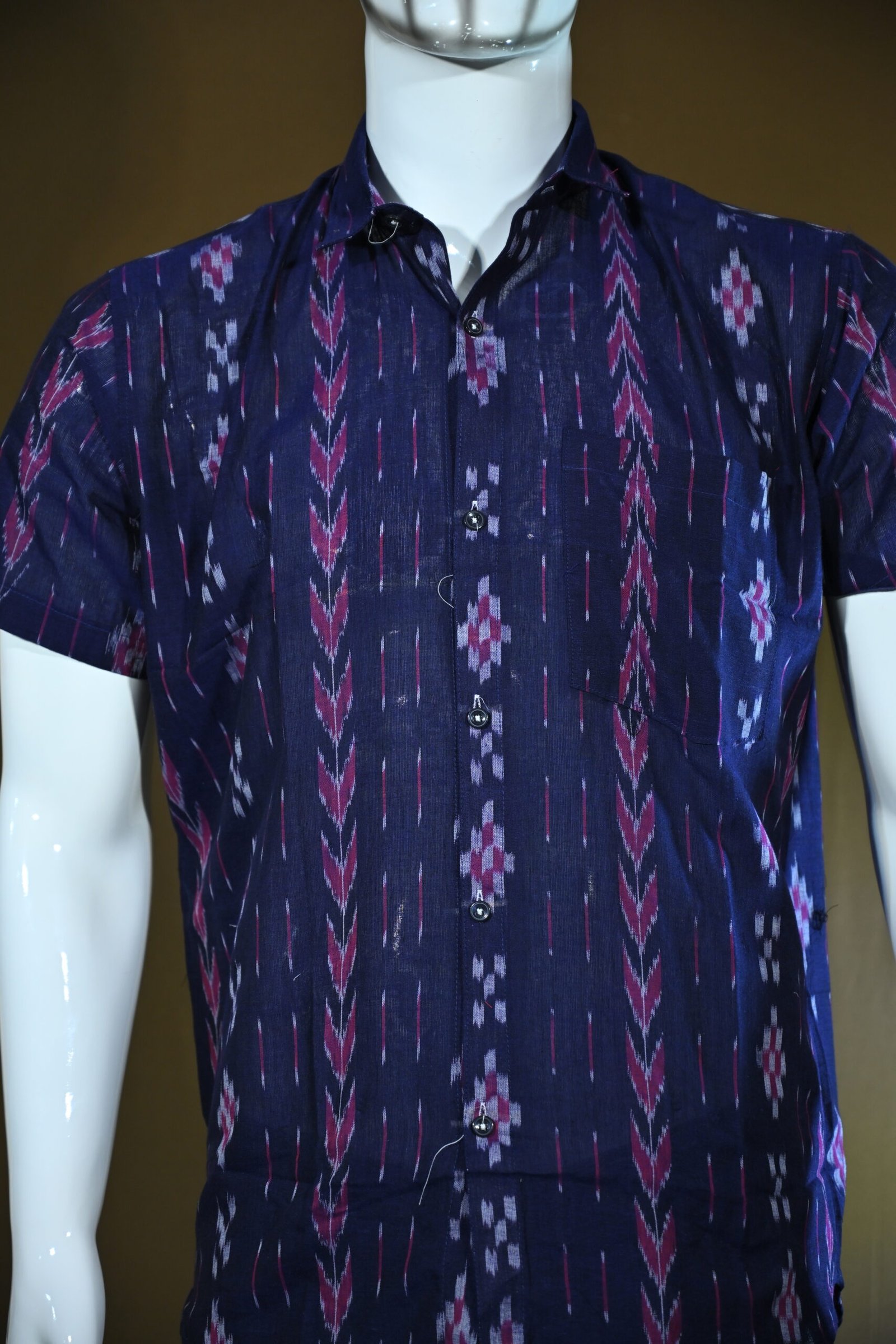 A navy blue short-sleeve shirt featuring traditional ikat motifs in pink and white, arranged in vertical stripes. Made from breathable cotton, it includes a button-down front with black buttons and a single chest pocket, perfect for casual or ethnic wear.