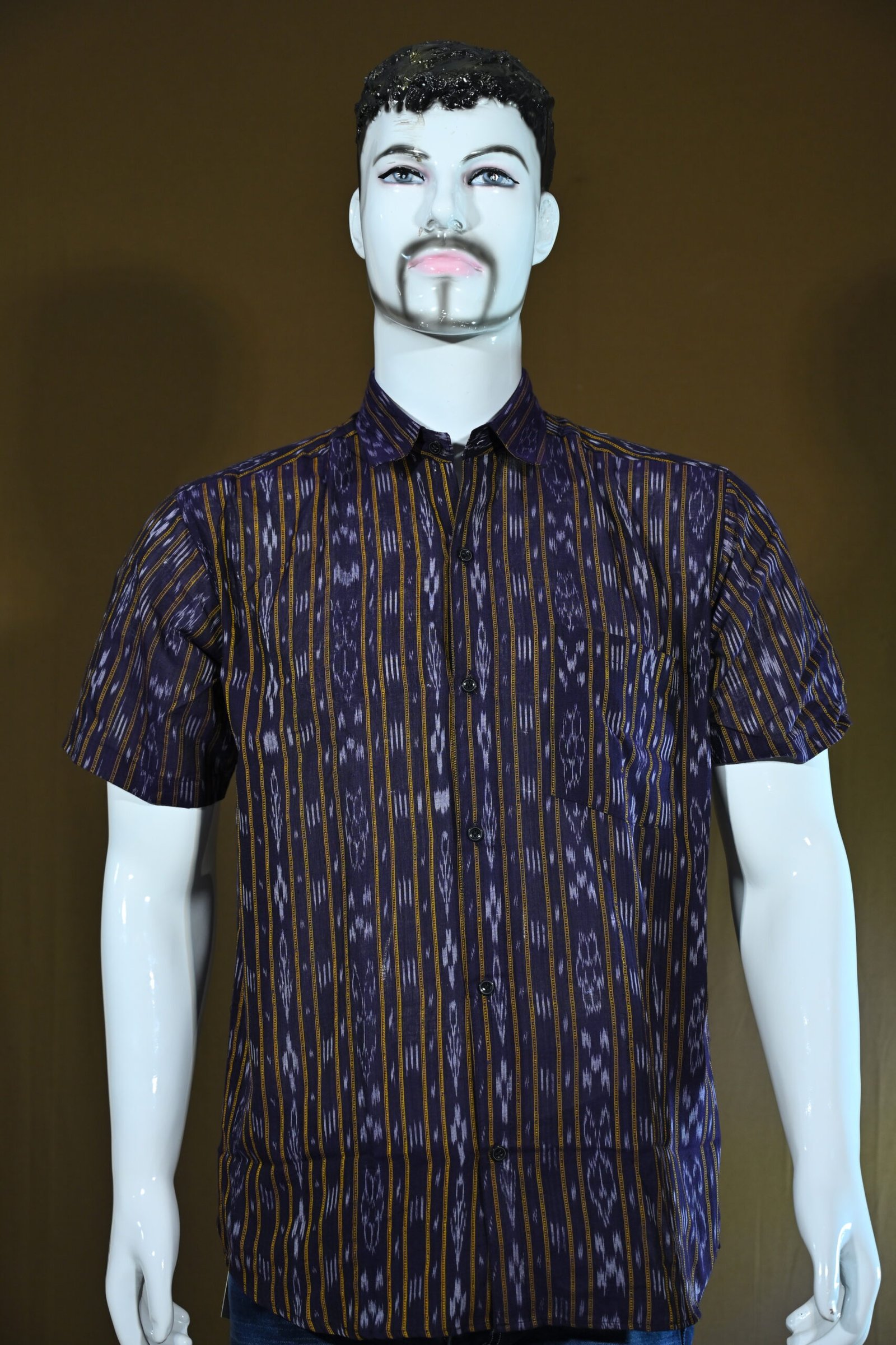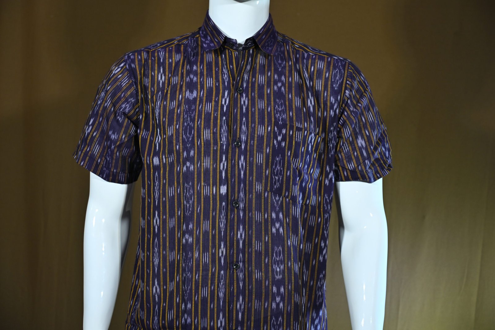 Men’s Short-Sleeve Ikat Cotton Shirt – Dark Purple with Mustard Stripes